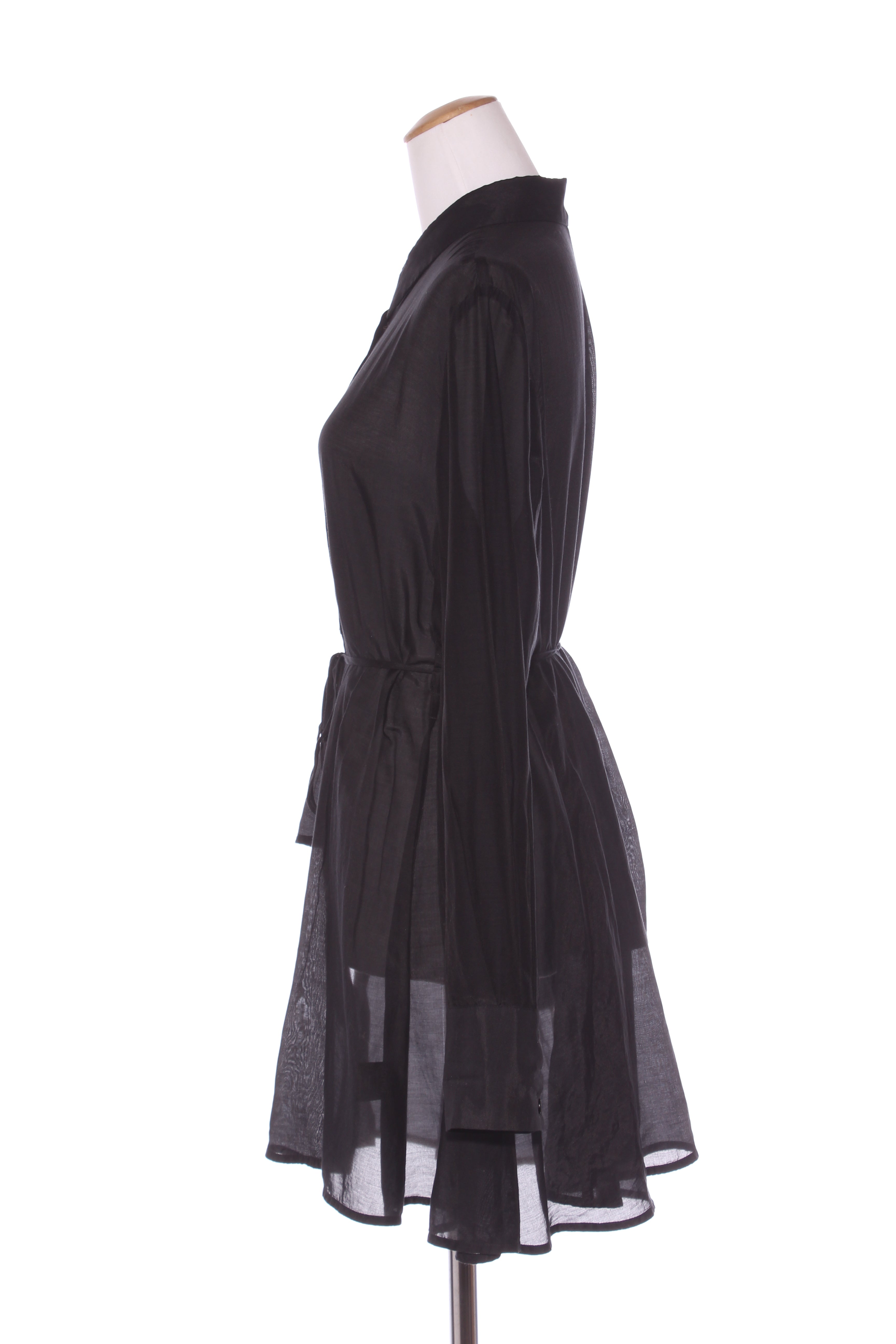 SIZE ON TAG: XLFITS LIKE: 16COLOUR: BlackFABRIC: 70% cotton, 30% silkCONDITION: Excellent prelovedMEASUREMENTS:BUST: 61cms WAIST: 84cms LENGTH: 61-86cms NOTES: Button up front and sleeve ends. Belt...