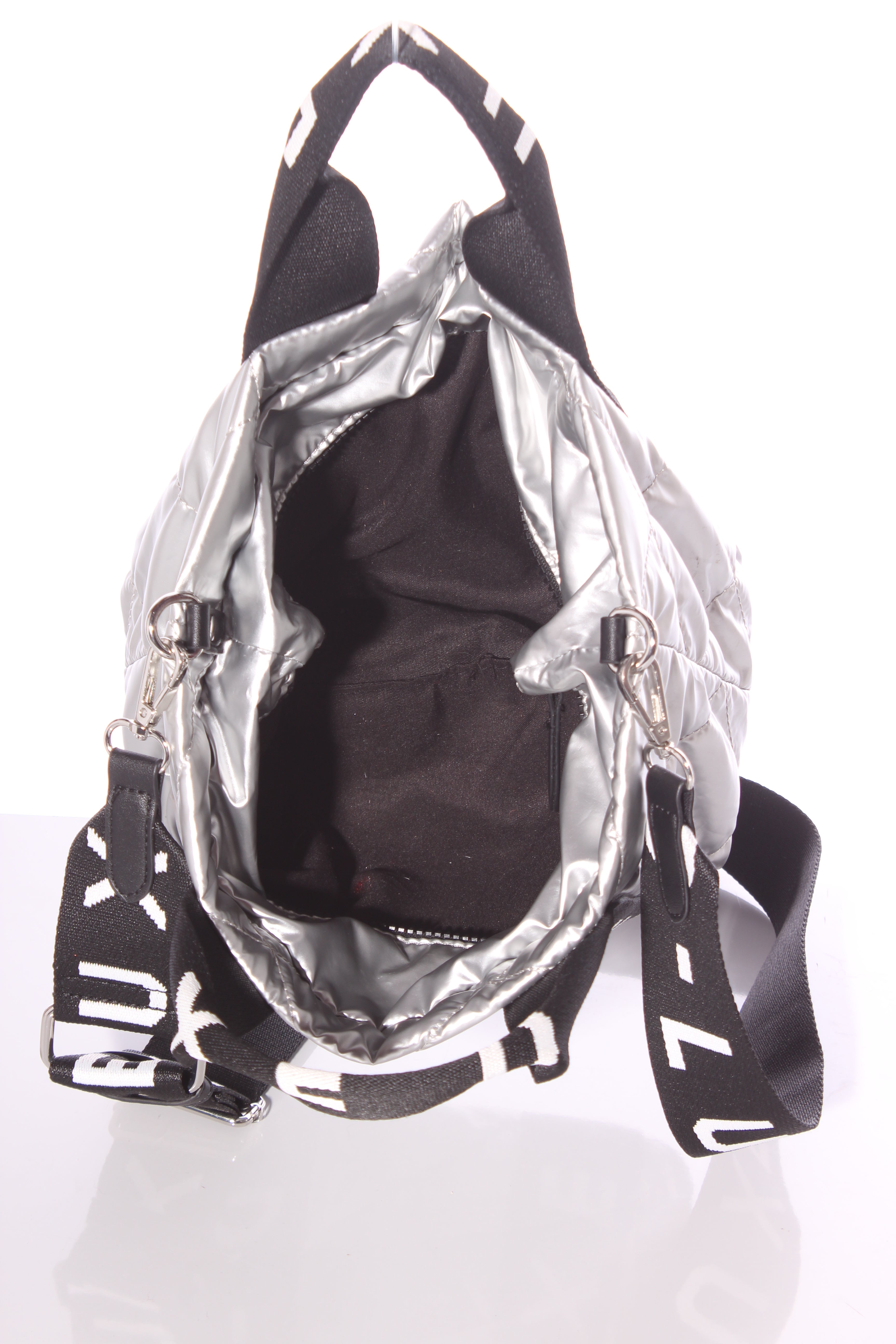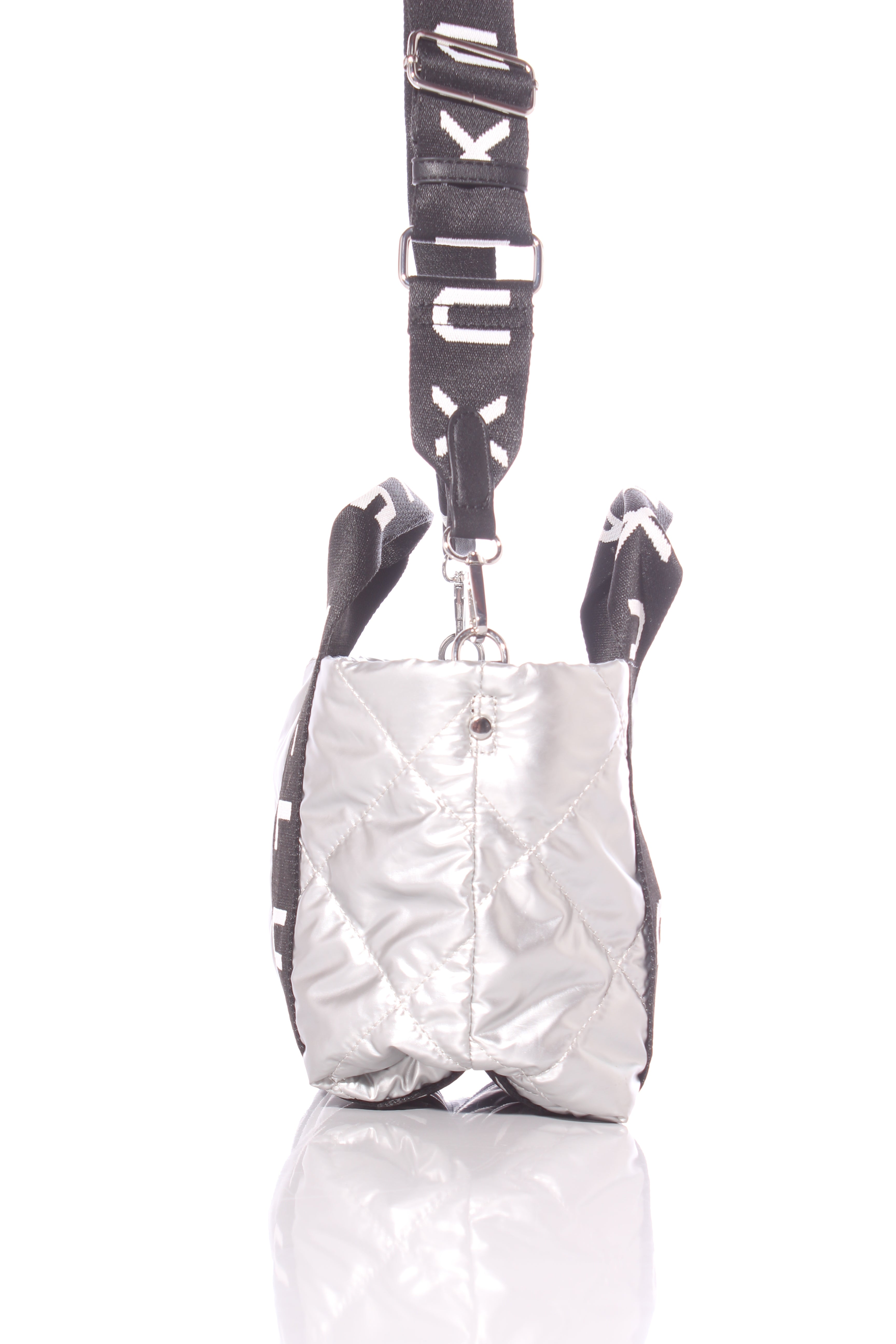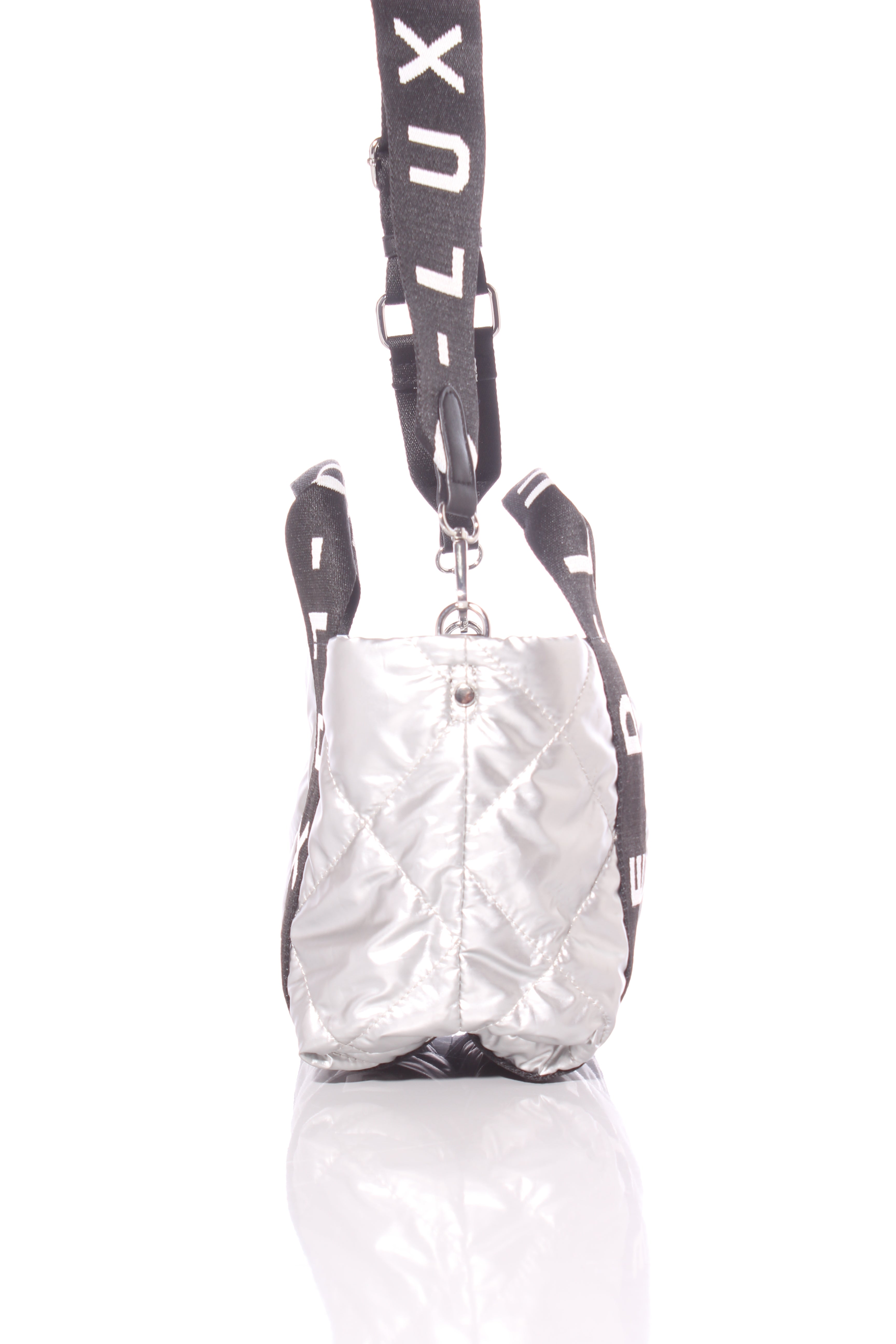 COLOUR: Silver, black, whiteFABRIC: Not stated, syntheticCONDITION: Like newMEASUREMENTS:HEIGHT: 18cms WIDTH: 23-34cms DEPTH: 15cms STRAP: 70-100cms NOTES: Zip access to main compartment. Adjustable removable...