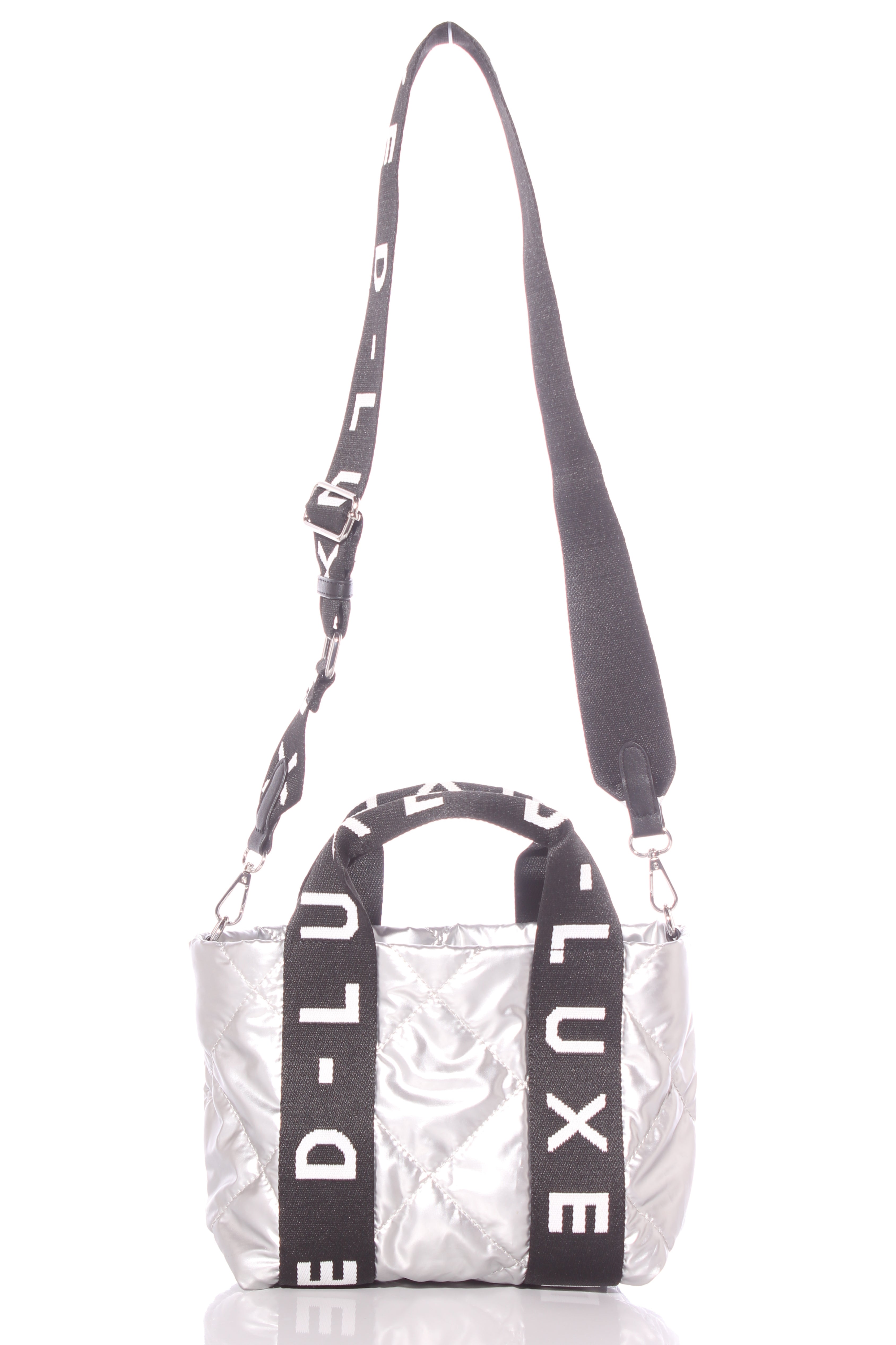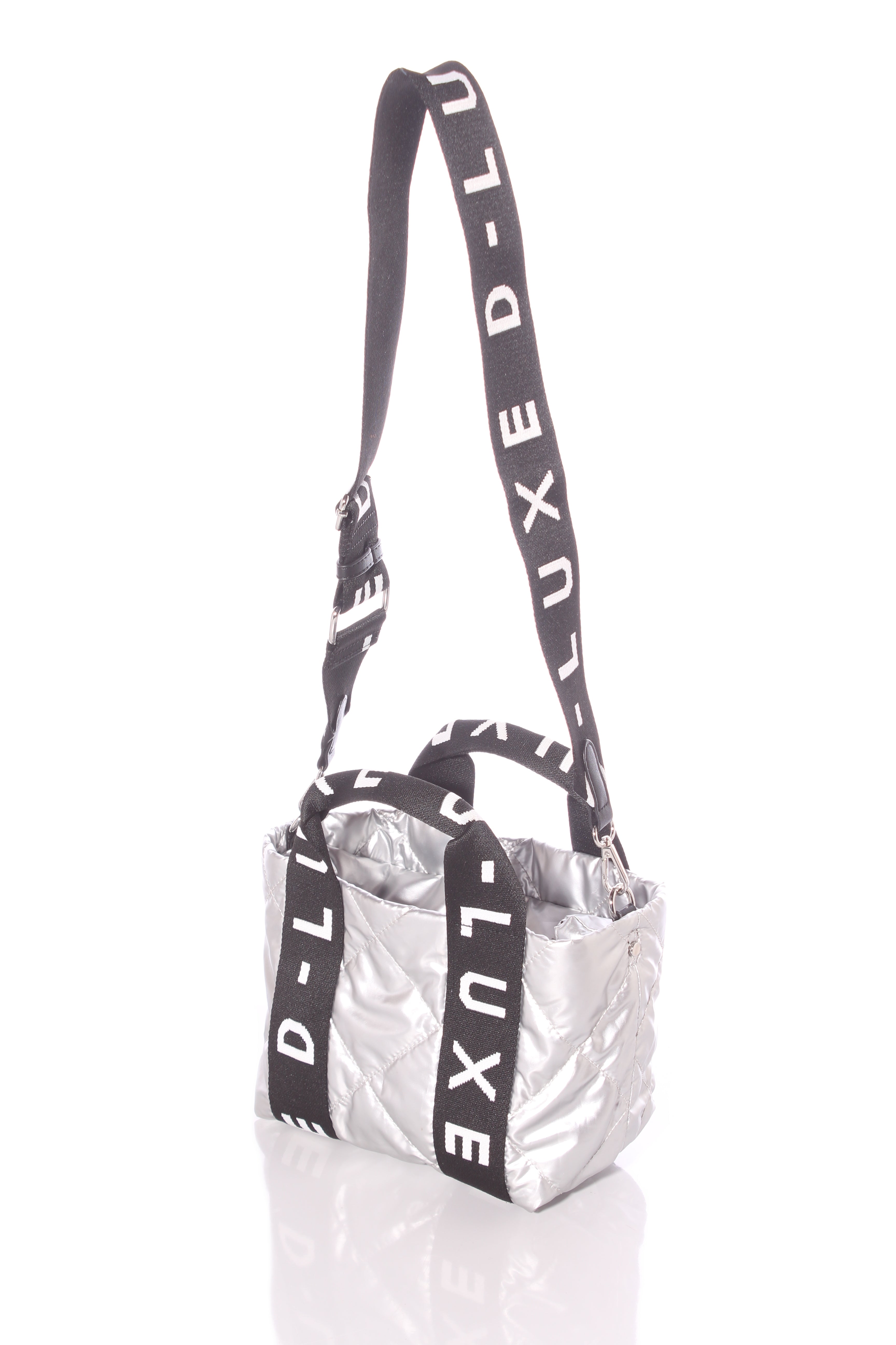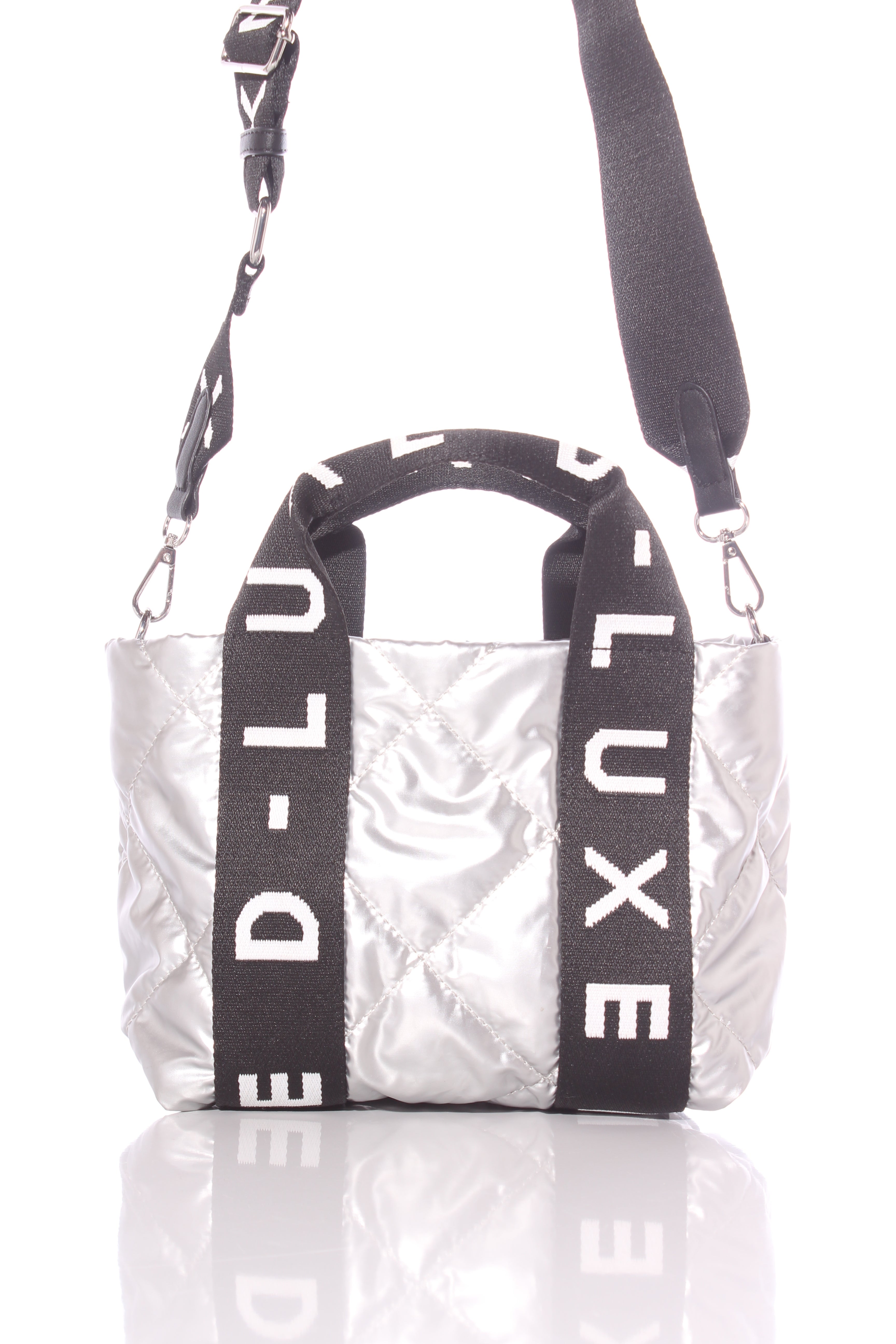 COLOUR: Silver, black, whiteFABRIC: Not stated, syntheticCONDITION: Like newMEASUREMENTS:HEIGHT: 18cms WIDTH: 23-34cms DEPTH: 15cms STRAP: 70-100cms NOTES: Zip access to main compartment. Adjustable removable...