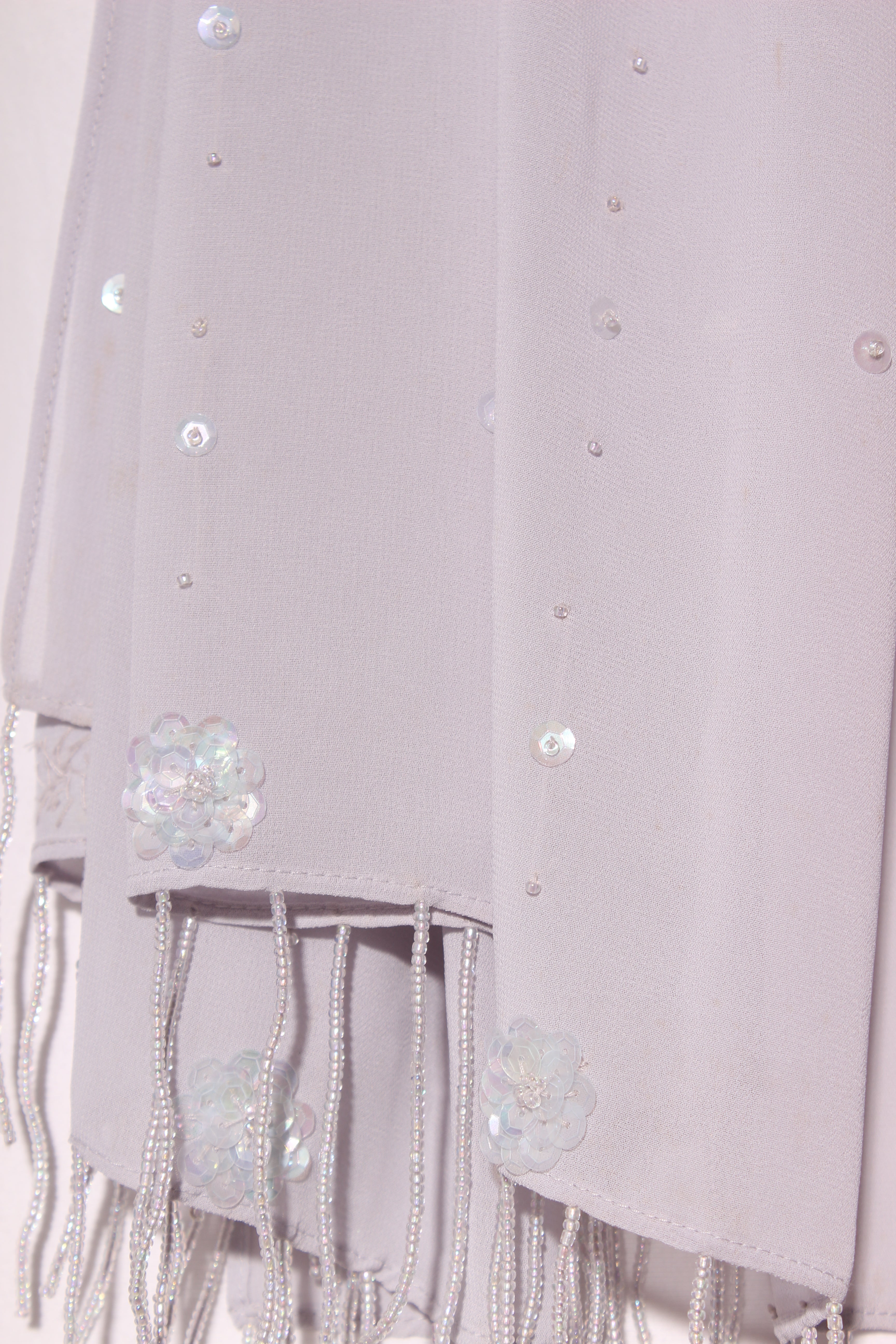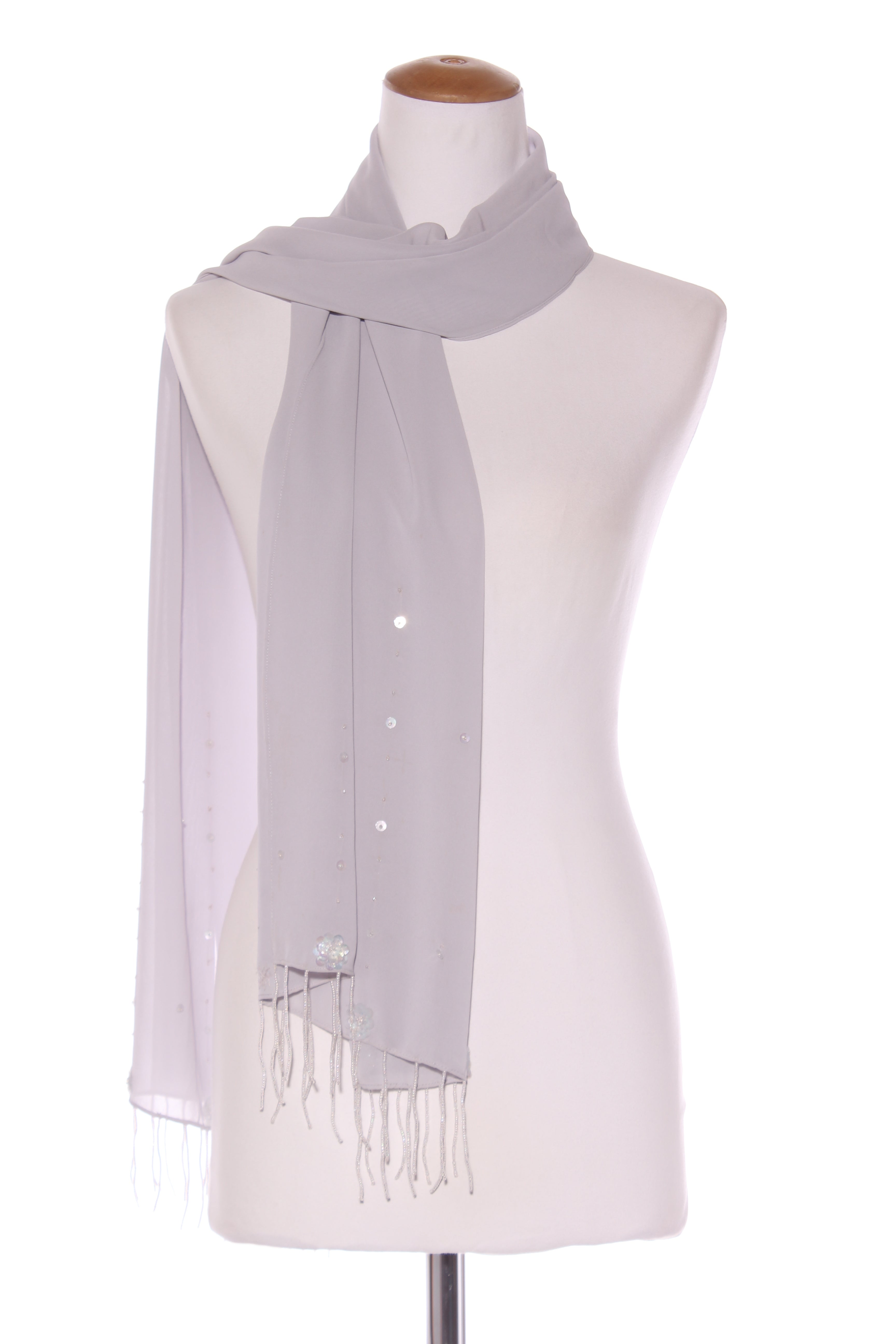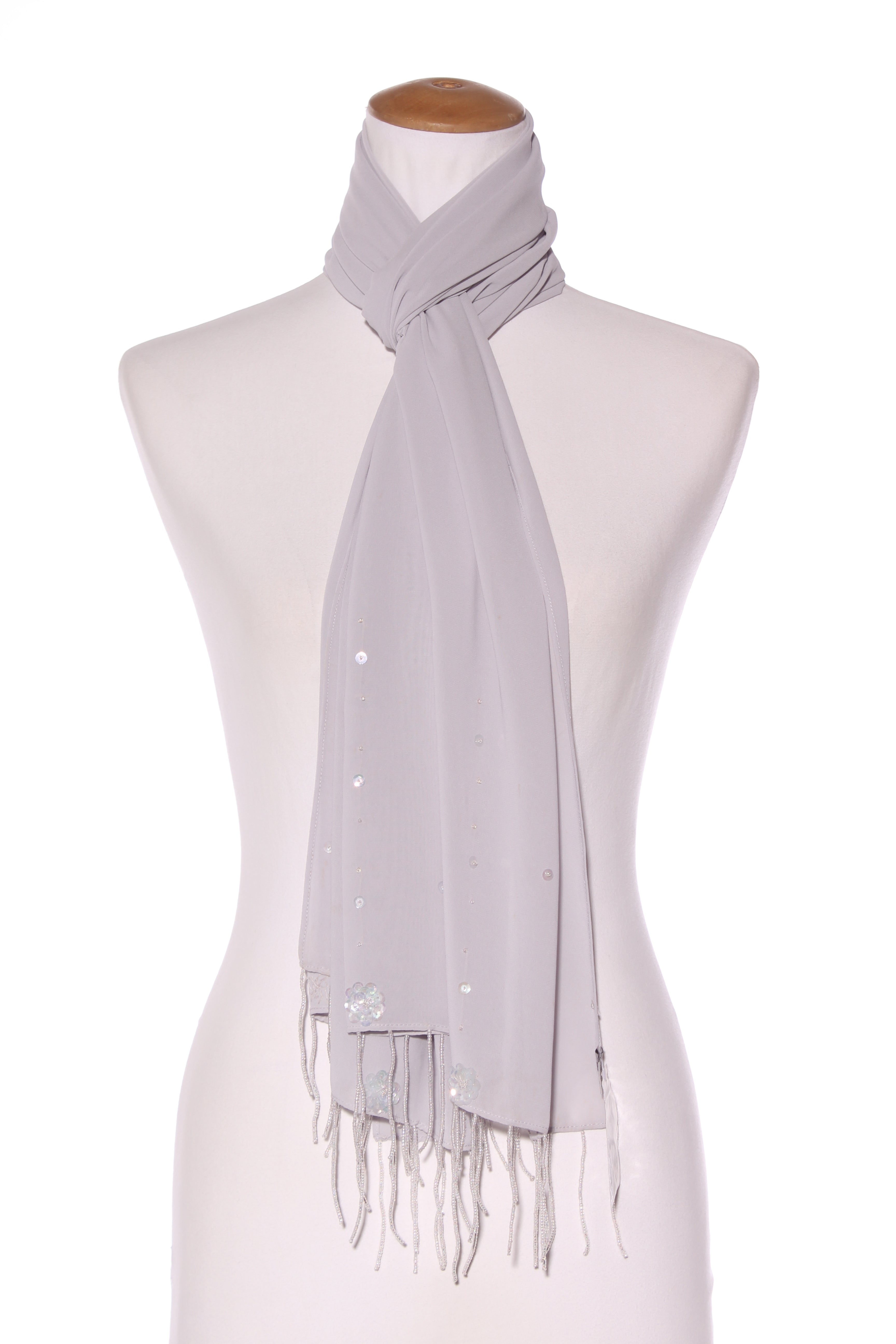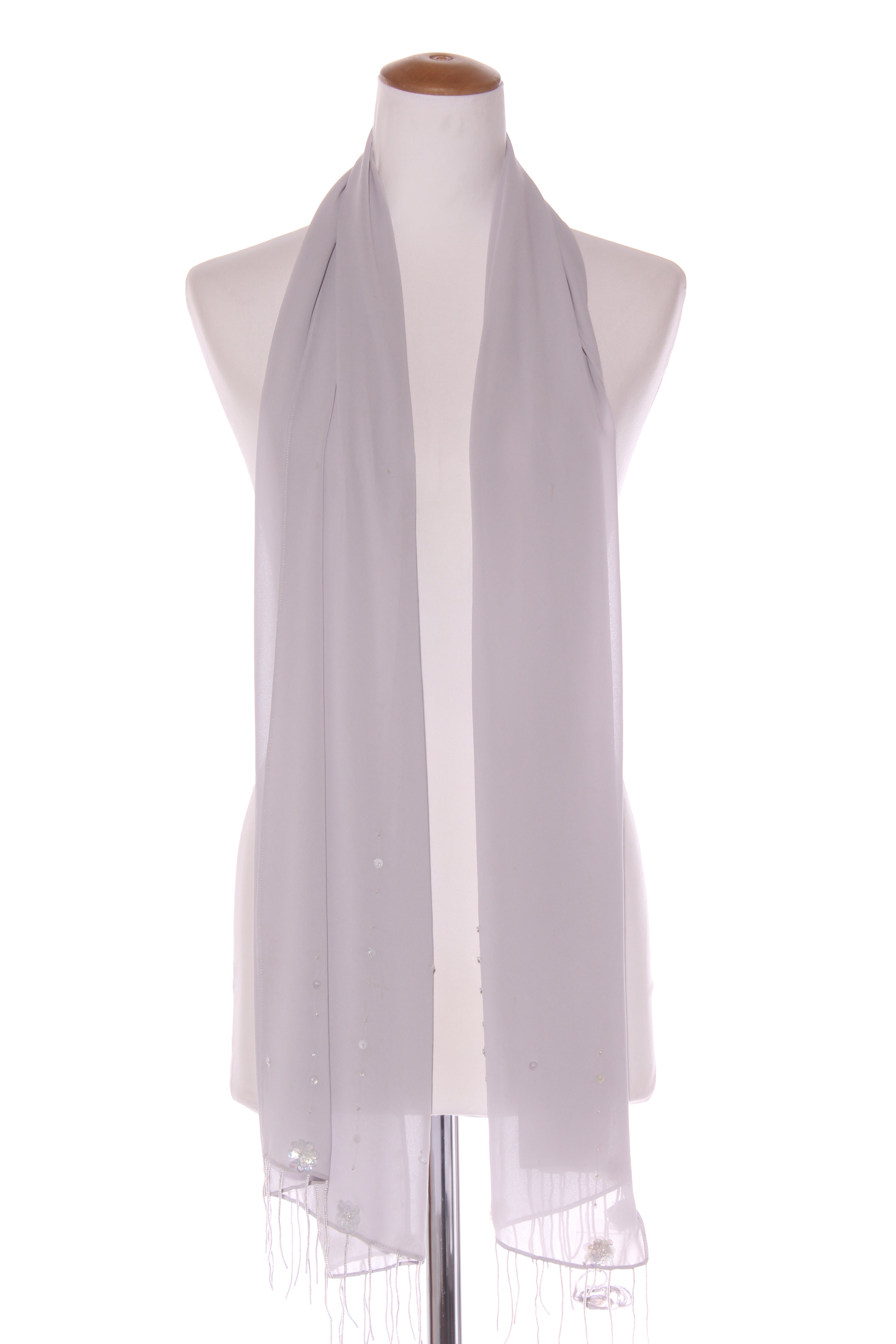 SALE ITEM - [NOT ELIGIBLE FOR RETURN] - Was $18COLOUR: GreyFABRIC: PolyesterCONDITION: Excellent prelovedMEASUREMENTS:WIDTH: 48cms LENGTH: 180cmsNOTES: 8cm beaded tassel ends.