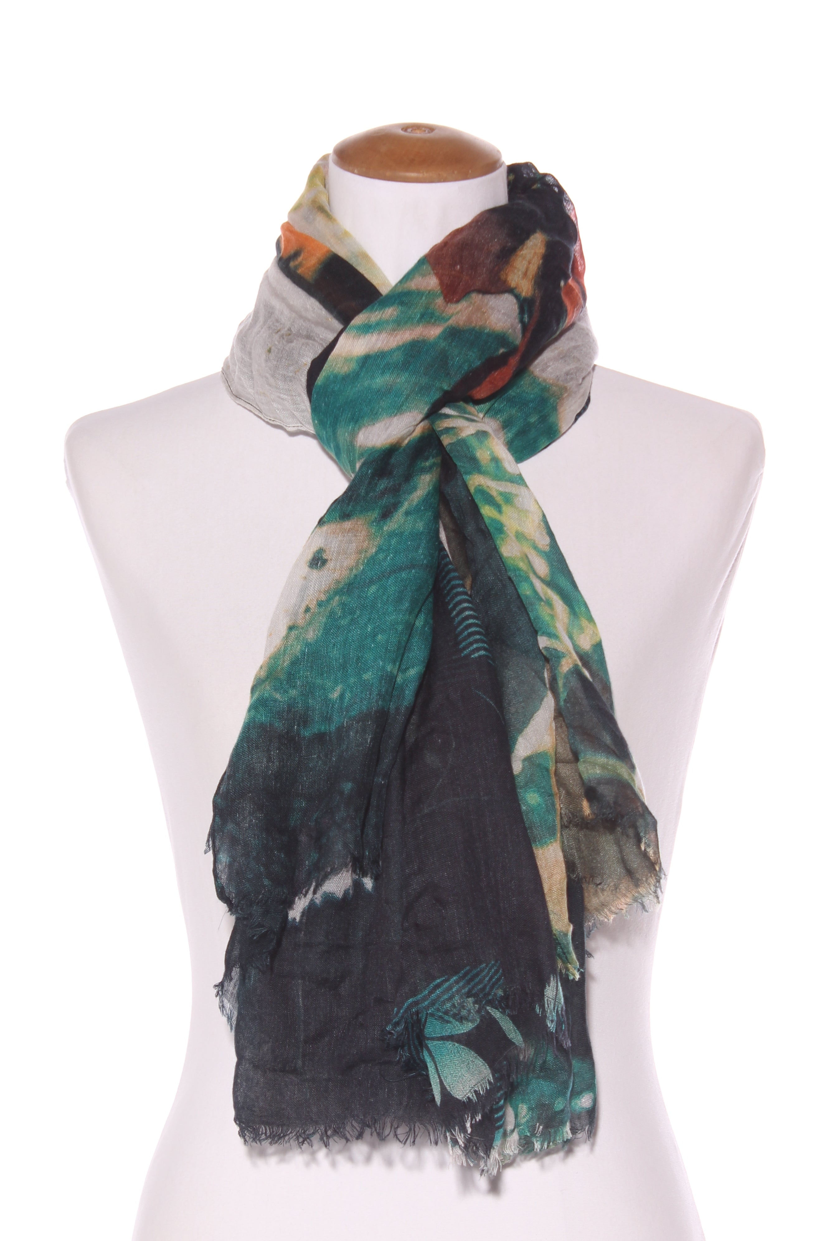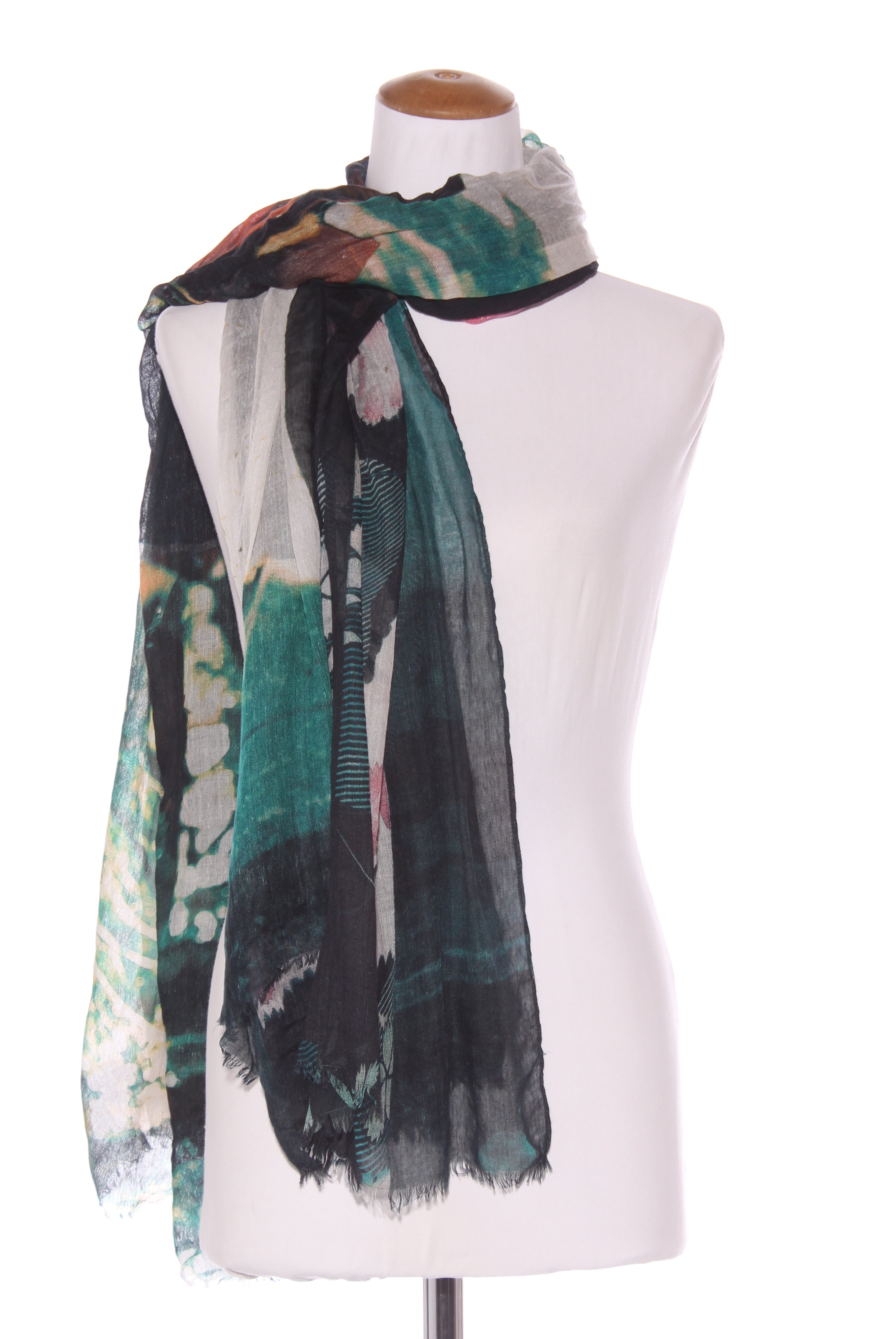 SALE ITEM - [NOT ELIGIBLE FOR RETURN] - Was $50COLOUR: Green, beige, goldFABRIC: Tag removed, silkCONDITION: Excellent prelovedMEASUREMENTS:WIDTH: 107cms LENGTH: 200cmsNOTES: 7cm tasseled ends.