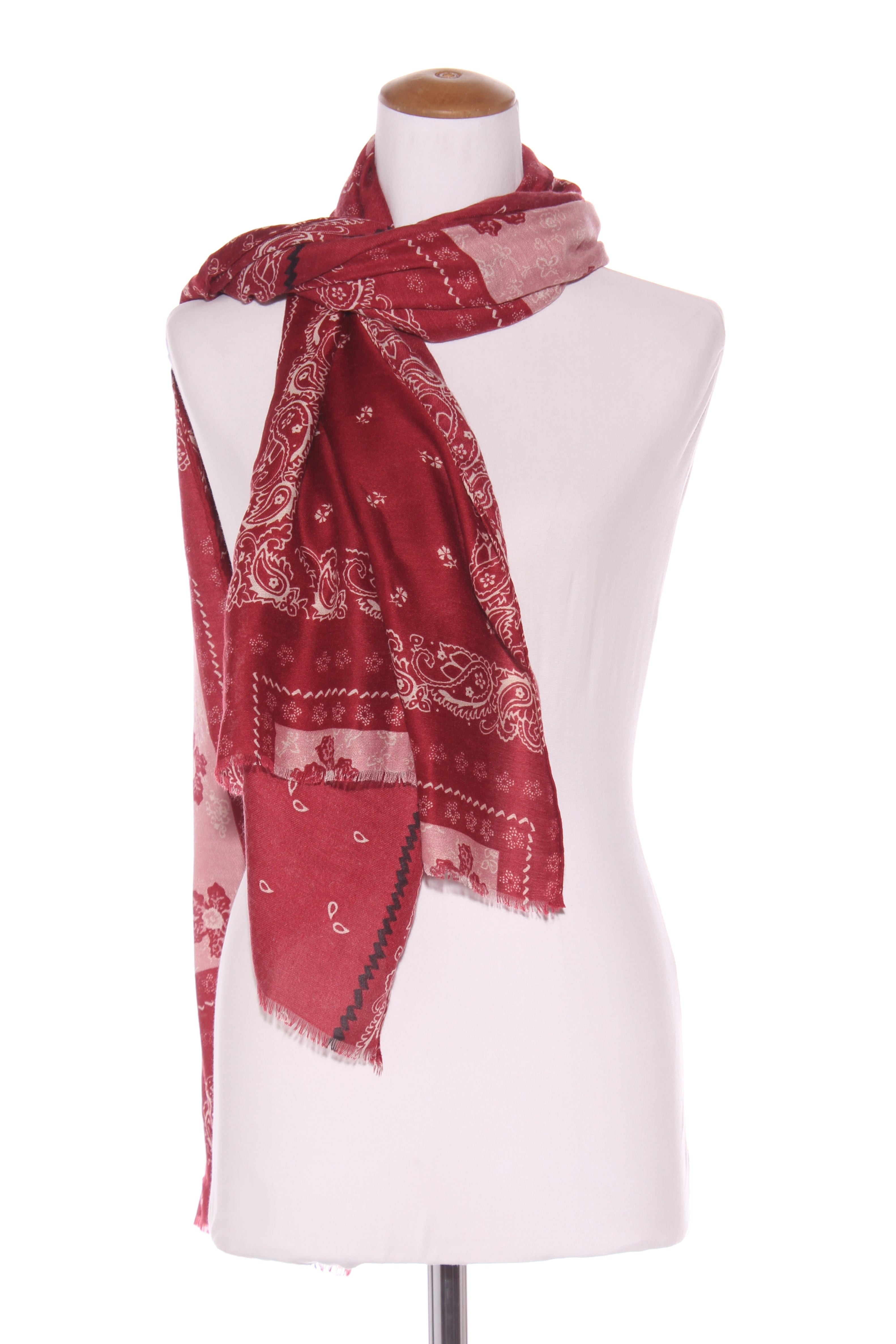 COLOUR: Red, white, pink, blackFABRIC: Polyester - has a cashmere feel to itCONDITION: Excellent prelovedMEASUREMENTS:LENGTH: 172cms WIDTH: 85cmsNOTES: Frill ends. Designed in France
