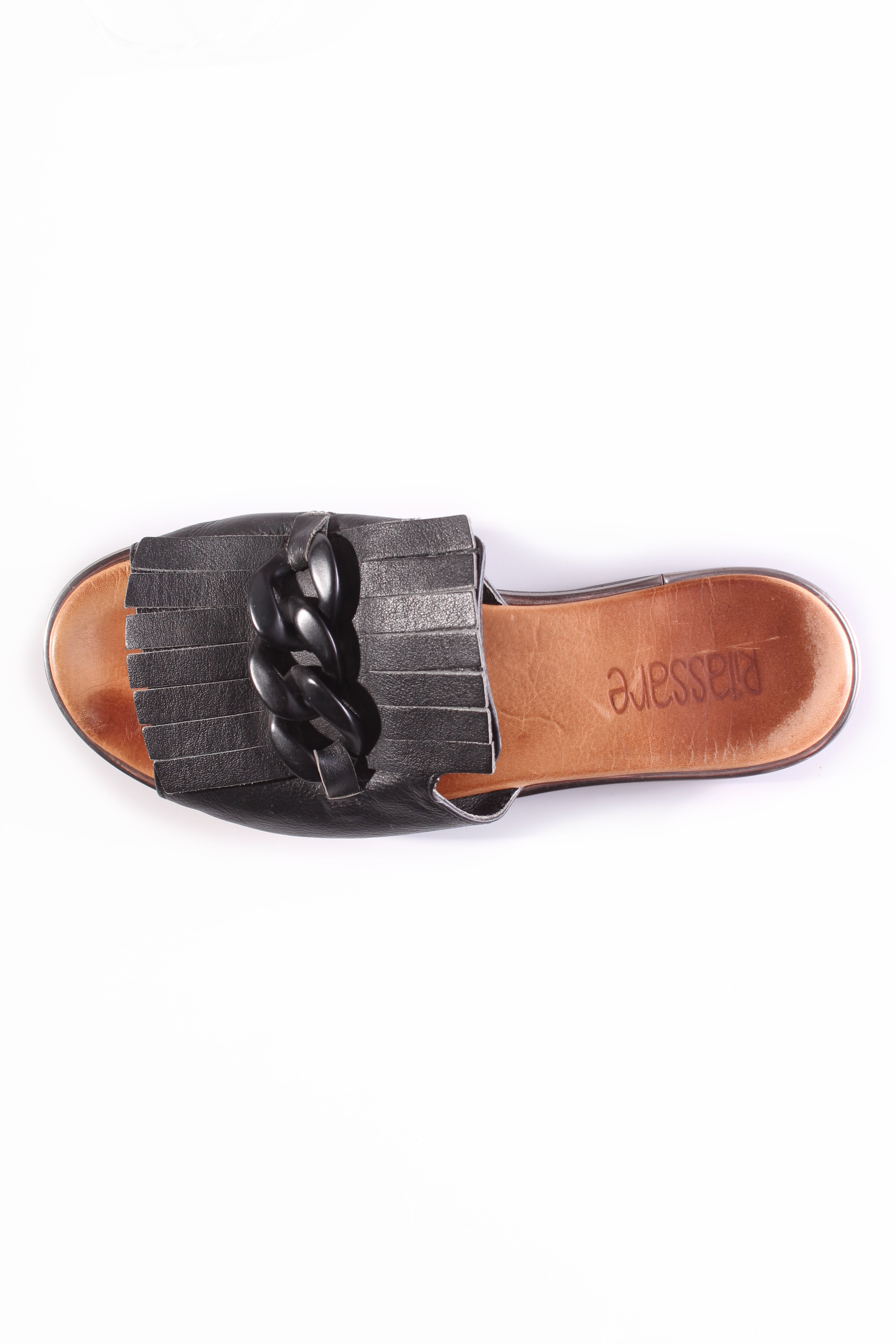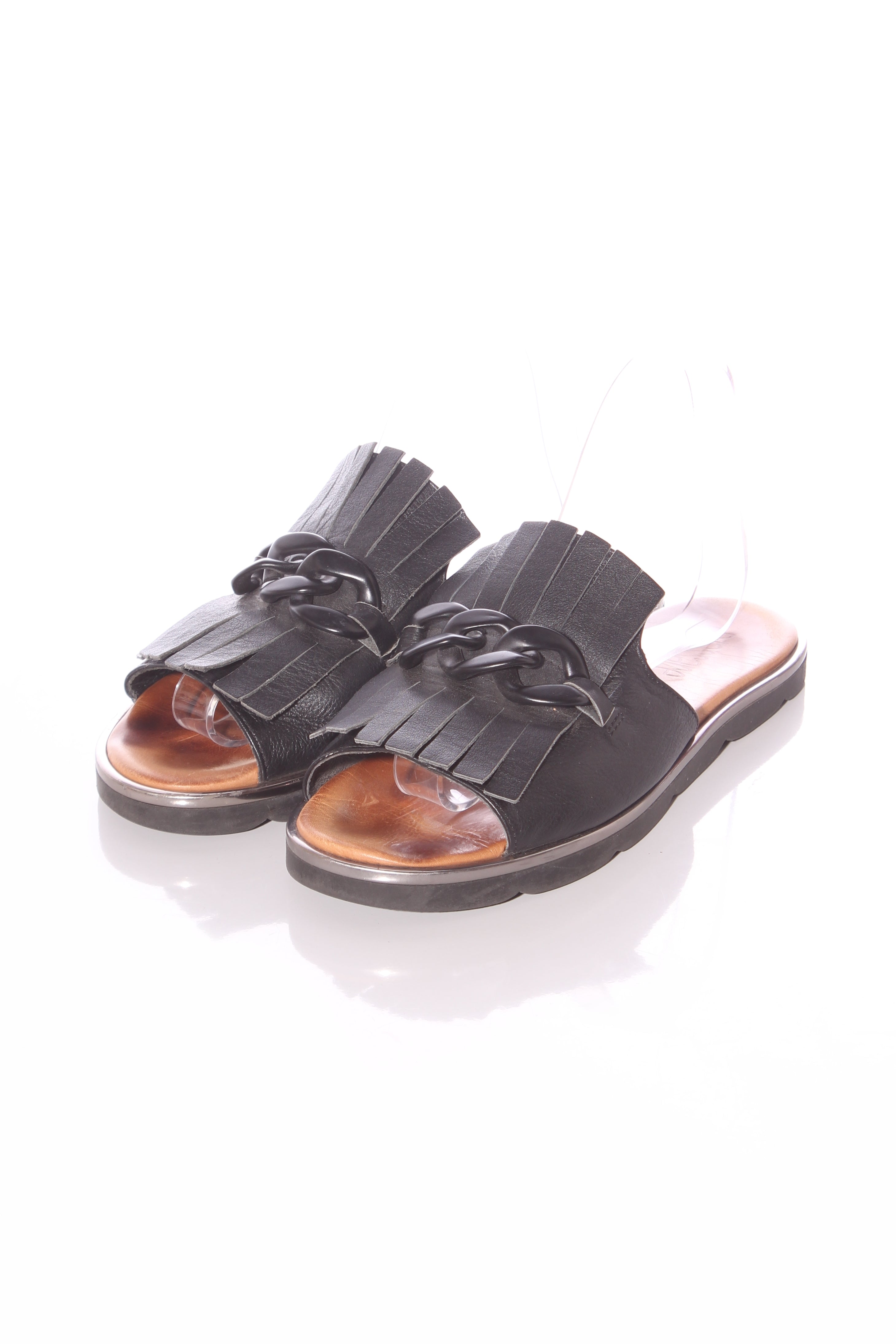 SIZE ON SHOE: 40FITS LIKE: 9COLOUR: BlackFABRIC: Leather upper, leather lining, synthetic soleCONDITION: Very good prelovedMEASUREMENTS:INNER SOLE: 27cms WIDTH: 10cms HEEL: 1.5cms NOTES: This Tumult sandal...