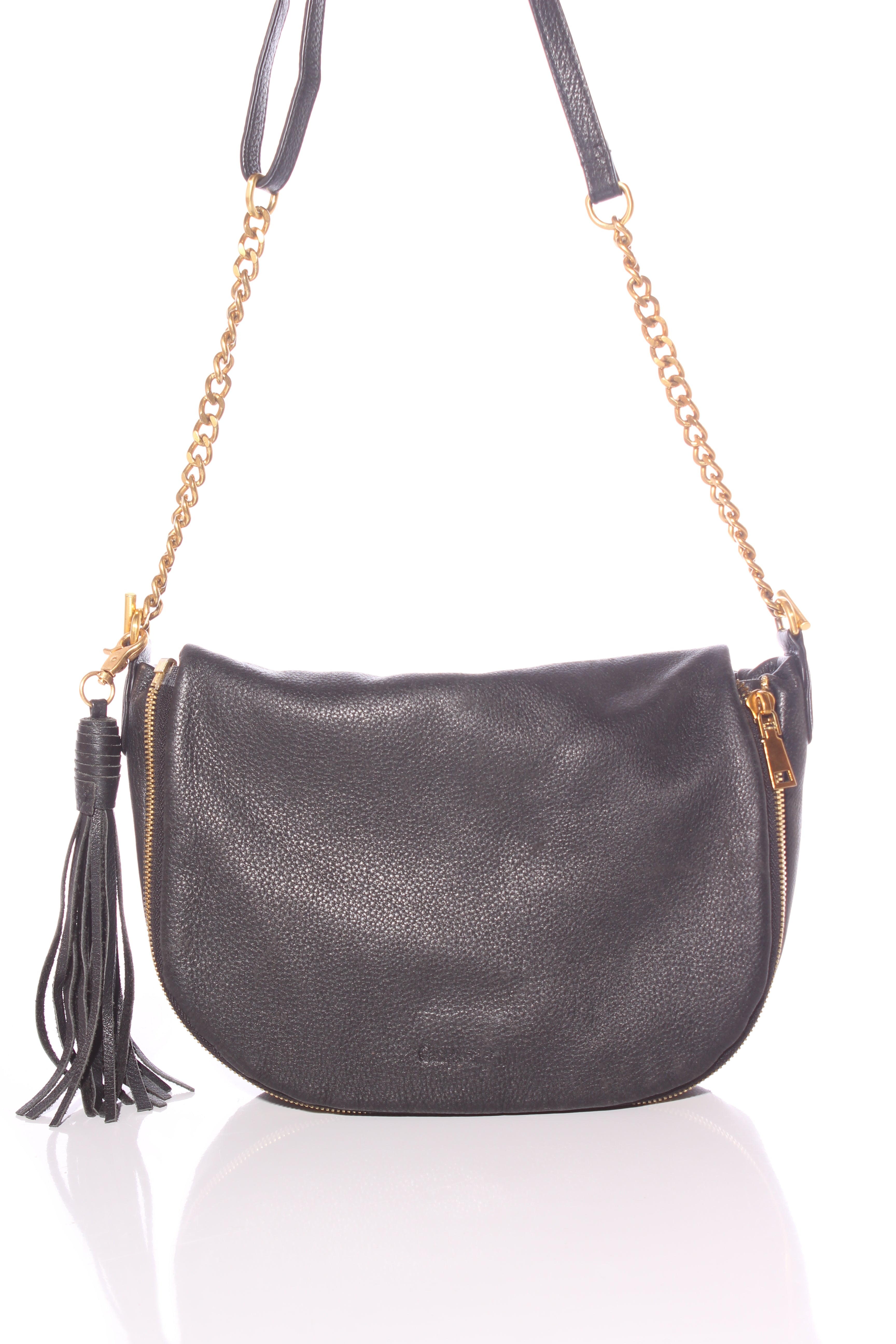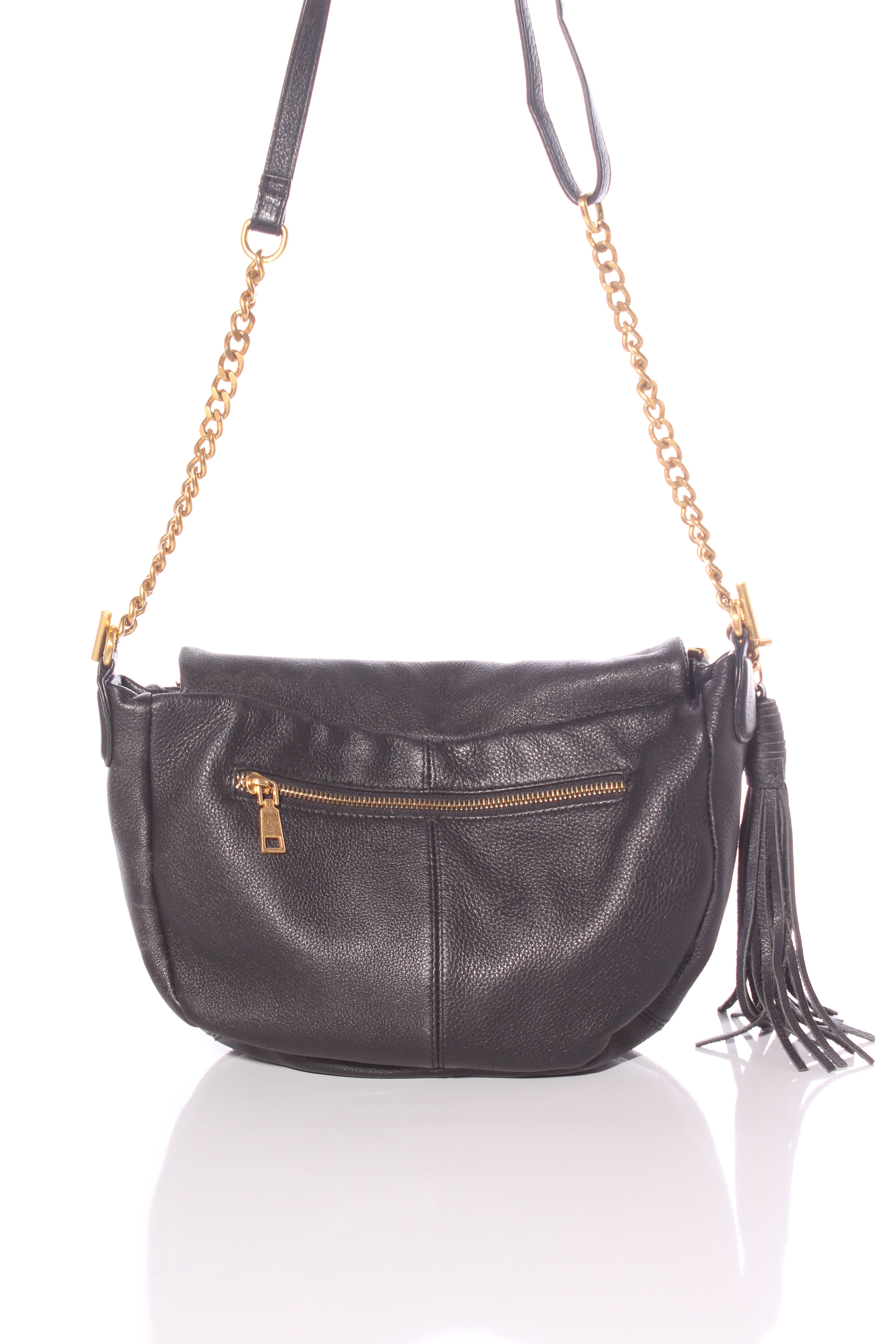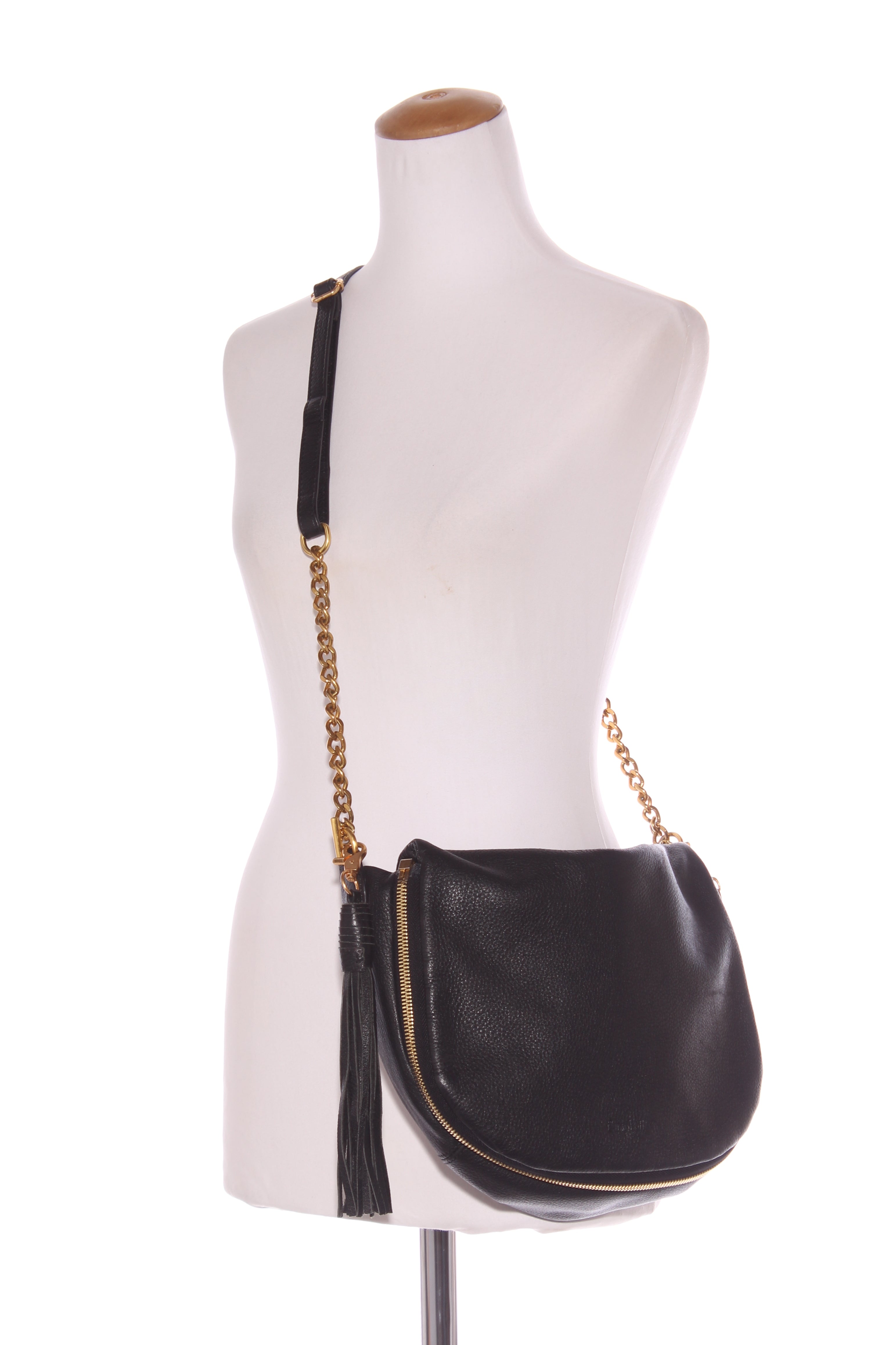 COLOUR: Black, goldFABRIC: Leather, metal, textileCONDITION: Very good preloved - light wearMEASUREMENTS:HEIGHT: 23cms WIDTH: 34cms DEPTH: 8cms STRAP: 85cms NOTES: Zip access to main...