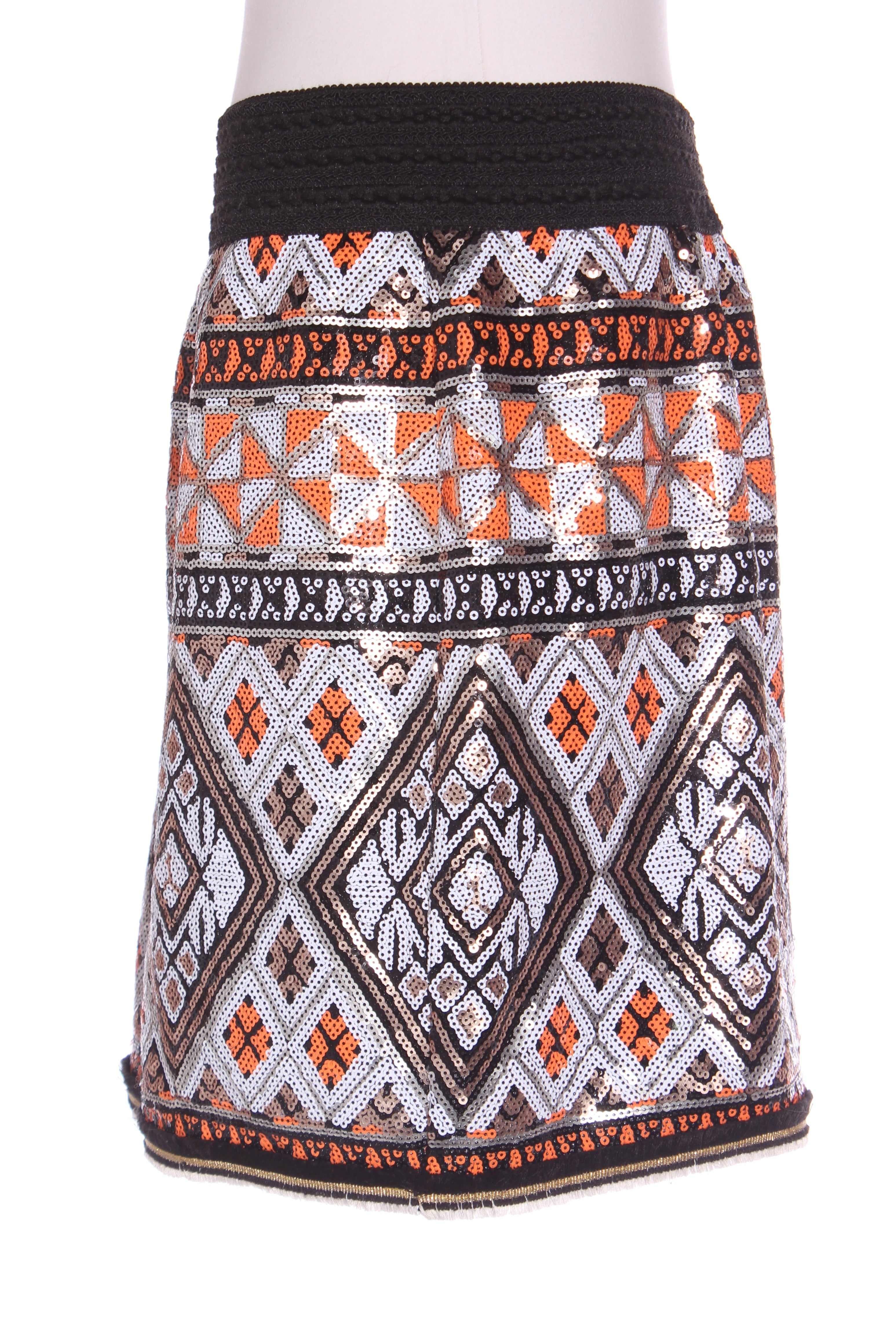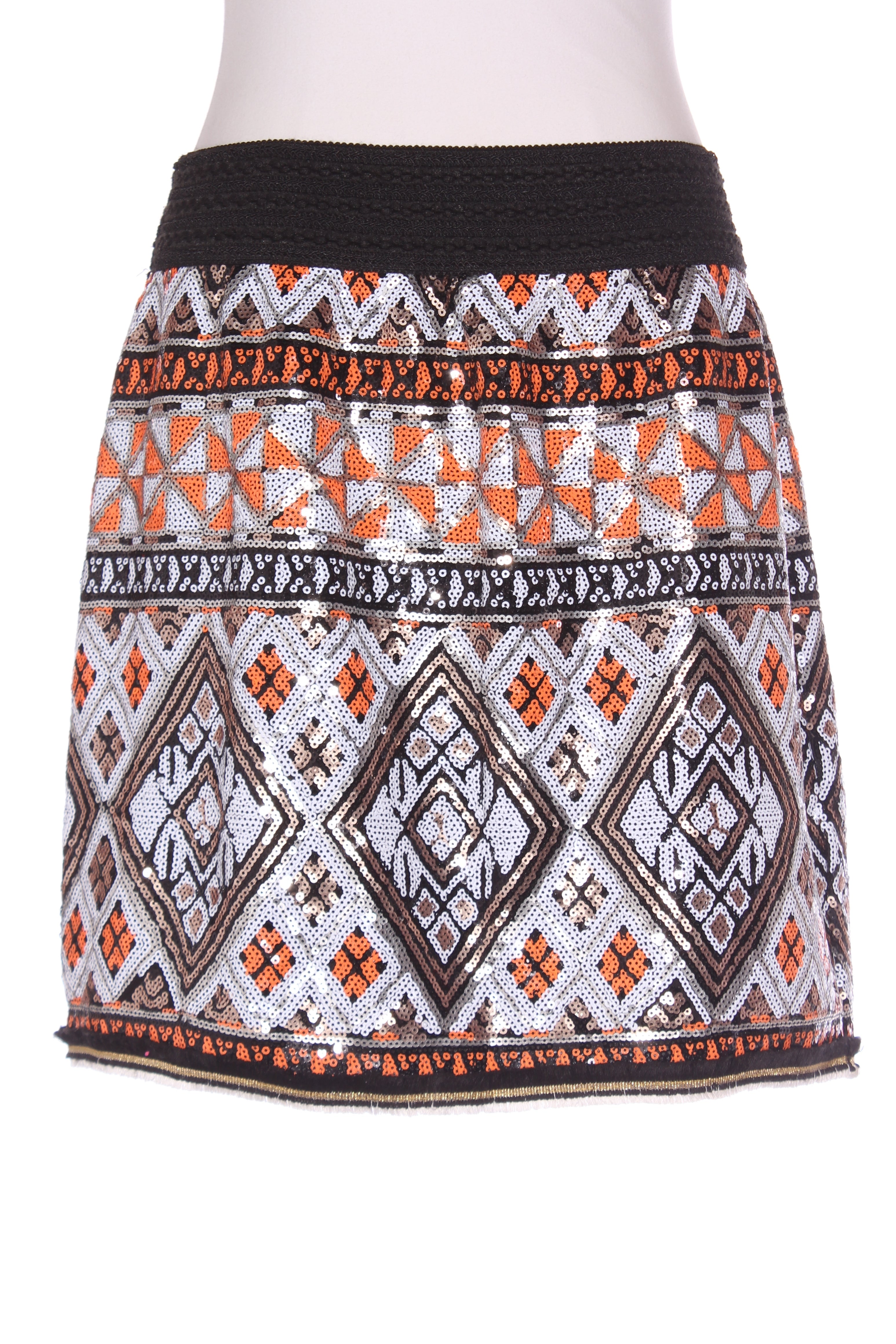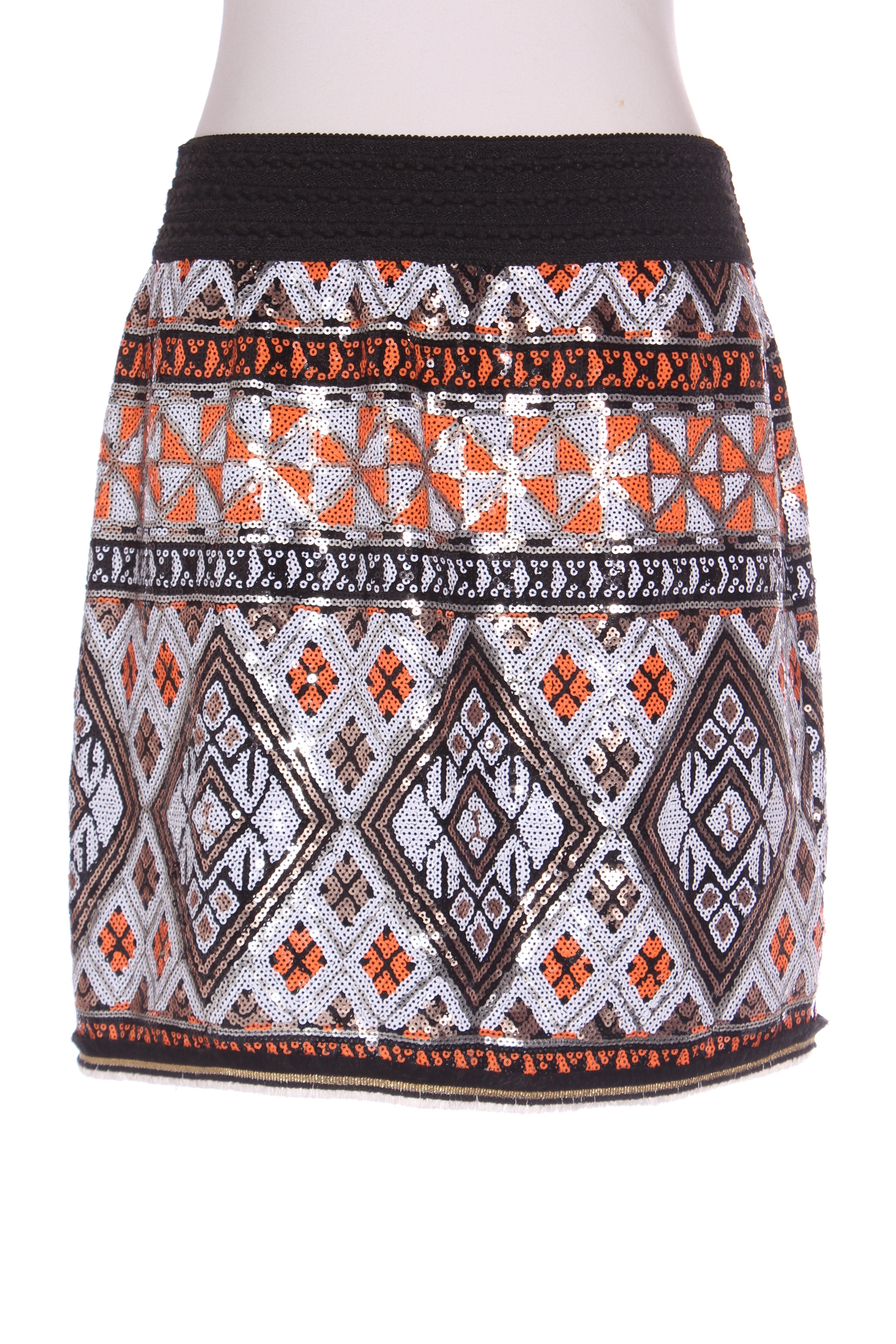 SIZE ON TAG: LFITS LIKE: 14COLOUR: Black, orange, white, gold, multiFABRIC: Polyester, Lining - 93% polyester, 7% elastaneCONDITION: Excellent prelovedMEASUREMENTS:WAIST: 40cms HIPS: 56cms LENGTH: 47cms NOTES: Elasticated waist. Has lining. ...