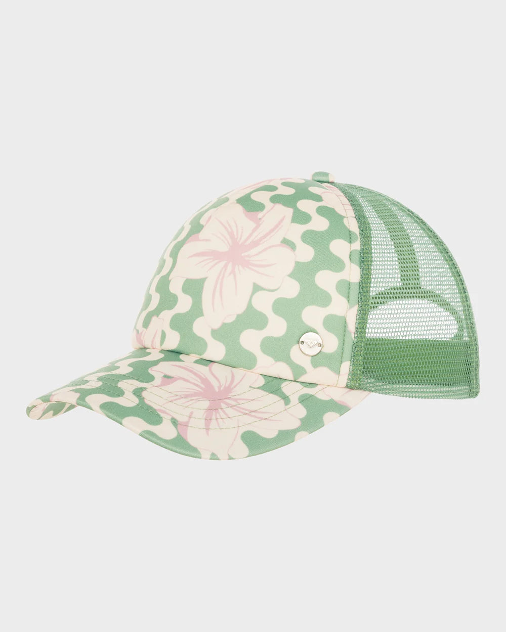 SIZE ON TAG: Tag removedCOLOUR: KhakiFABRIC: Tag removed, polyesterCONDITION: Like newNOTES: Printed polyester, solid polyester, print placement may differ slightlyConstruction: Adjustable back closure, mesh backVisor/Brim: Curved visor Roxy metal plate...