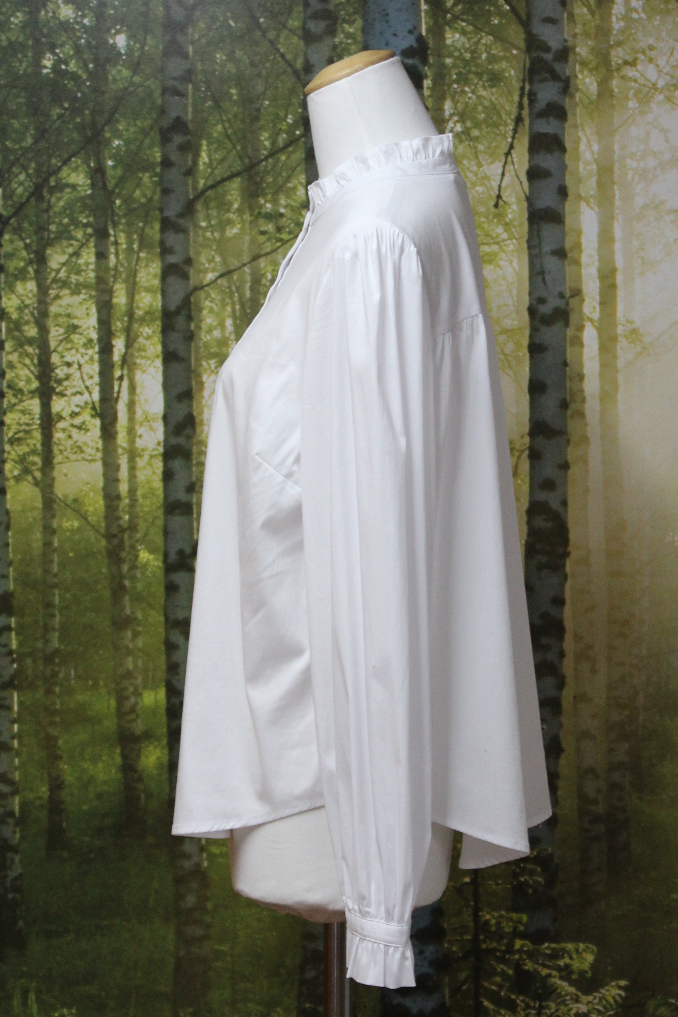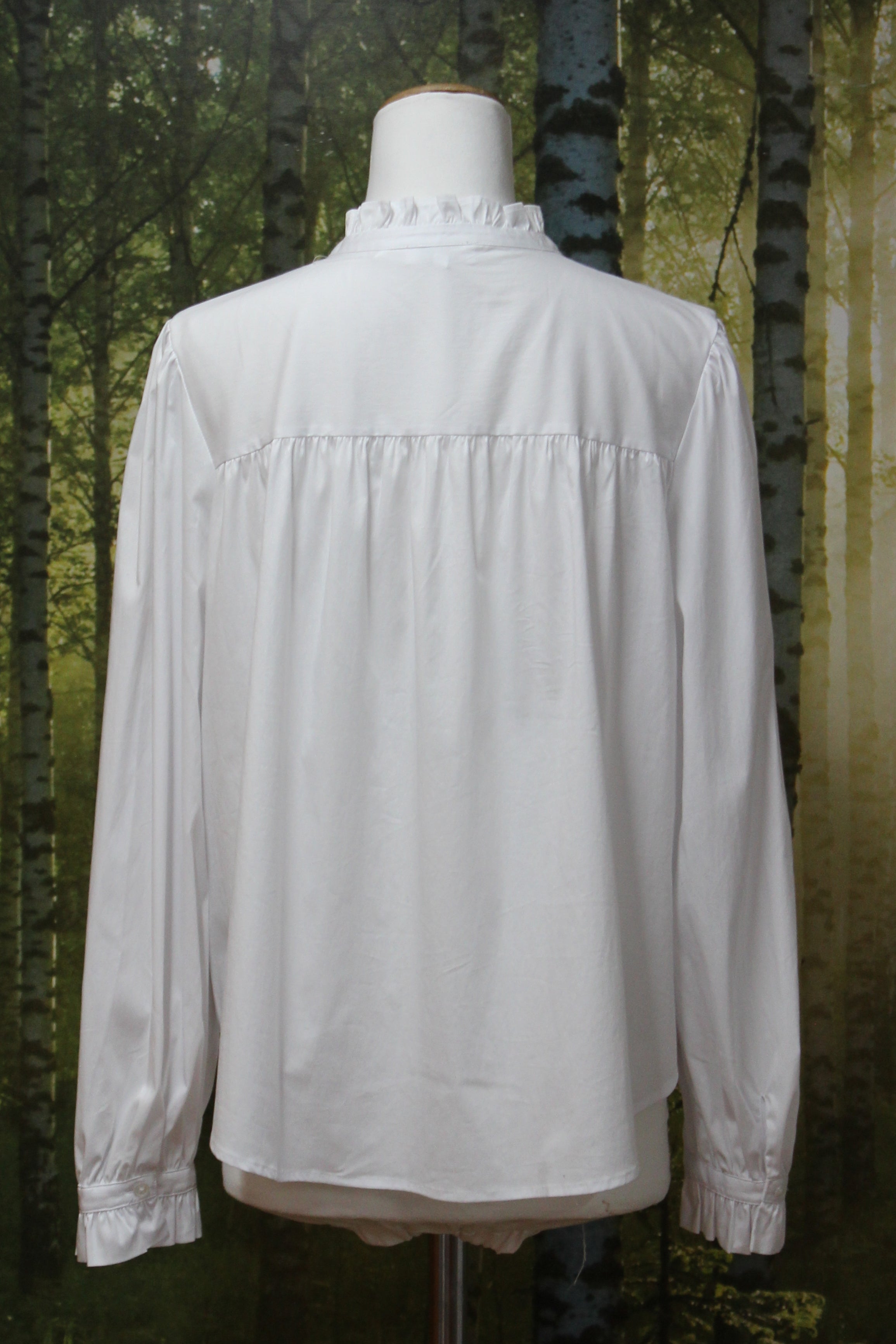 SIZE ON TAG: 16FITS LIKE: N/ACOLOUR: WhiteFABRIC: 69% cotton, 27% nylon, 4% elastaneCONDITION: Excellent prelovedMEASUREMENTS:BUST: 60cms WAIST: 67cms LENGTH: 65cmsNOTES: Frill collar and sleeve end detail. ...