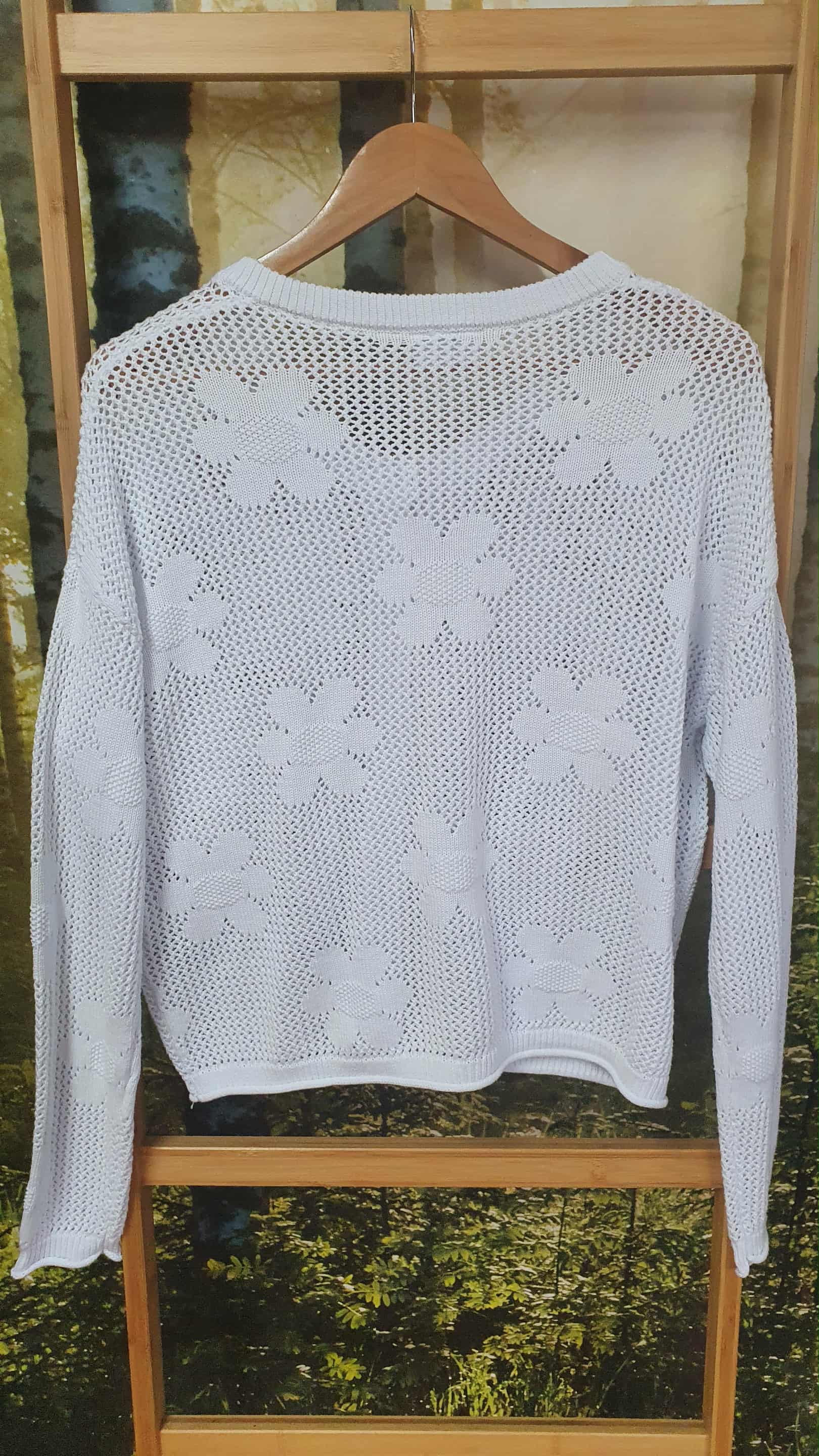 SIZE ON TAG: XLFITS LIKE: 16COLOUR: Blue tint whiteFABRIC: CottonCONDITION: Excellent preloved - hardly wornMEASUREMENTS:BUST: 61cms WAIST: 59cms LENGTH: 115cmsNOTES: Open-knit floral design cardiganCrew neckline and...