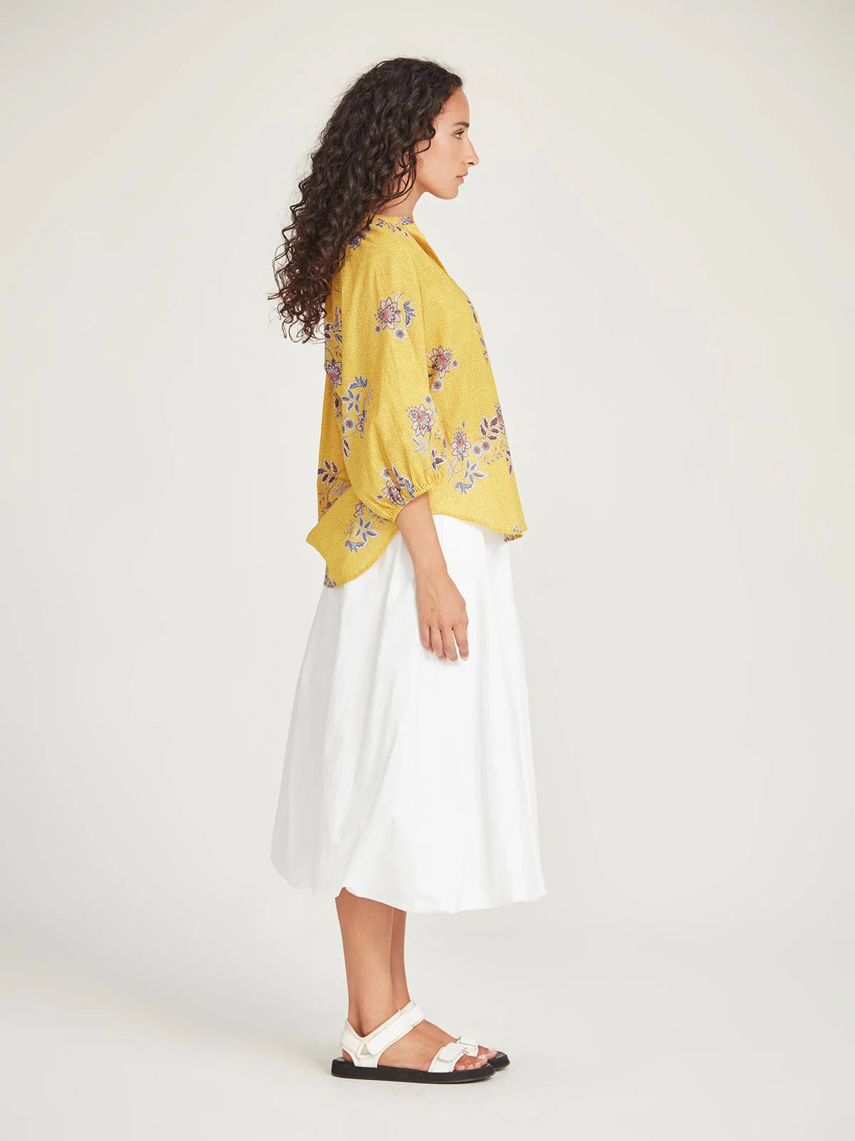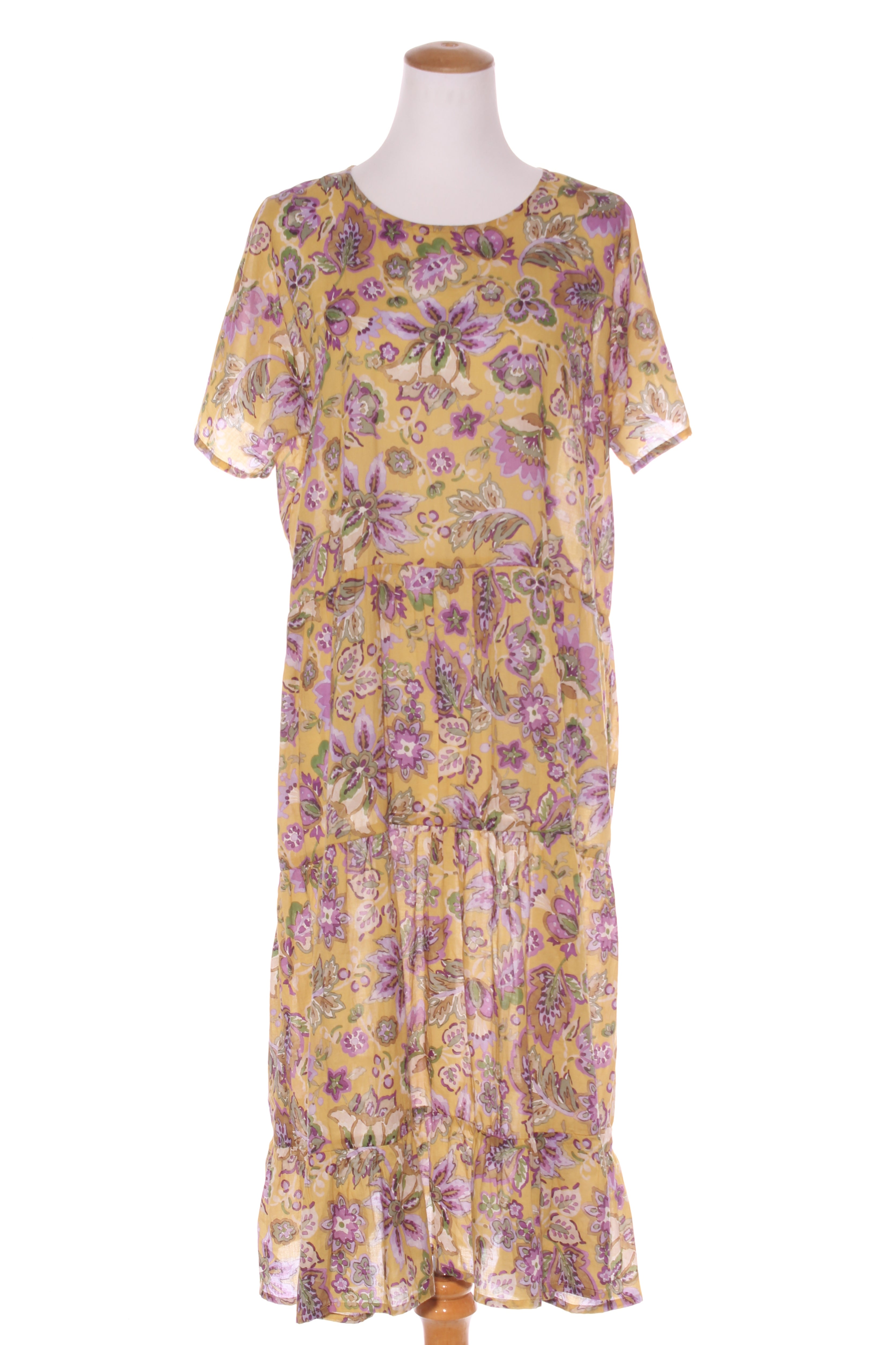 SIZE ON TAG: 10FITS LIKE: 10-12COLOUR: Multi, yellow, purpleFABRIC: BCI cottonCONDITION: Excellent prelovedMEASUREMENTS:BUST: 60cms WAIST: 58cms LENGTH: 118cms NOTES: Cut from a fine Cotton Voile adorned...