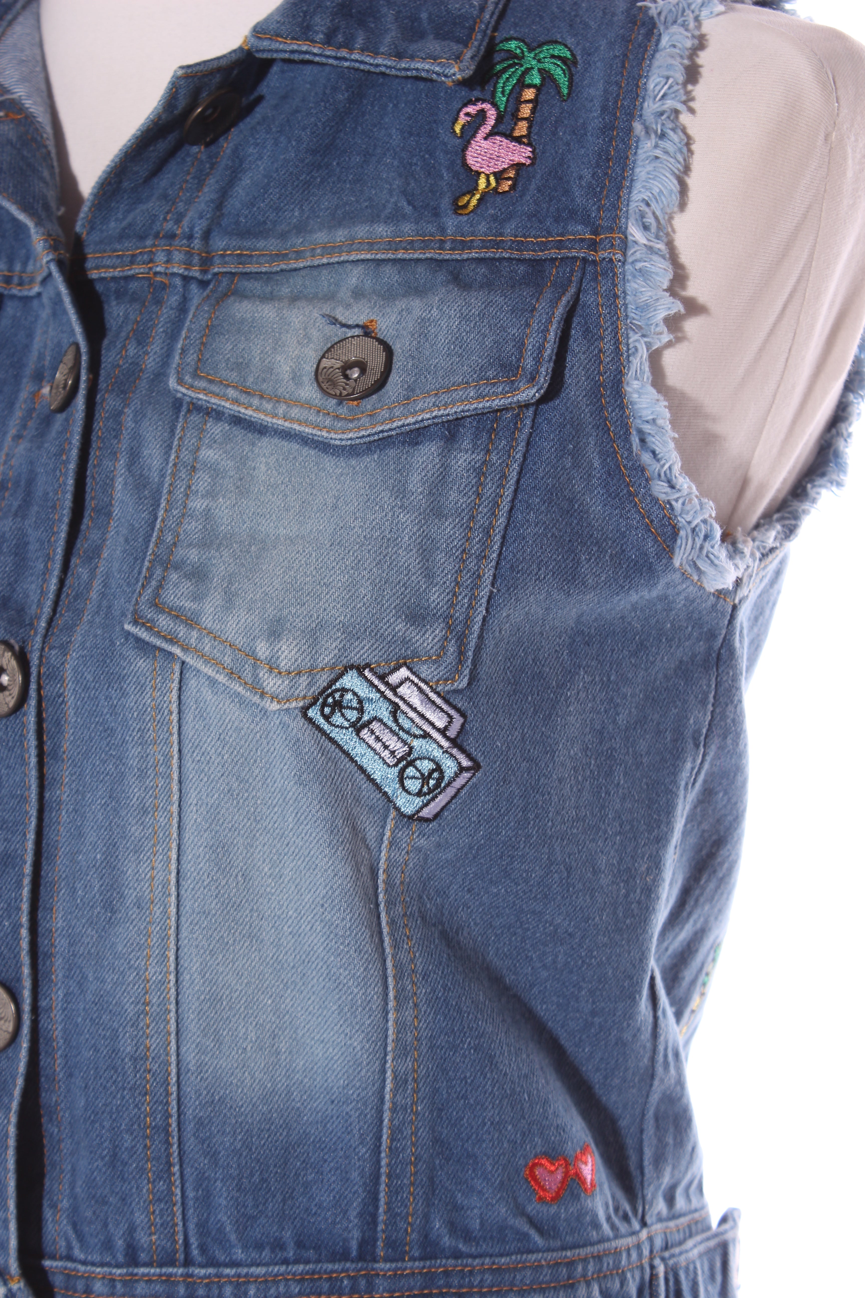 SIZE ON TAG: 10FITS LIKE: N/ACOLOUR: BlueFABRIC: CottonCONDITION: Very good prelovedMEASUREMENTS:BUT: 45cms WAIST: 42cms LENGTH: 49cms NOTES: Button front and sleeve ends. Front pockets. No stretch