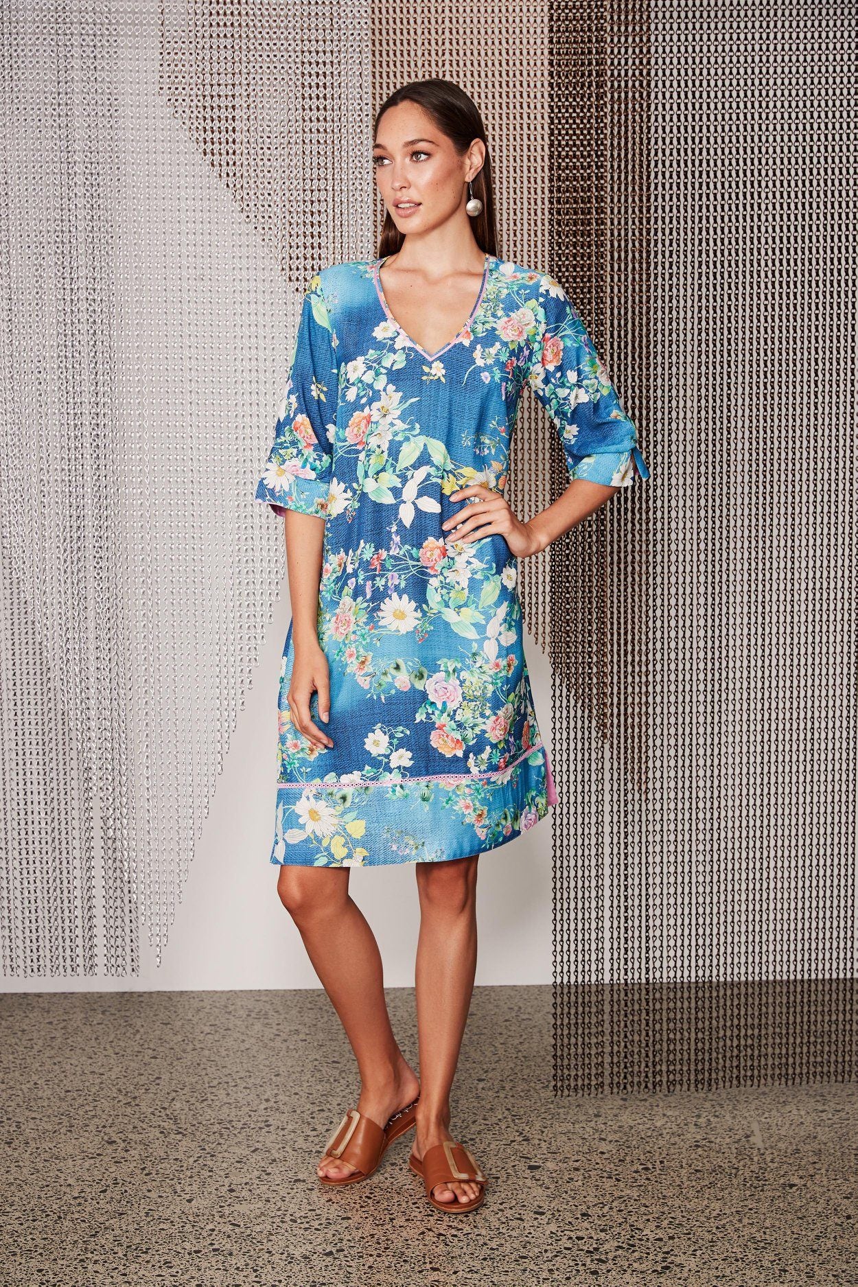 SIZE ON TAG: SFITS LIKE: 10 COLOUR: Blue, pink, multiFABRIC: ViscoseCONDITION: Excellent prelovedMEASUREMENTS:BUST: 52cms WAIST: 47cms LENGTH: 85cmsNOTES: Pull over style. Side pockets. Fabric has some stretch.