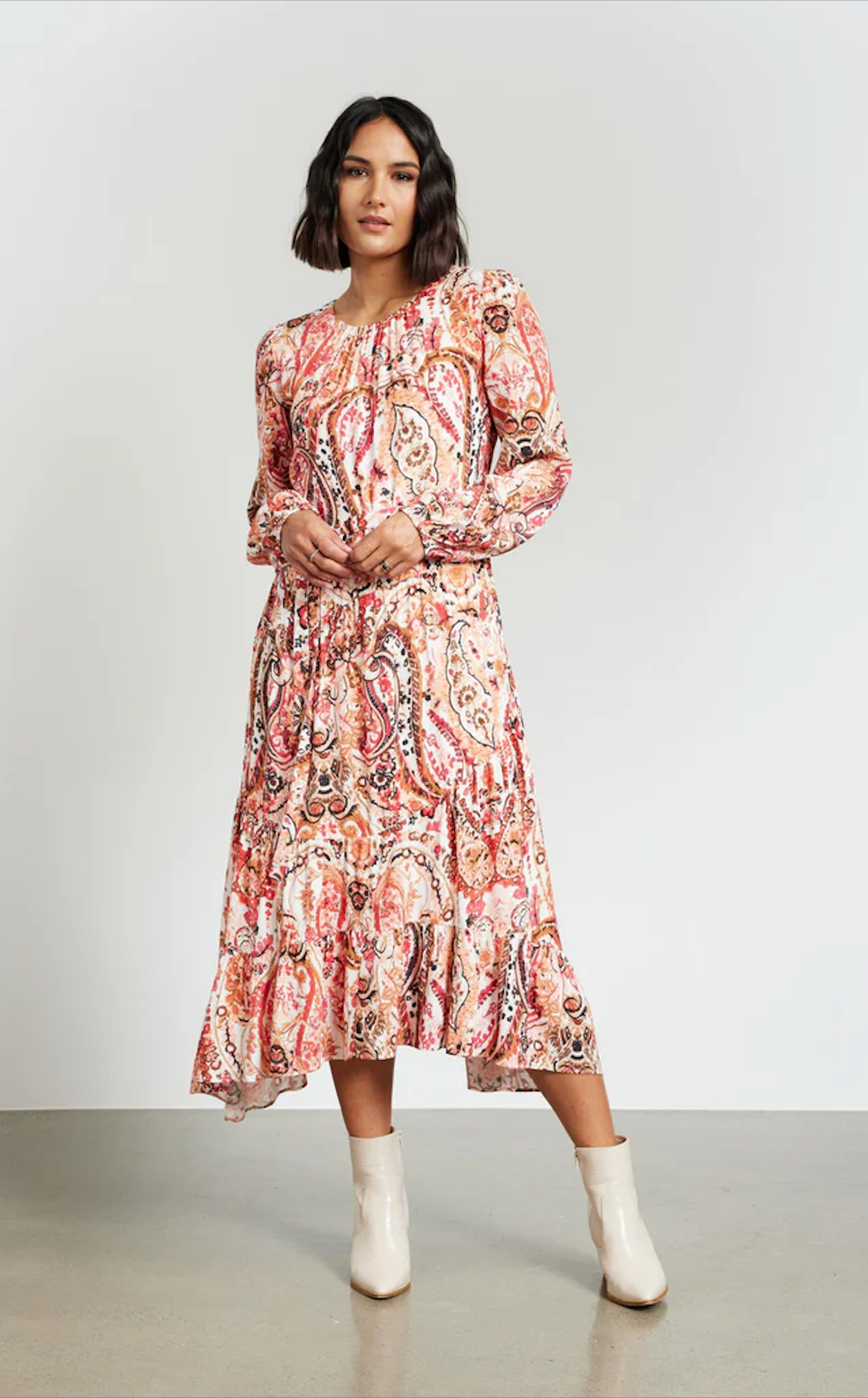 SIZE ON TAG: SFITS LIKE: 10-12COLOUR: Off white base, coral, orange, black, brownFABRIC: 50% viscose, 50% rayon. Lining: RayonCONDITION: Like newMEASUREMENTS:BUST: 56cms WAIST: 55cms LENGTH: 120cms...