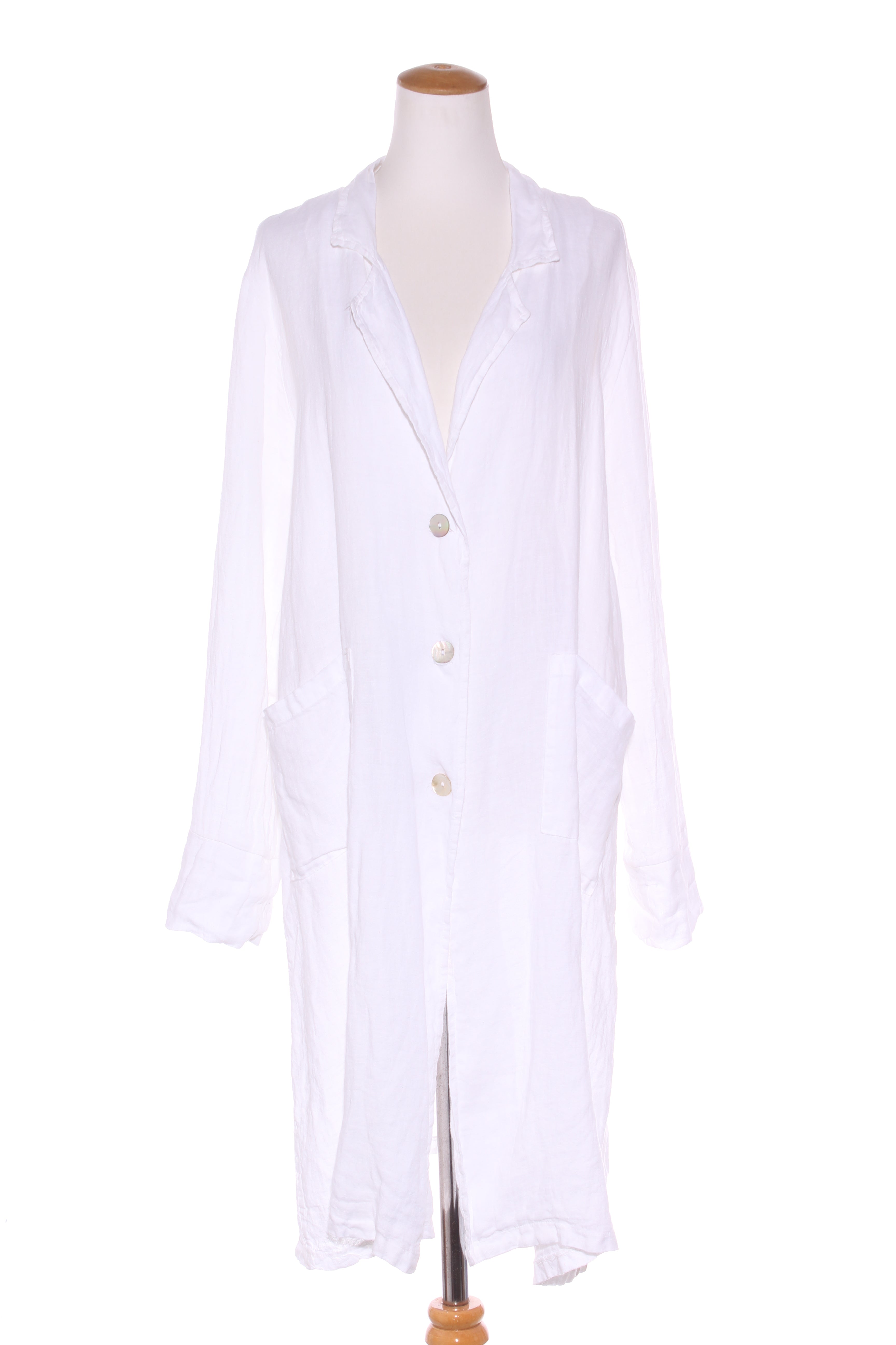 SIZE ON TAG: MFITS LIKE: 12-14COLOUR: WhiteFABRIC: LinenCONDITION: Excellent prelovedMEASUREMENTS:BUST: 63cms WAIST: 63cms LENGTH: 108cms NOTES: Made in Italy. Button up front. Side pockets.