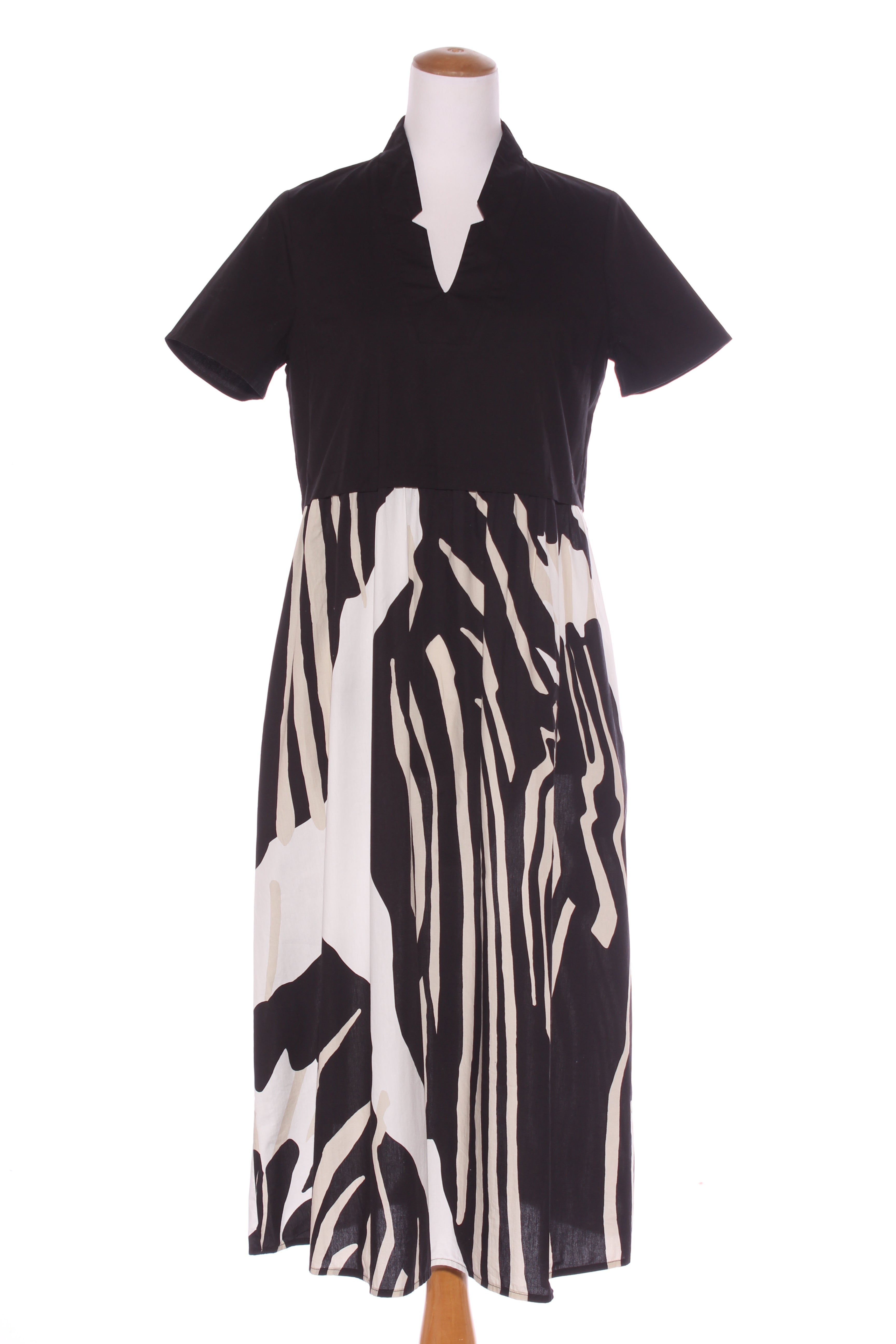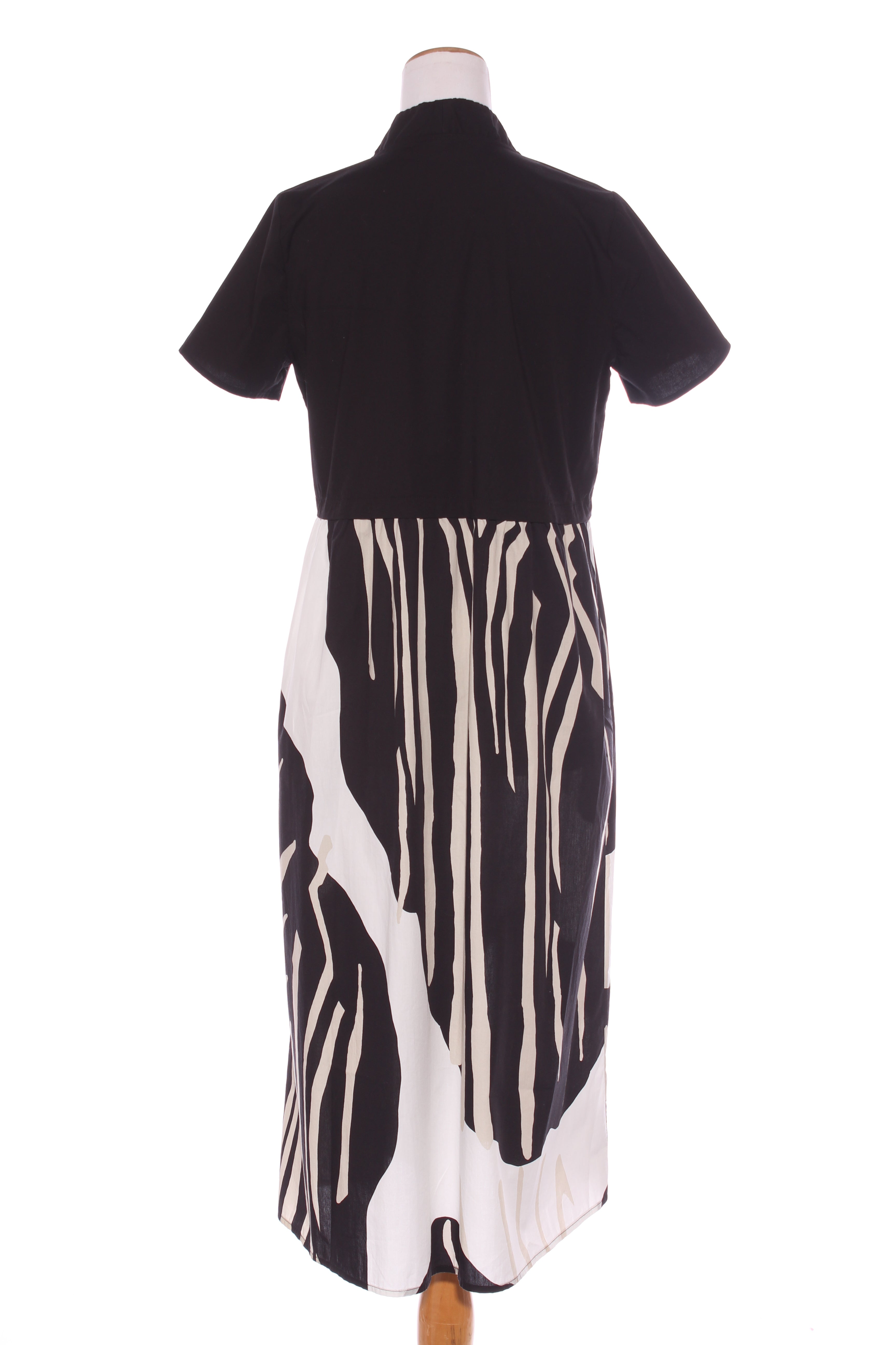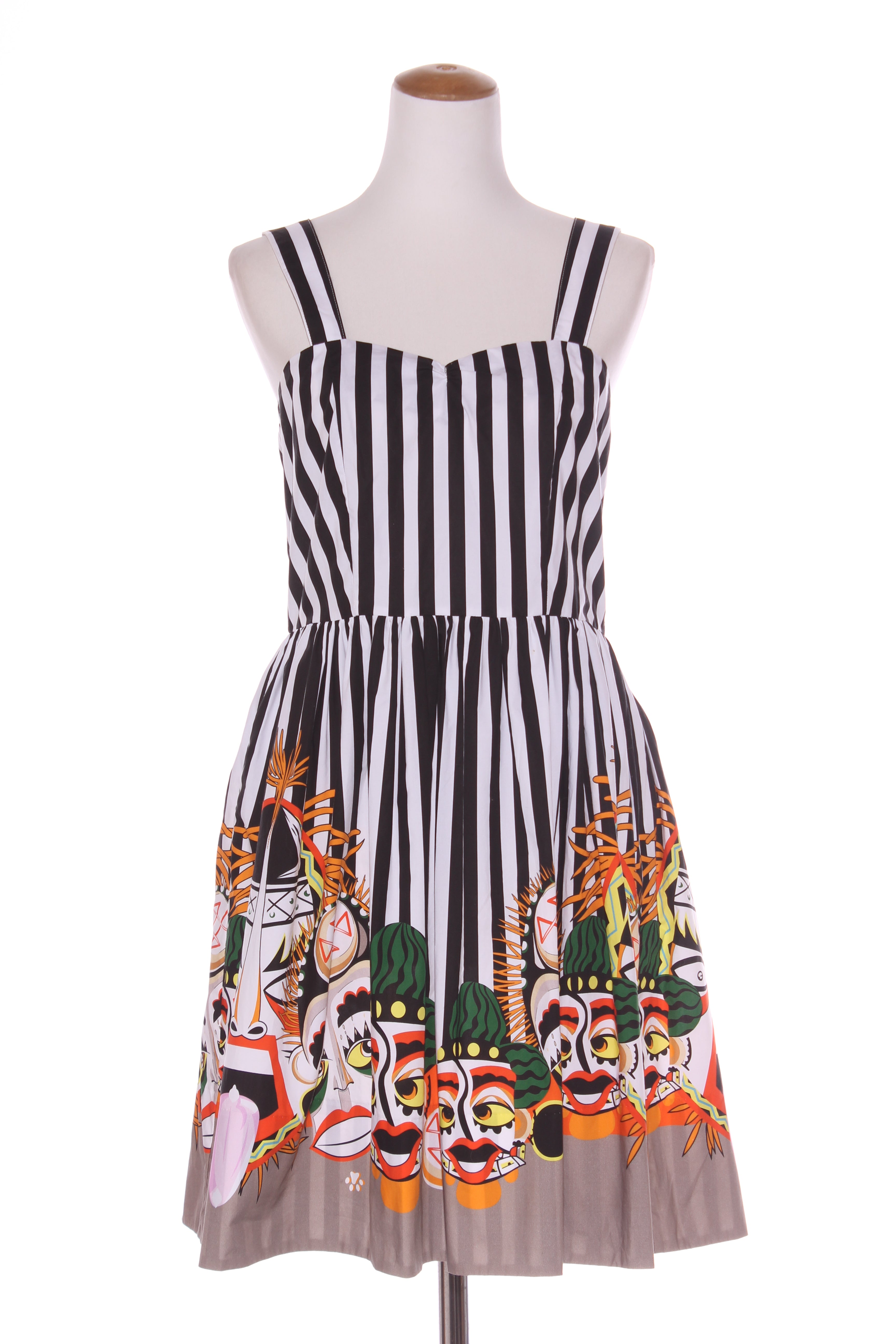 SIZE ON TAG: 10FITS LIKE: N/ACOLOUR: Multi, black, whiteFABRIC: CottonCONDITION: Excellent prelovedMEASUREMENTS:BUST: 46cms WAIST: 40cms LENGTH: 98cmsNOTES: "Safari stripes - Spot the Cheetah". Back zip access. ...