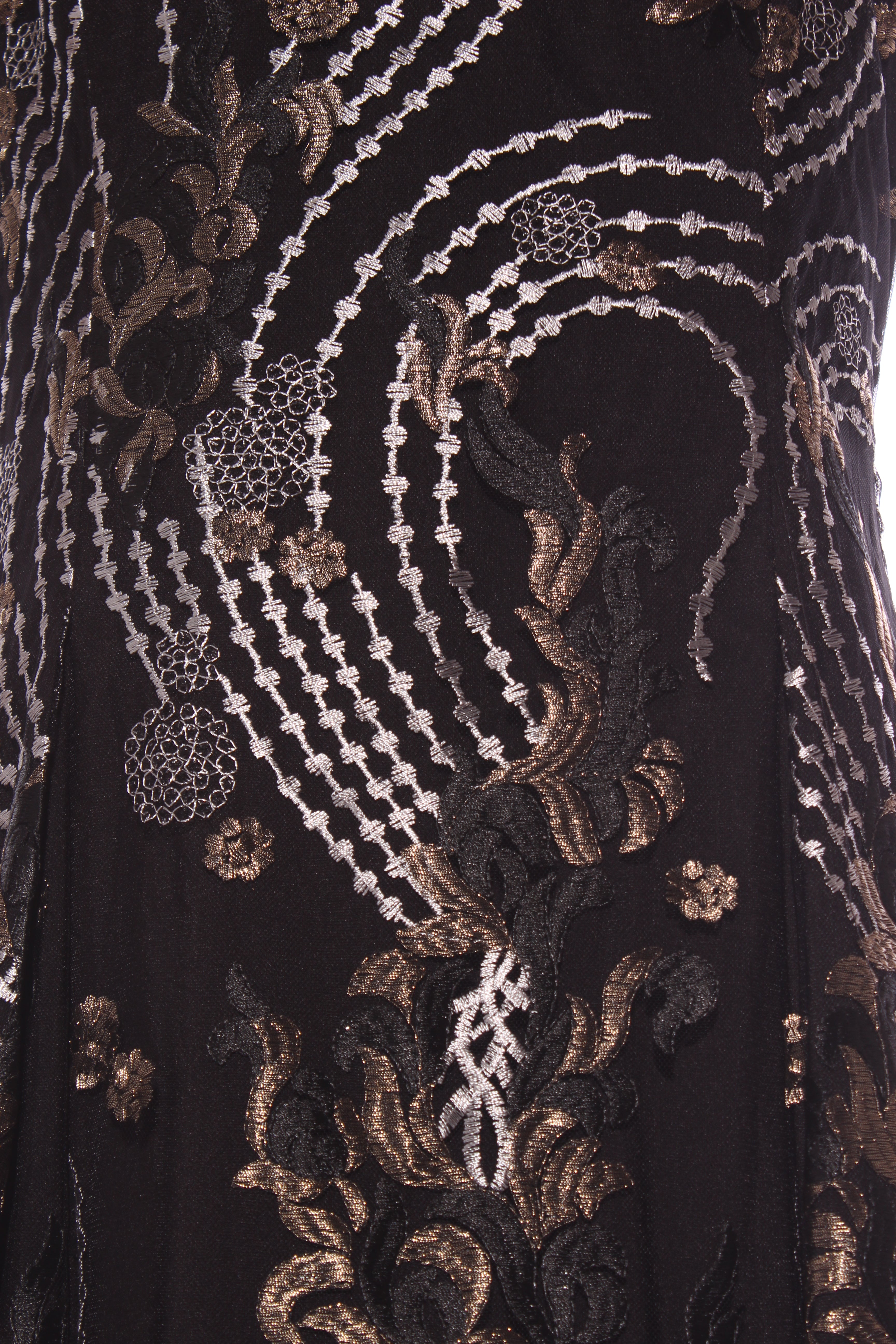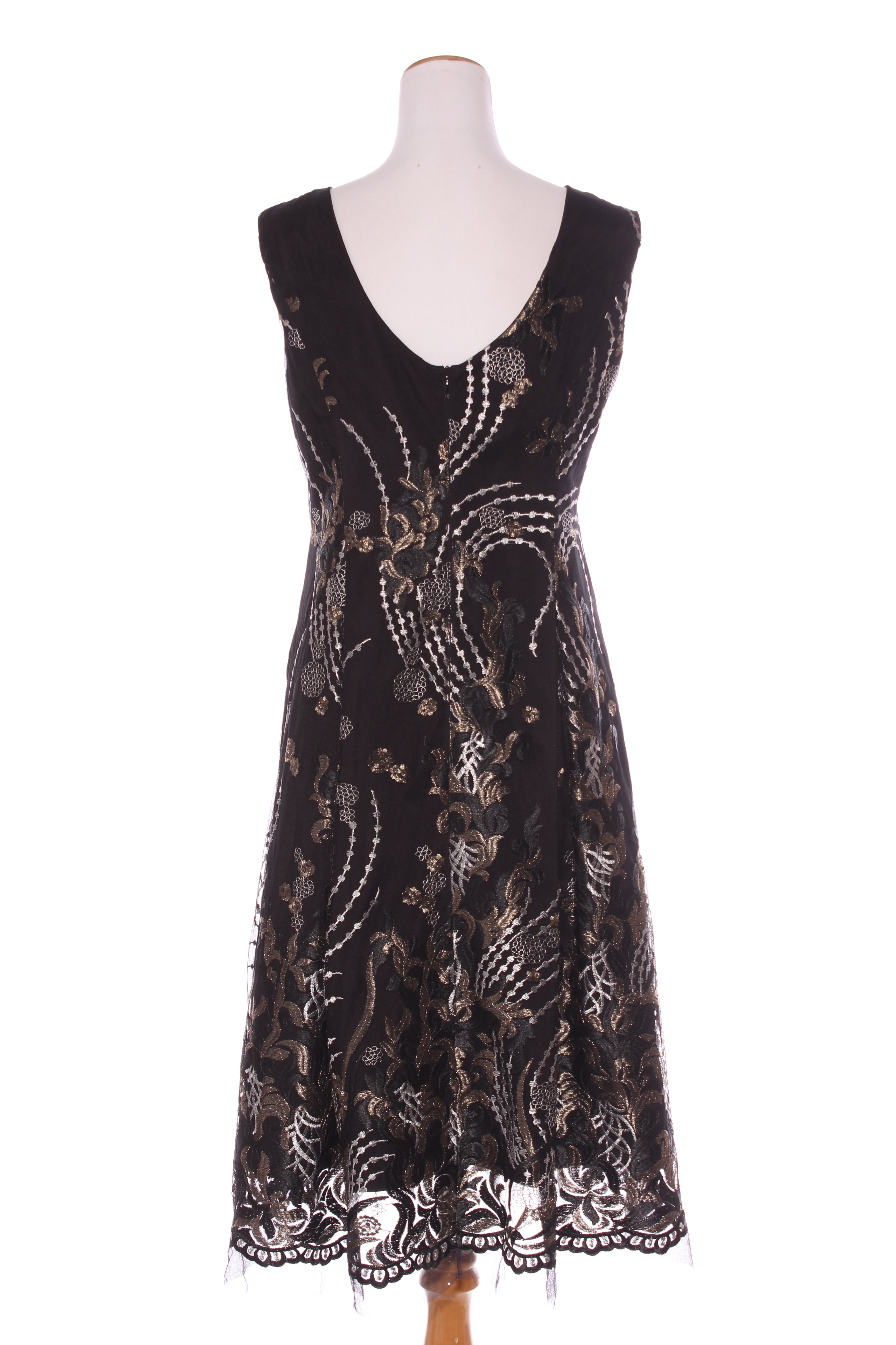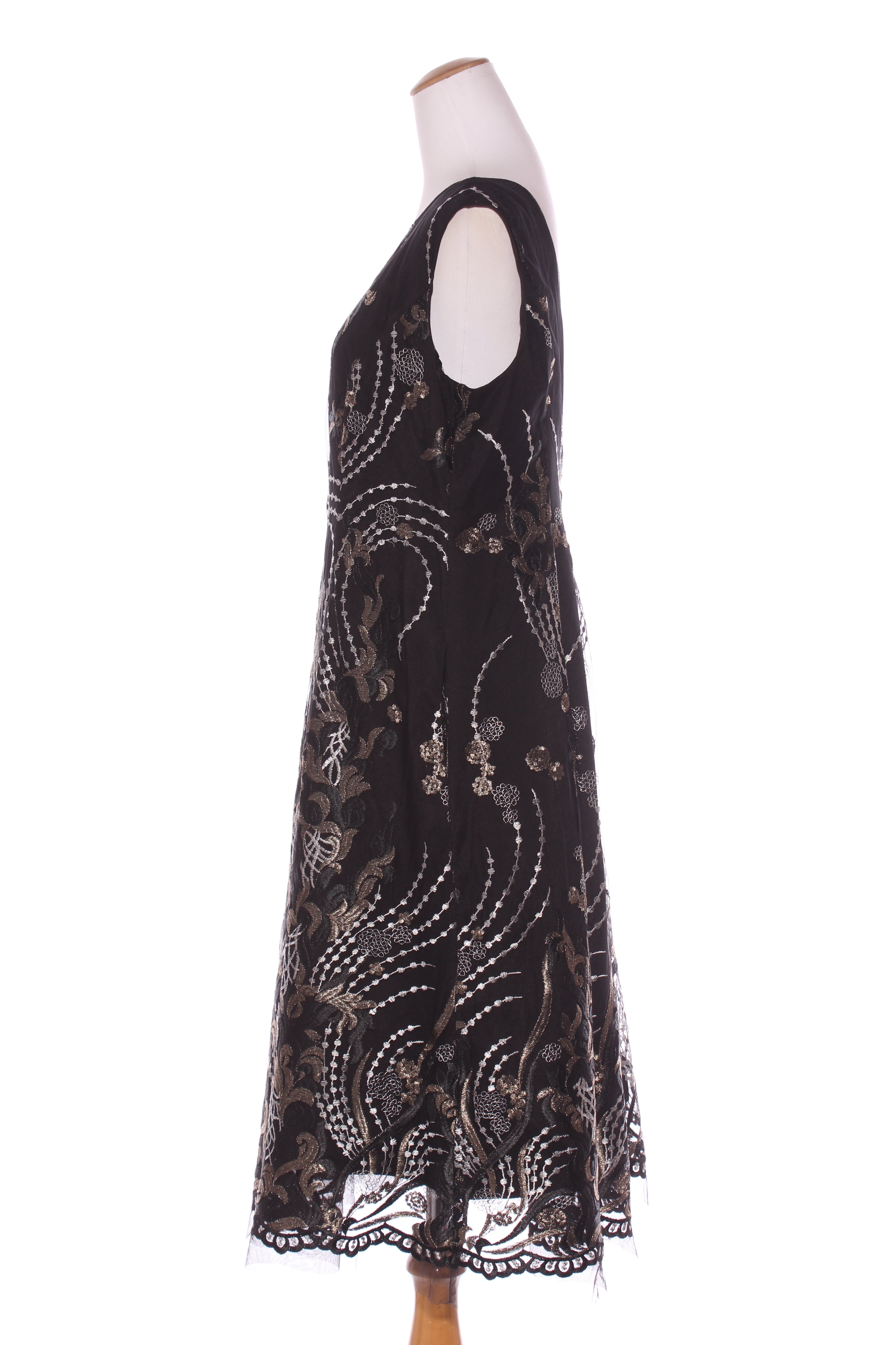 SIZE ON TAG: 16FITS LIKE: N/ACOLOUR: BlackFABRIC: Viscose with beadingCONDITION: Excellent prelovedMEASUREMENTS:BUST: 52cms WAIST: 50cms LENGTH: 98cmsNOTES: "Noir rose - Shaken and stirred". Self patterned rose...