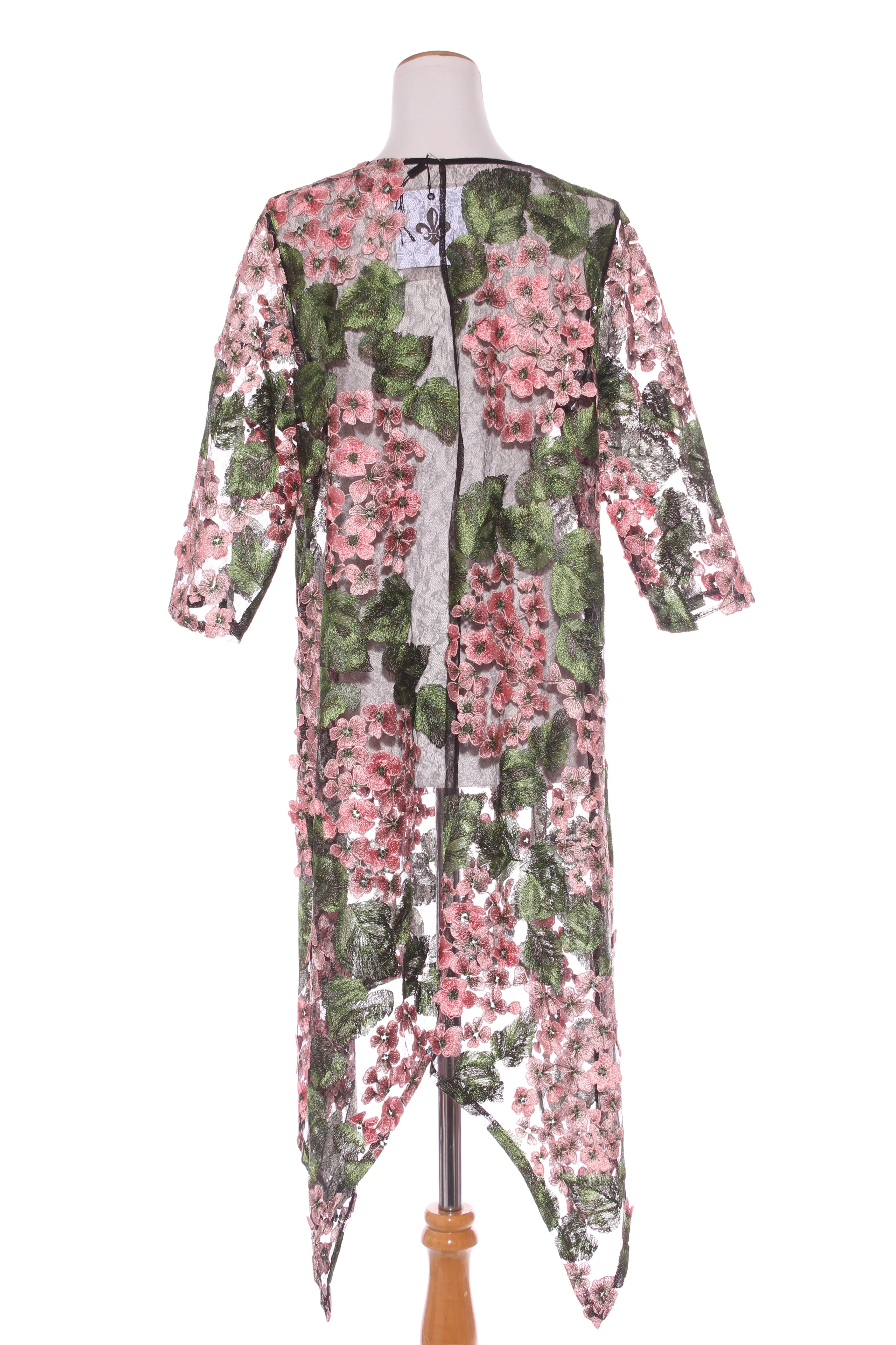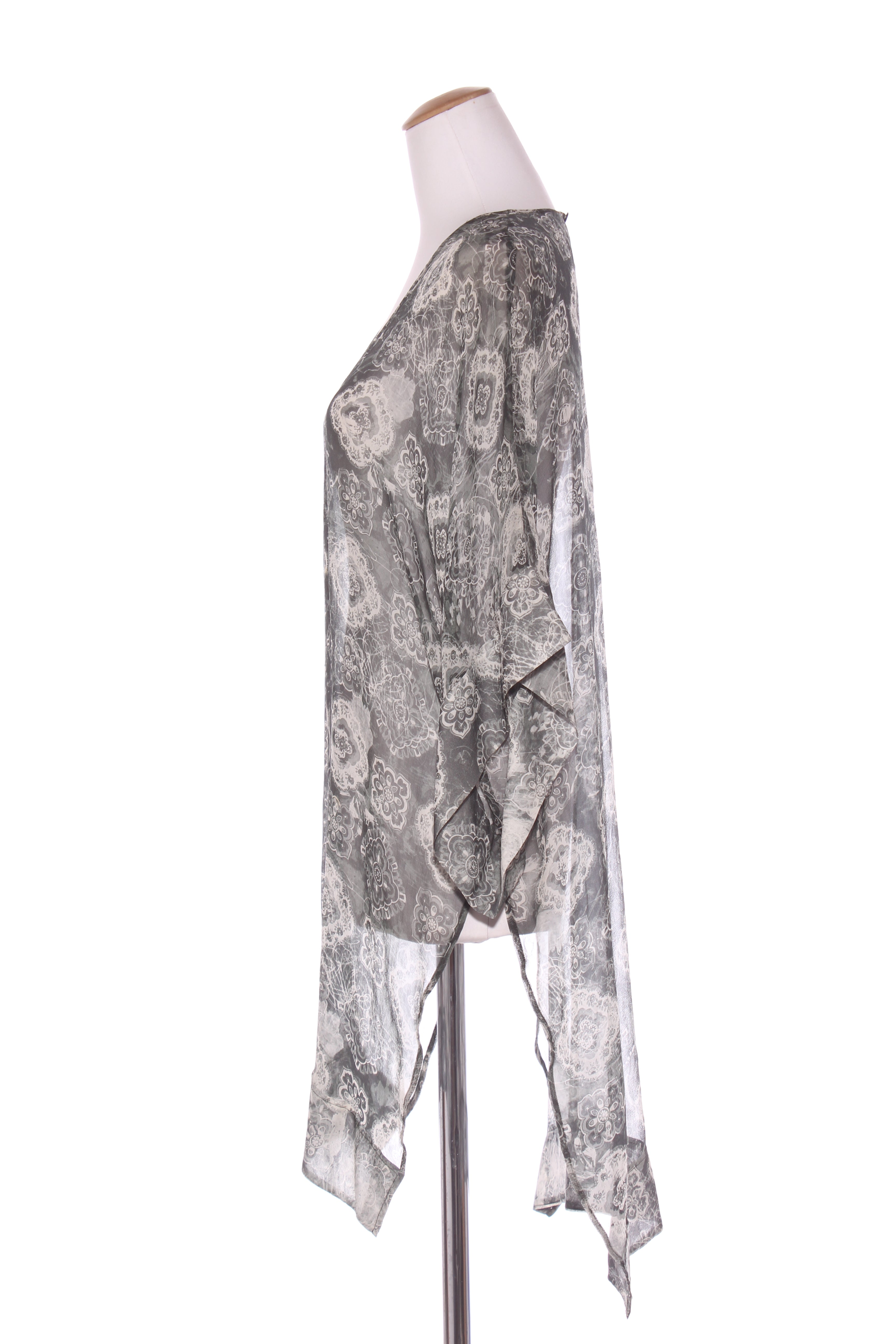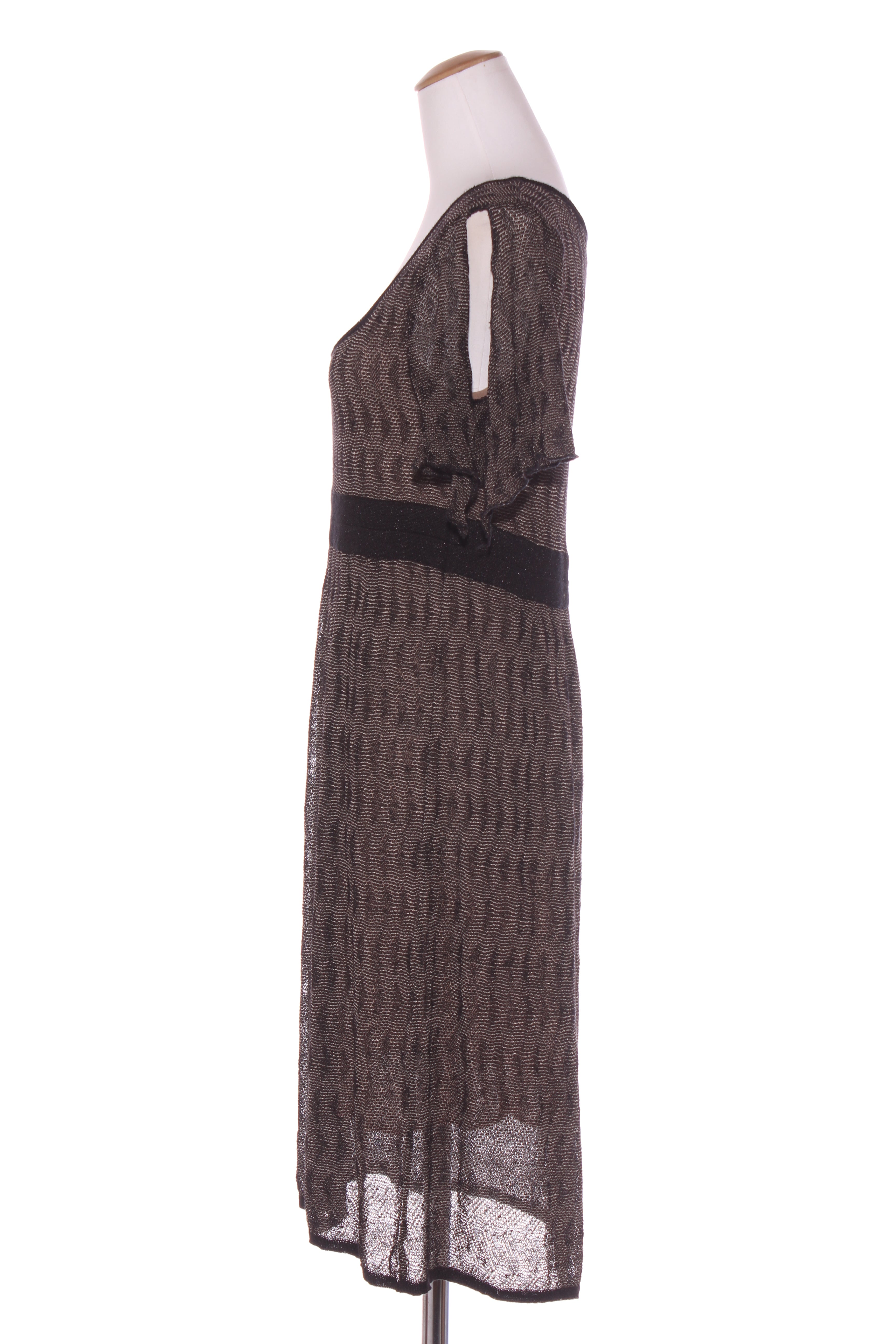 SIZE ON TAG: 16FITS LIKE: N/ACOLOUR: BlackFABRIC: Viscose with beadingCONDITION: Excellent prelovedMEASUREMENTS:BUST: 52cms WAIST: 50cms LENGTH: 98cmsNOTES: "Noir rose - Shaken and stirred". Self patterned rose...