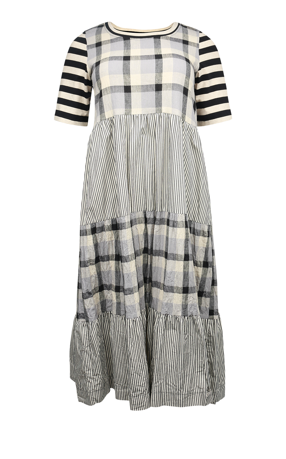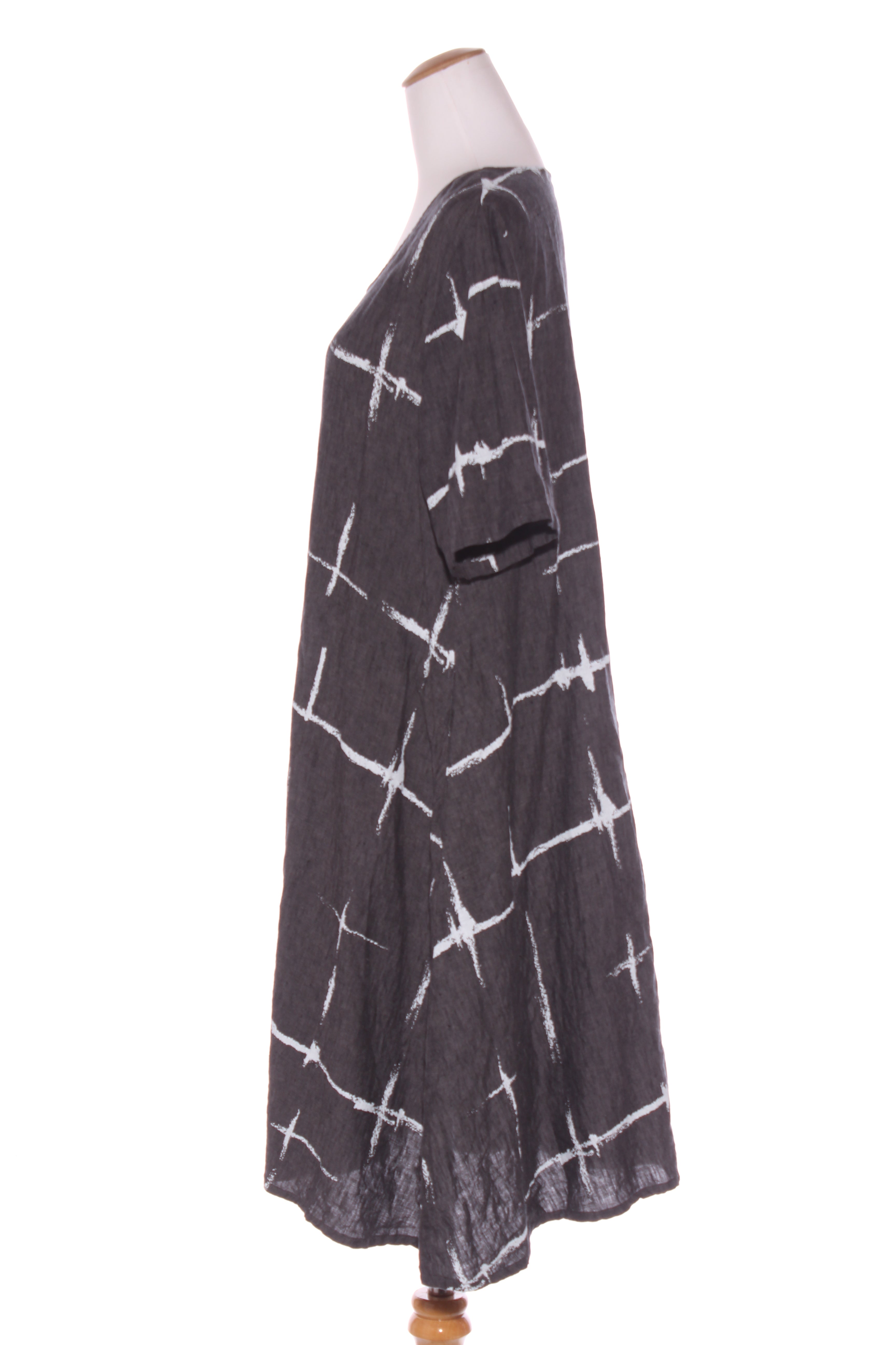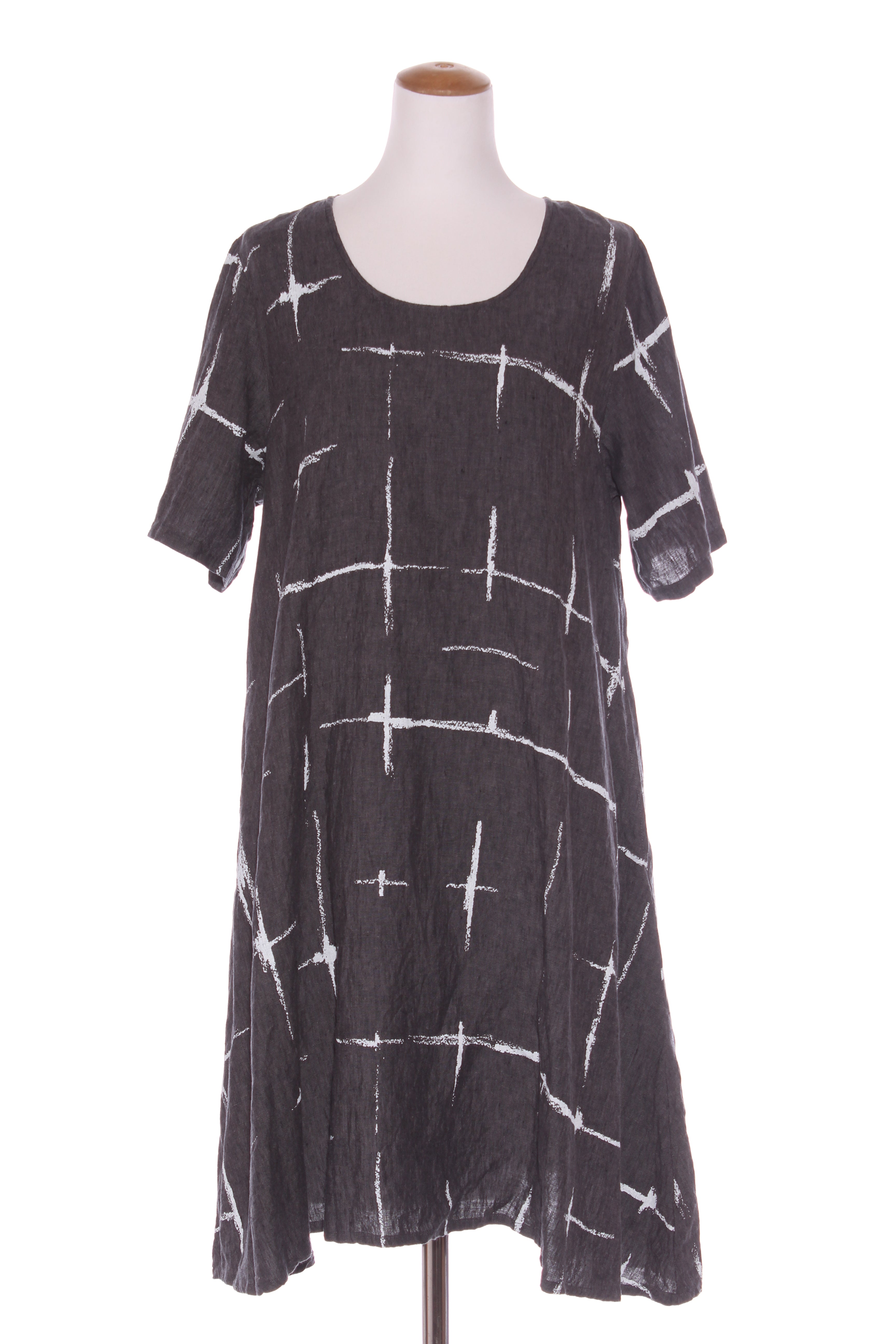 SIZE ON TAG: XLFITS LIKE: 14COLOUR: Grey, whiteFABRIC: Linen CONDITION: Excellent prelovedMEASUREMENTS:BUST: 56cms WAIST: 61cms LENGTH: 102cmsNOTES: Pull over style. Side pockets.