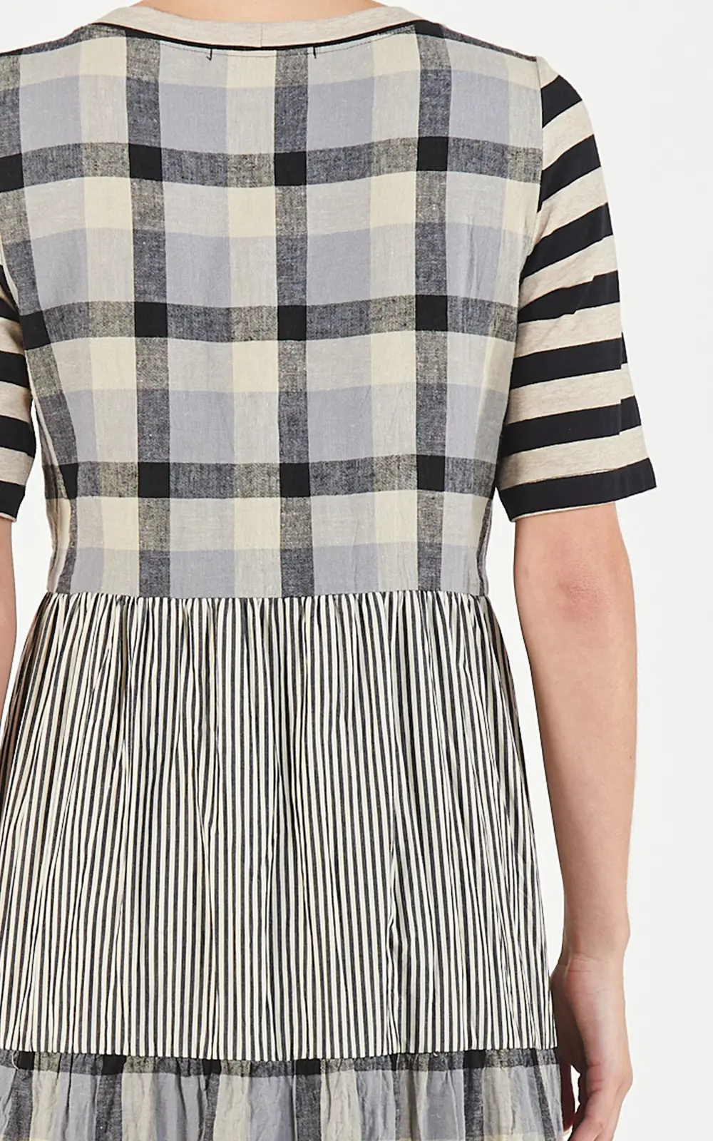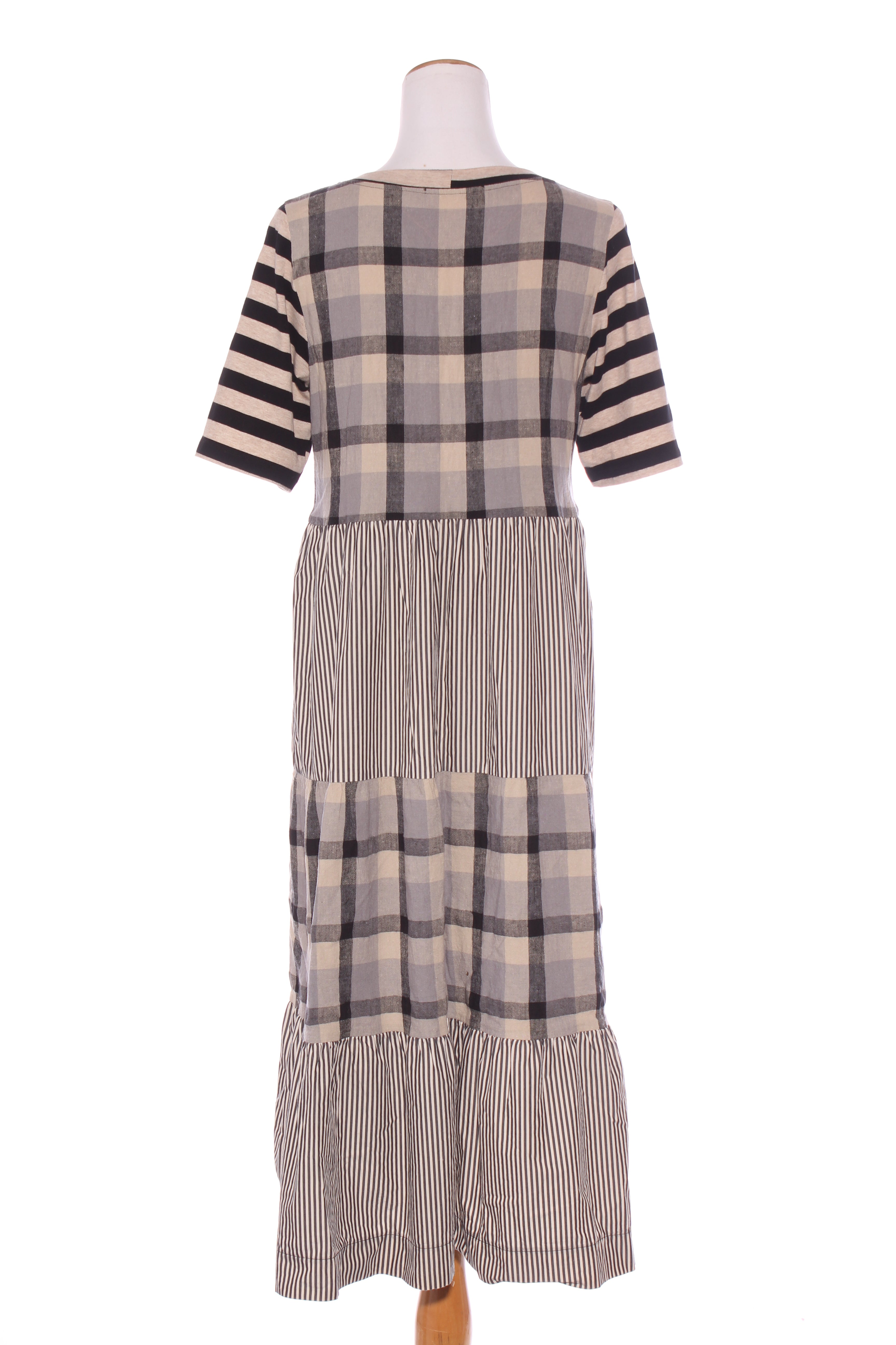 SIZE ON TAG: 8FITS LIKE: 8-10COLOUR: Black, whiteFABRIC: Linen, rayonCONDITION: Excellent prelovedMEASUREMENTS:BUST: 47cms WAIST: 50cms LENGTH: 94-103cmsNOTES: Pull over style. Front pockets.
