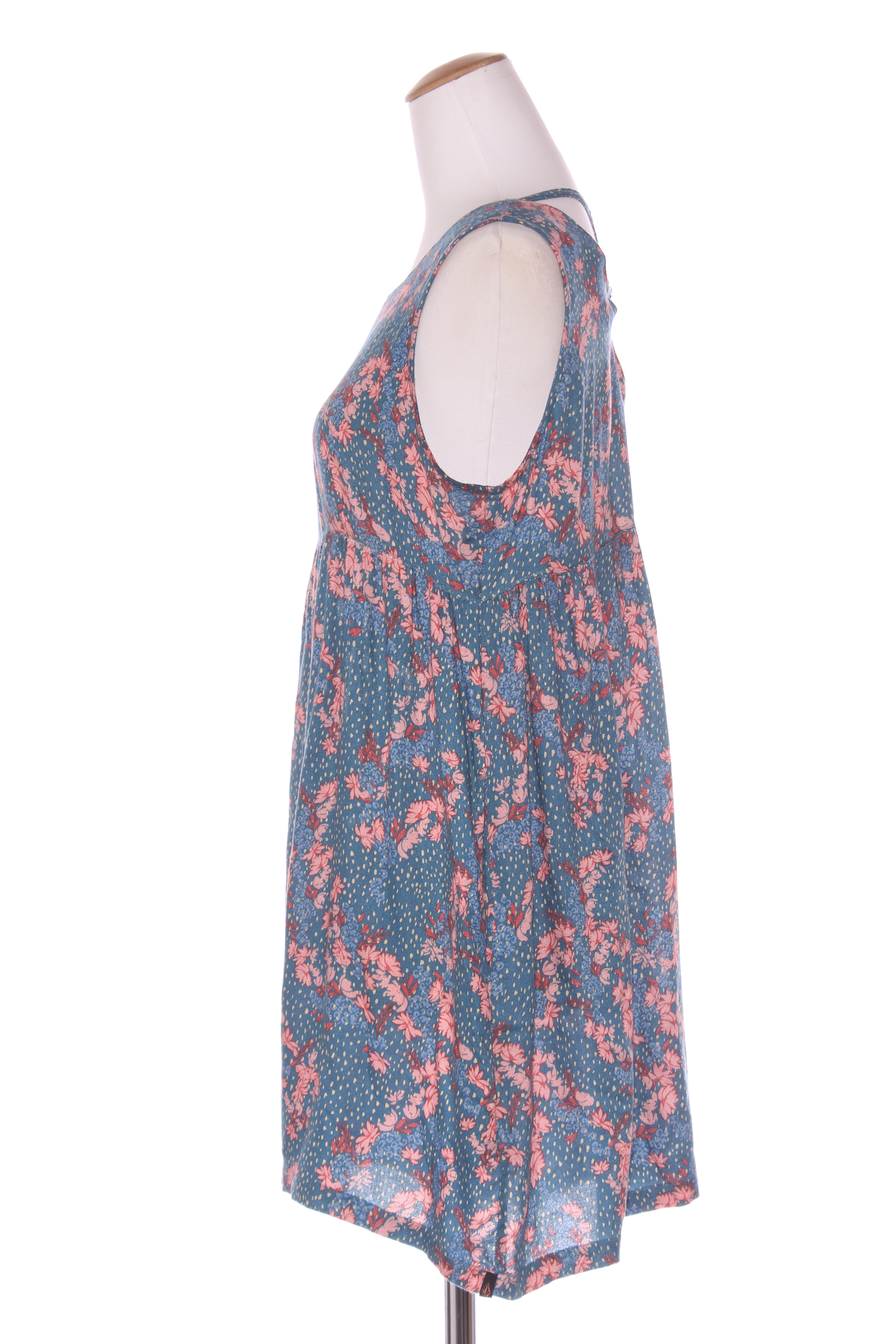 SIZE ON TAG: SFITS LIKE: 10 COLOUR: Blue, pink, multiFABRIC: ViscoseCONDITION: Excellent prelovedMEASUREMENTS:BUST: 52cms WAIST: 47cms LENGTH: 85cmsNOTES: Pull over style. Side pockets. Fabric has some stretch.