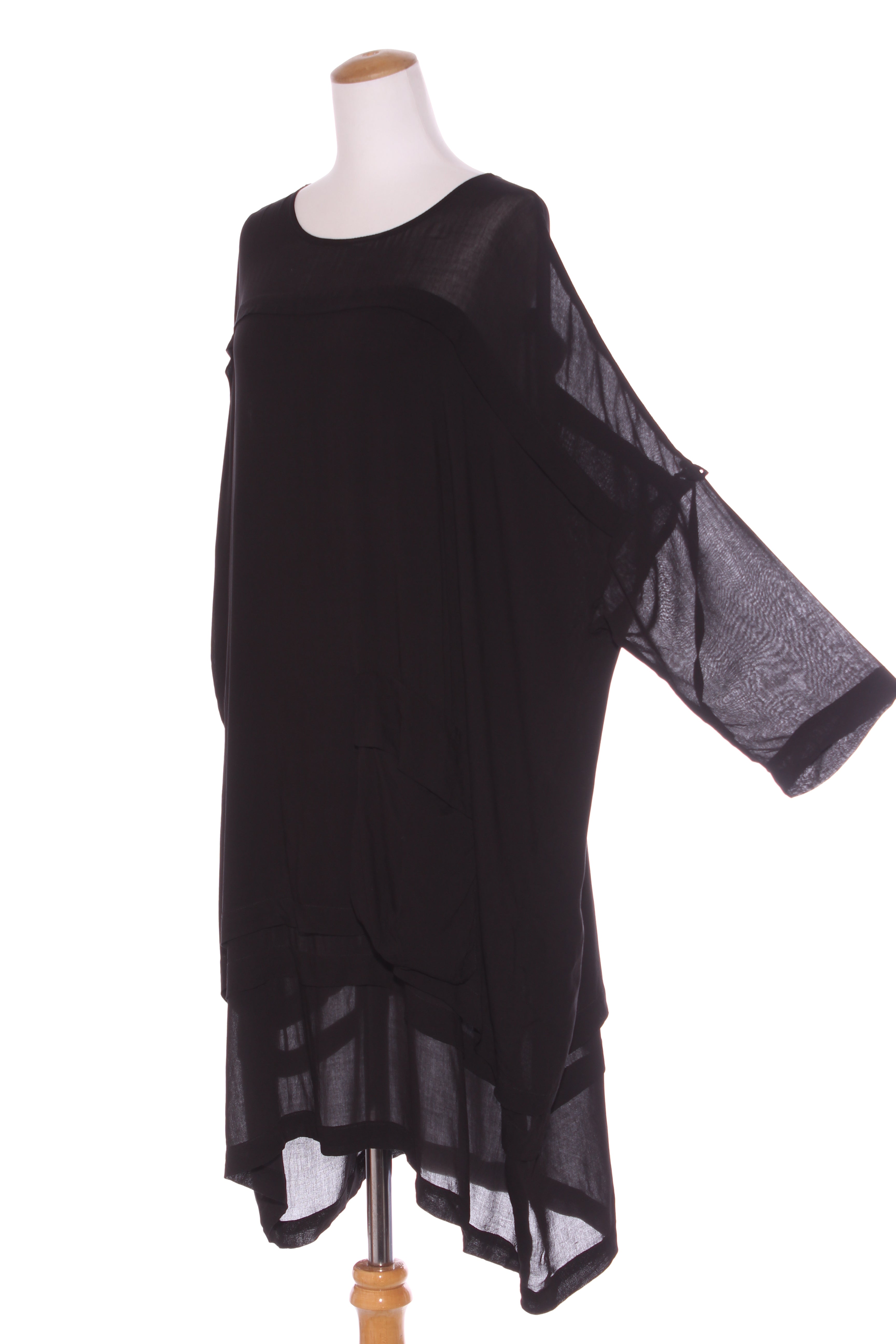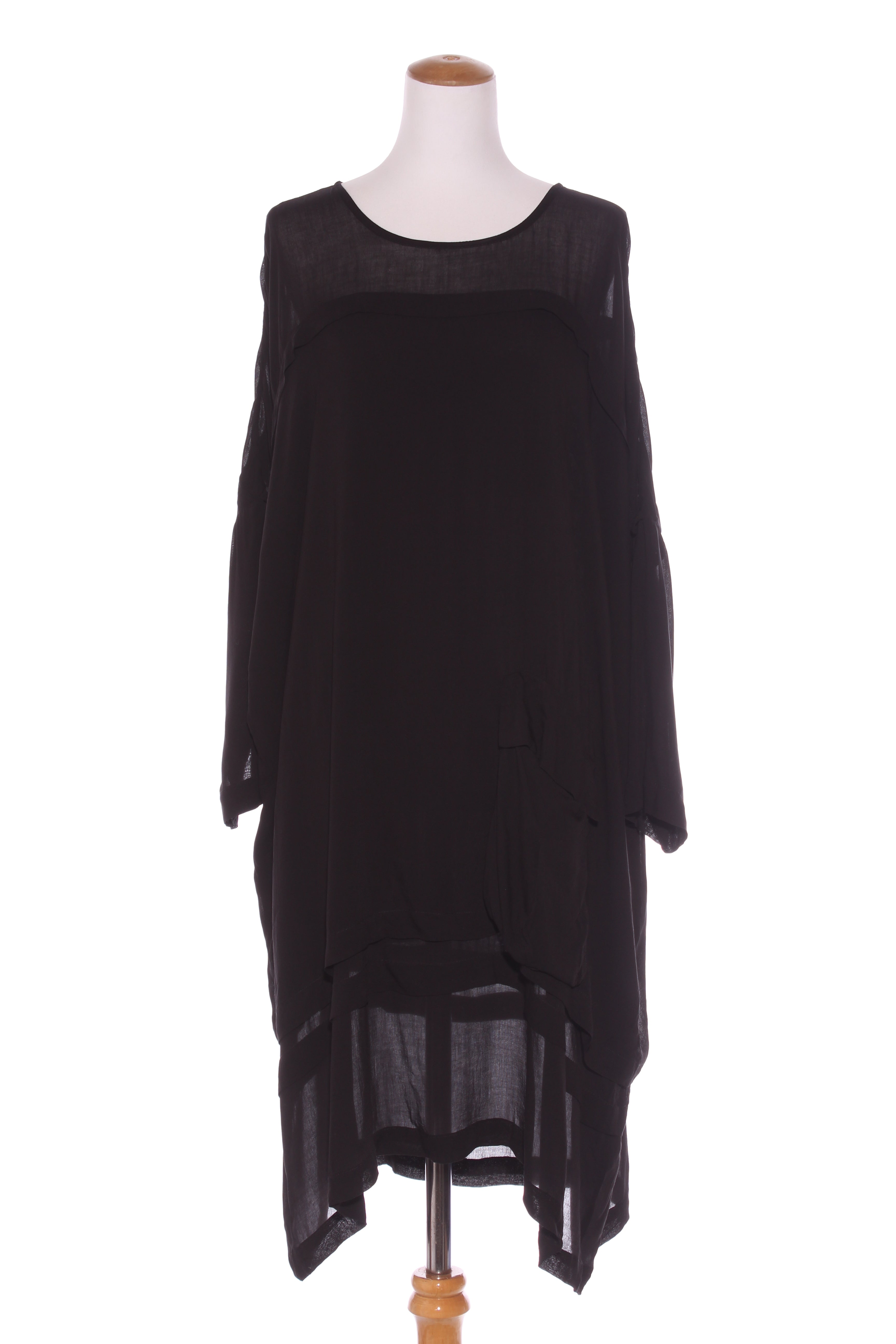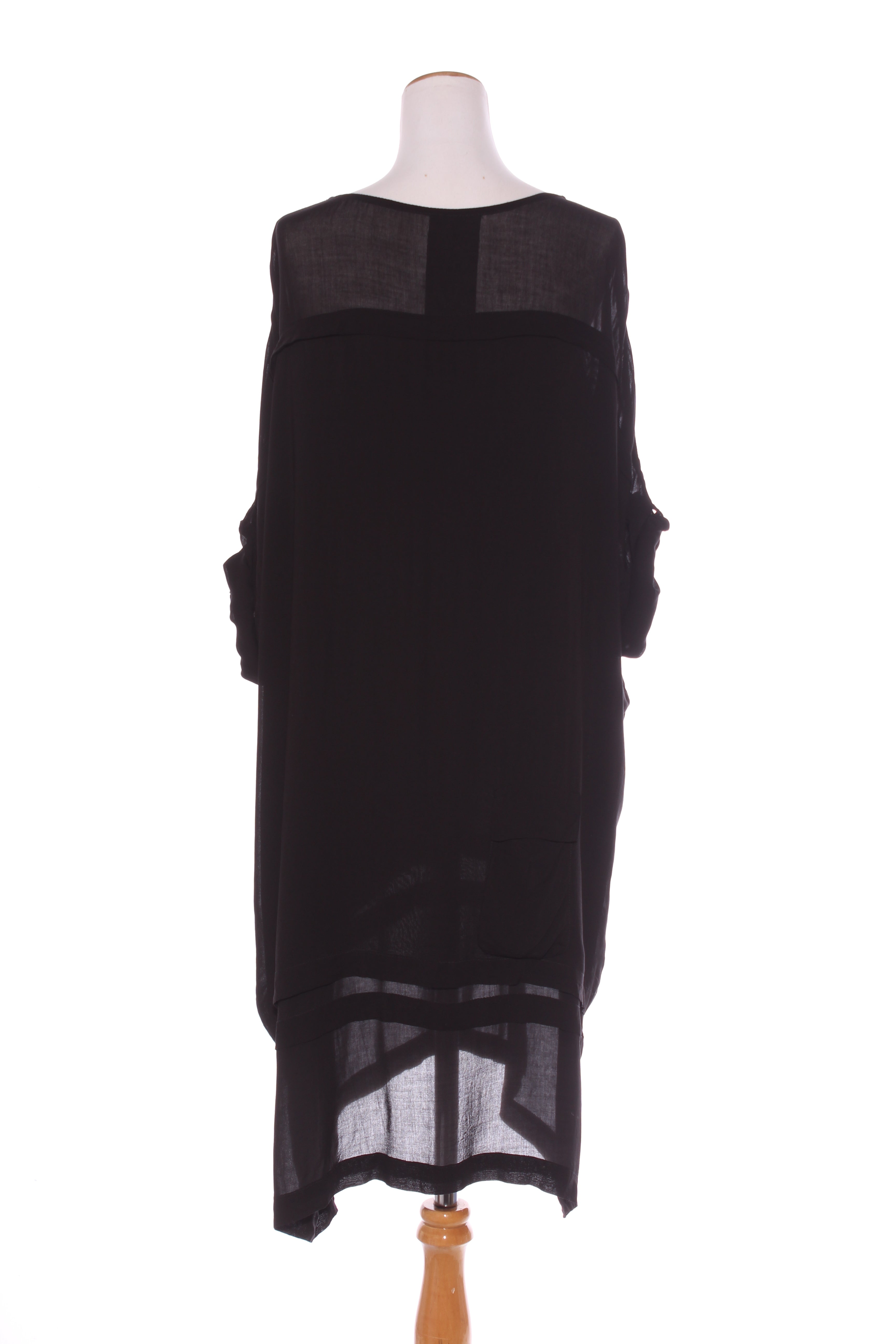 SIZE ON TAG: MFITS LIKE: 12-16COLOUR: BlackFABRIC: ViscoseCONDITION: Excellent prelovedMEASUREMENTS:BUST: 81cms WAIST: 79cms LENGTH: 104-110cmsNOTES: Made in Poland. Pull over style. Has lining. Adjustable sleeve length...