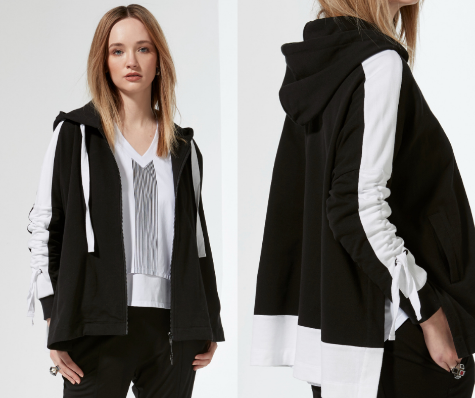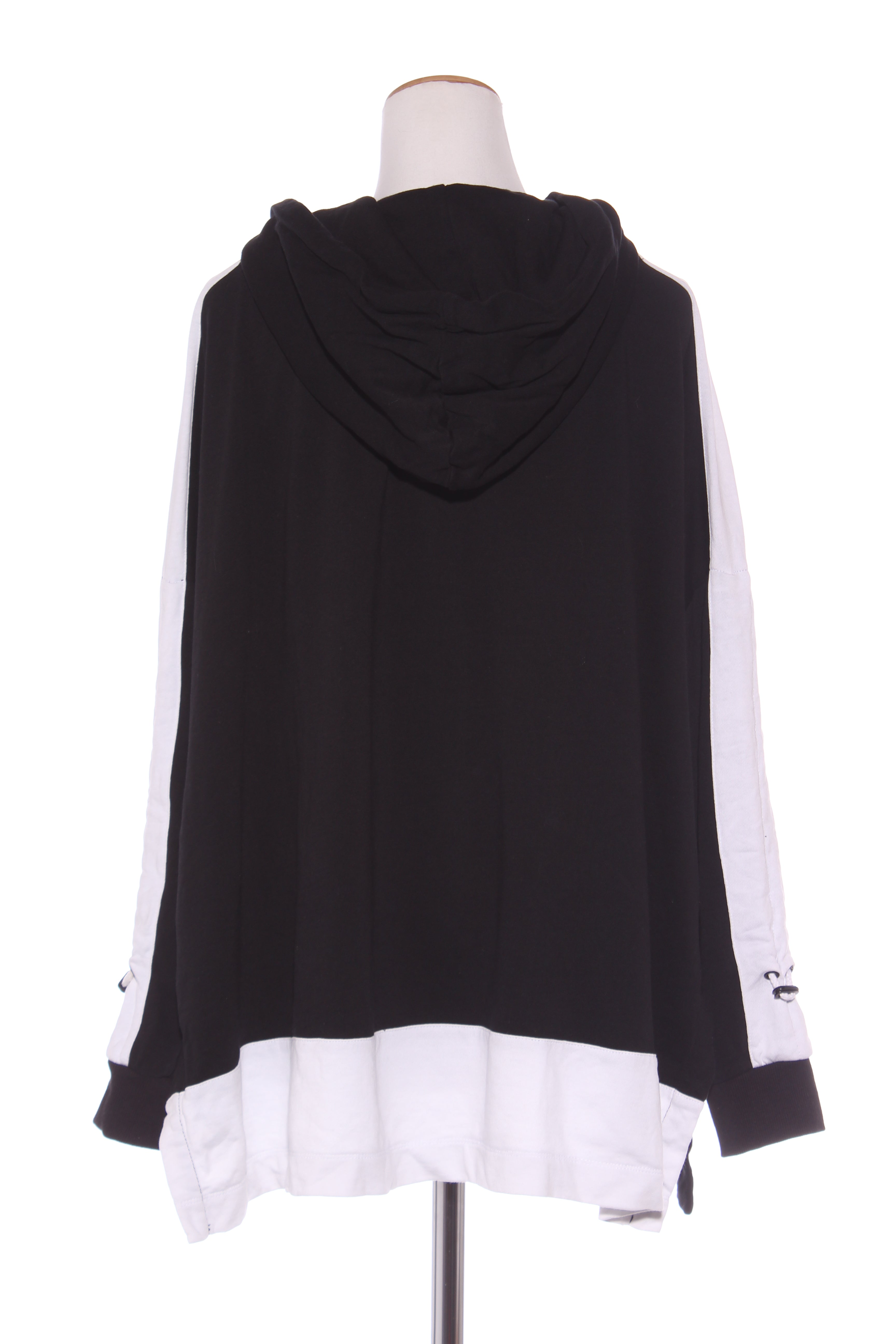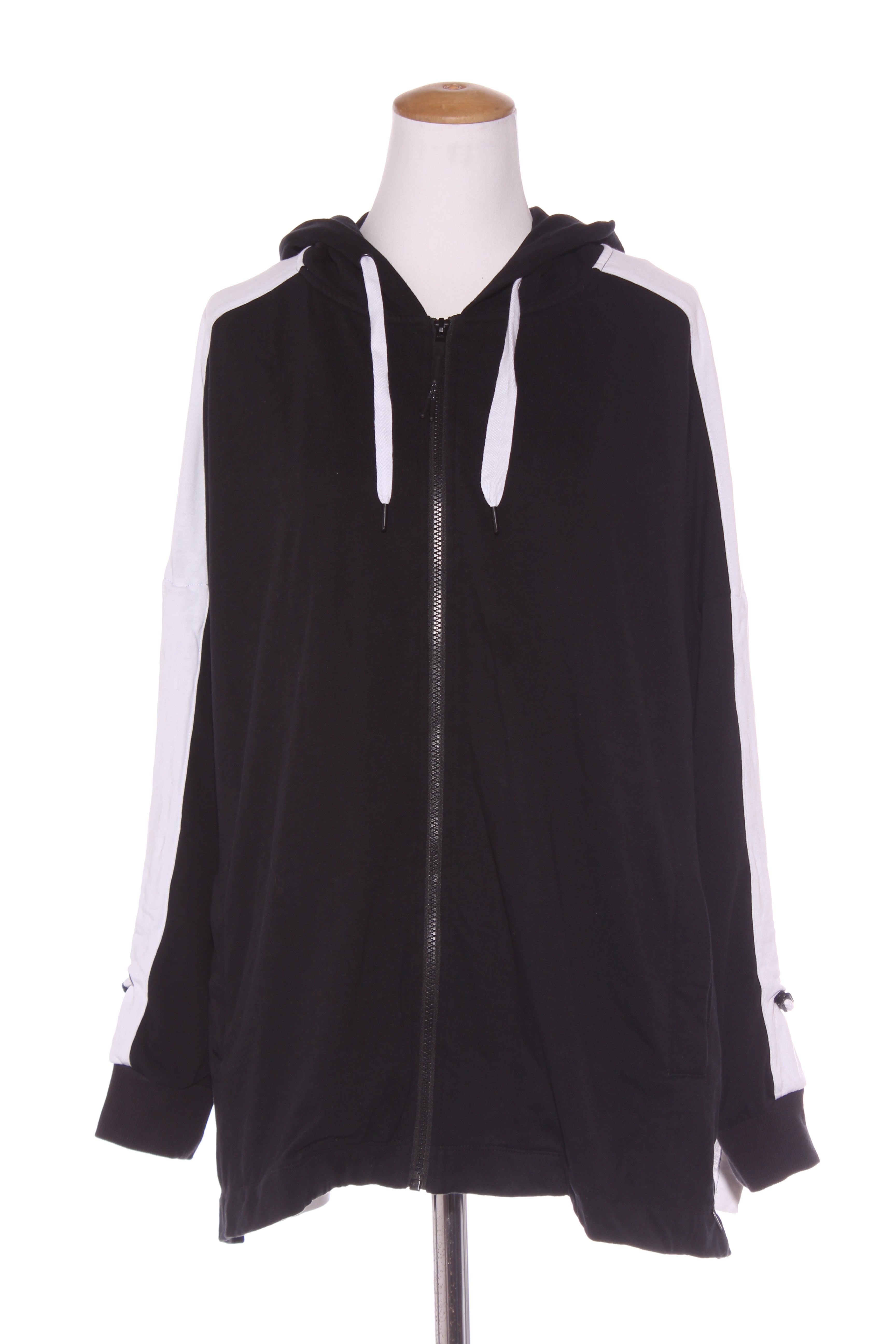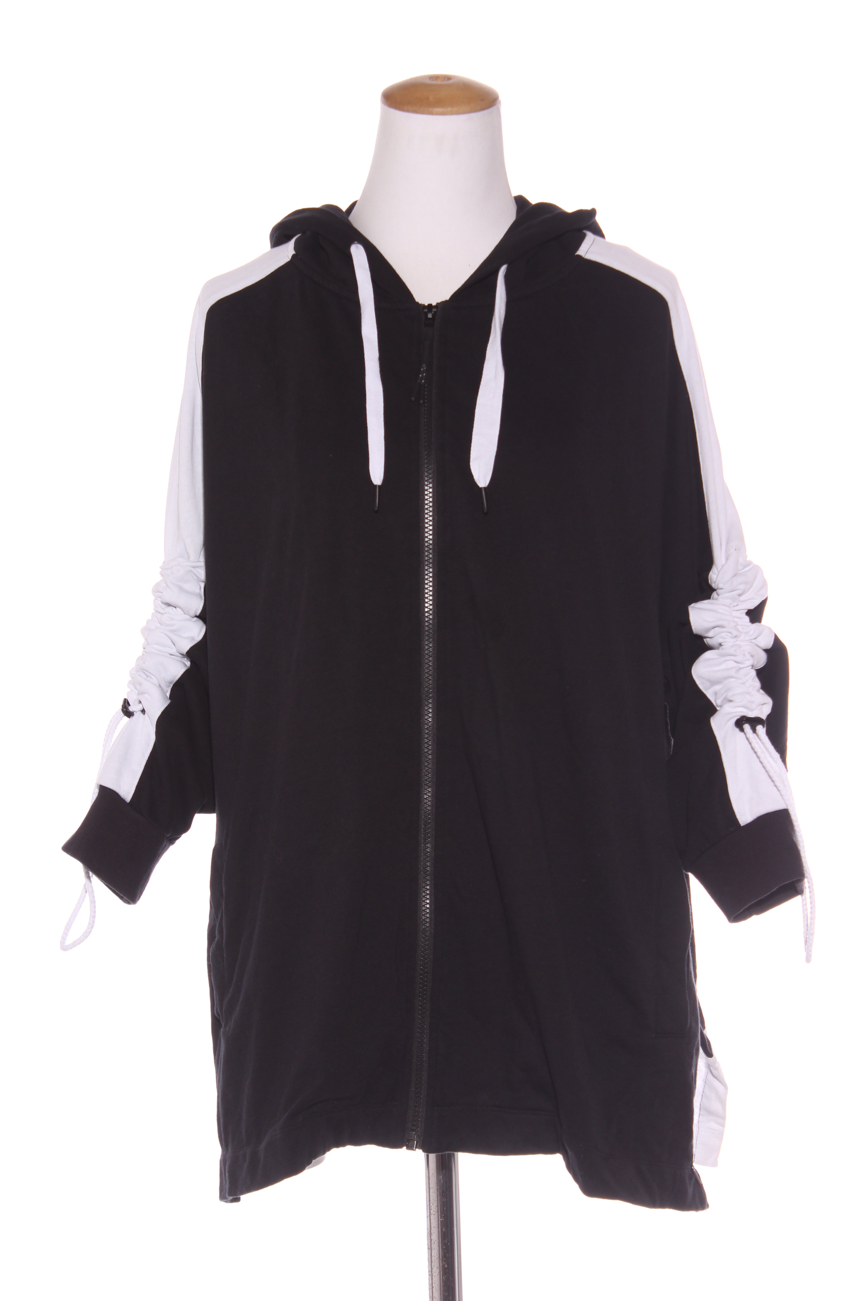 SIZE ON TAG: 2XLFITS LIKE: 18COLOUR: Black, whiteFABRIC: CottonCONDITION: Excellent prelovedMEASUREMENTS:BUST: 76cms WAIST: 78cms LENGTH: 71-73cms NOTES: Drawstring through length of sleeves. Zip up front. Front...