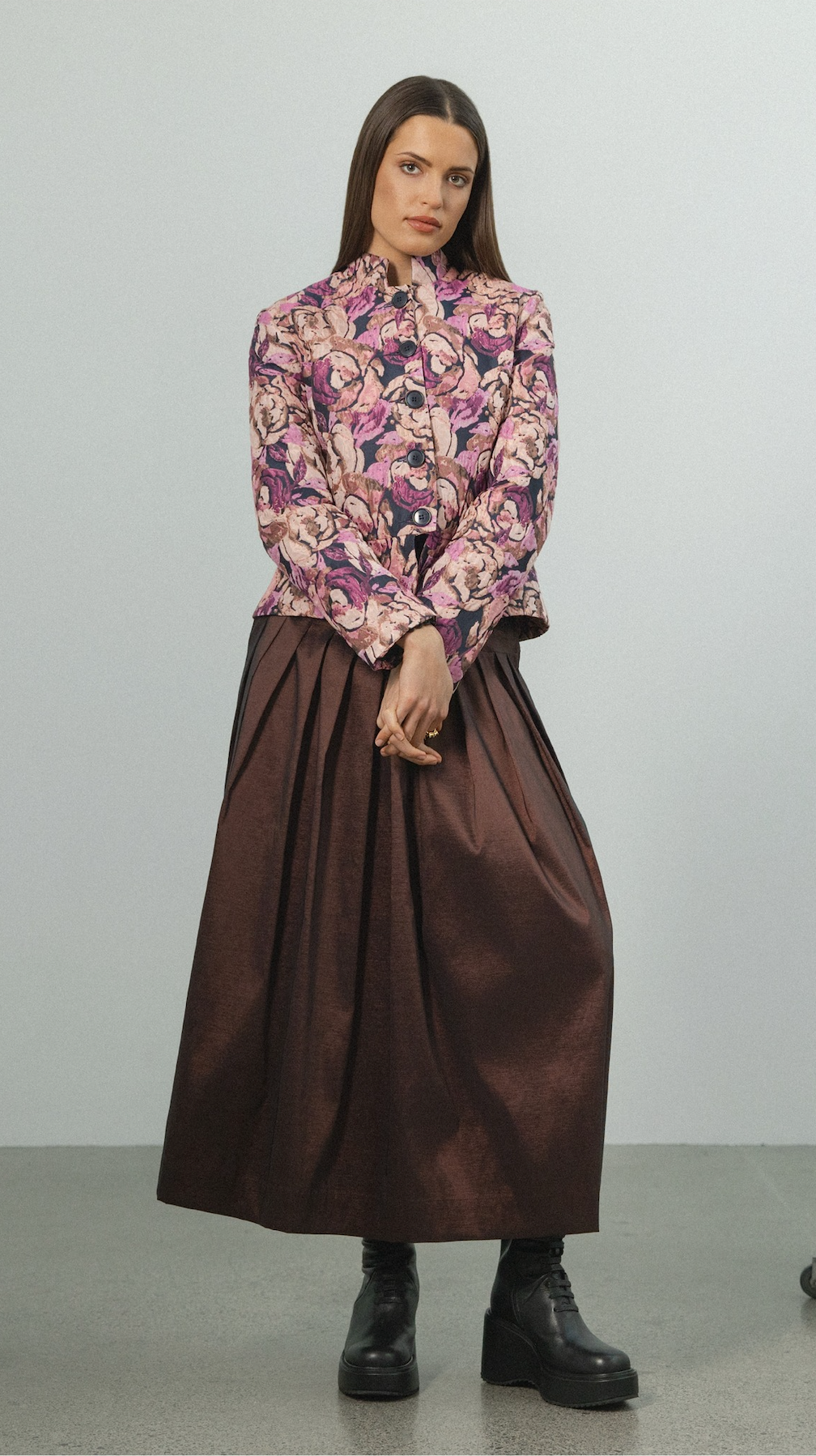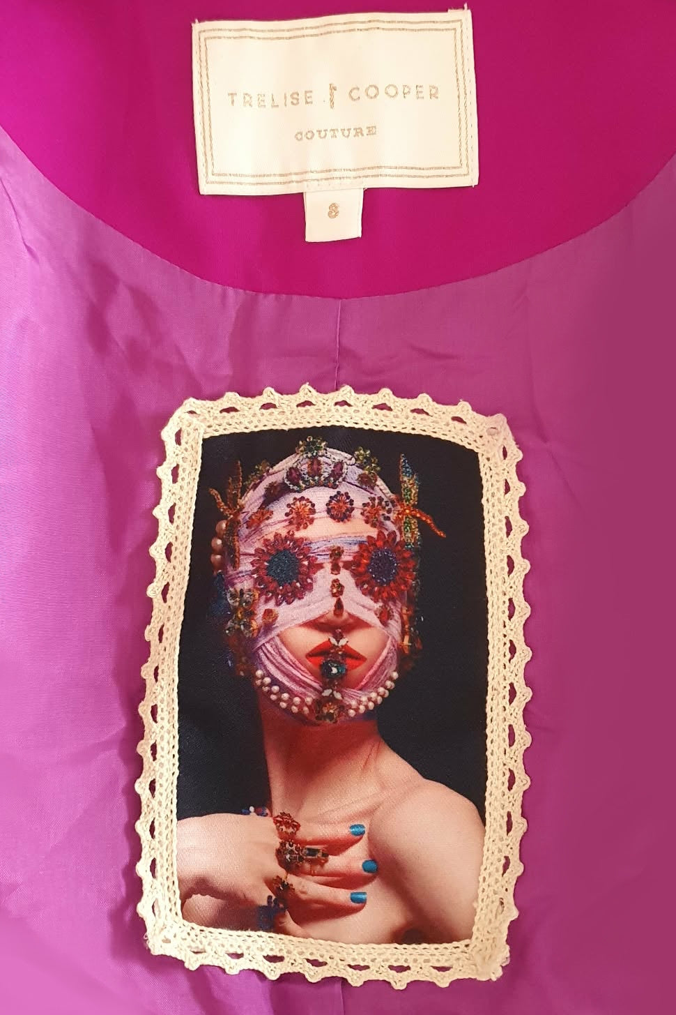 SIZE ON TAG: 12FITS LIKE: N/ACOLOUR: Mulberry, pinkFABRIC: Cotton, nylon, elastaneCONDITION: Excellent prelovedMEASUREMENTS:BUST: 54cms WAIST: 55cms LENGTH: 84cmsNOTES: Hook 'n' eye front fastening. Front pockets. Fabric...