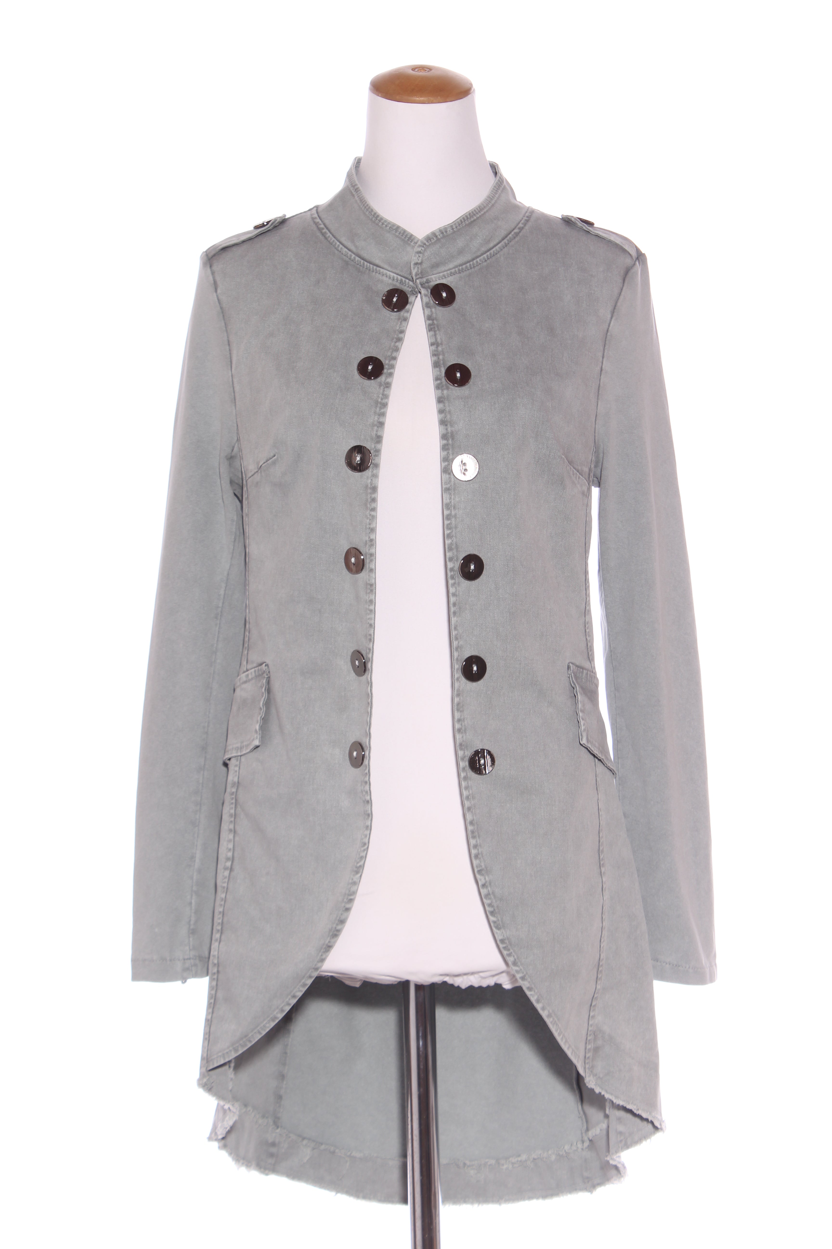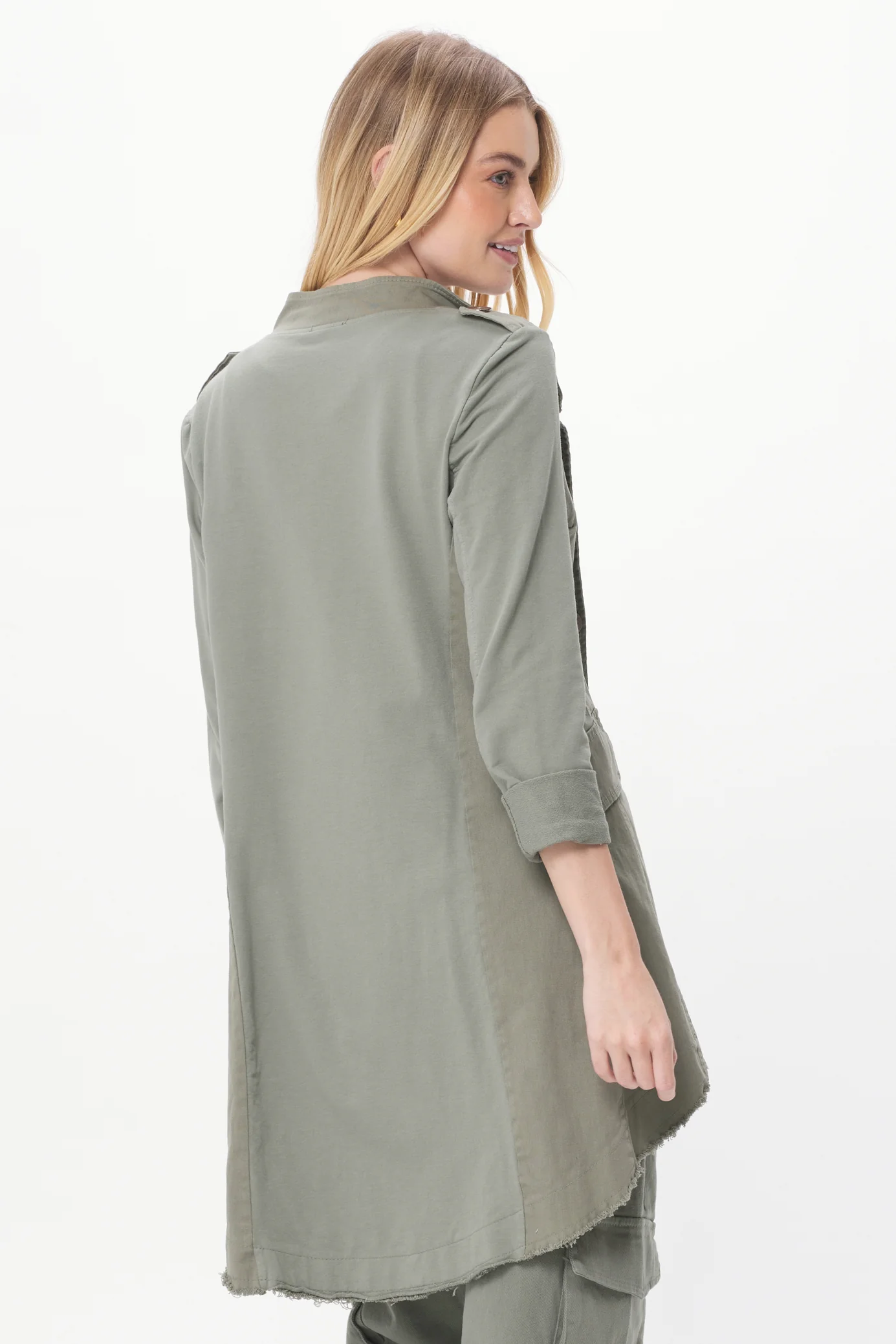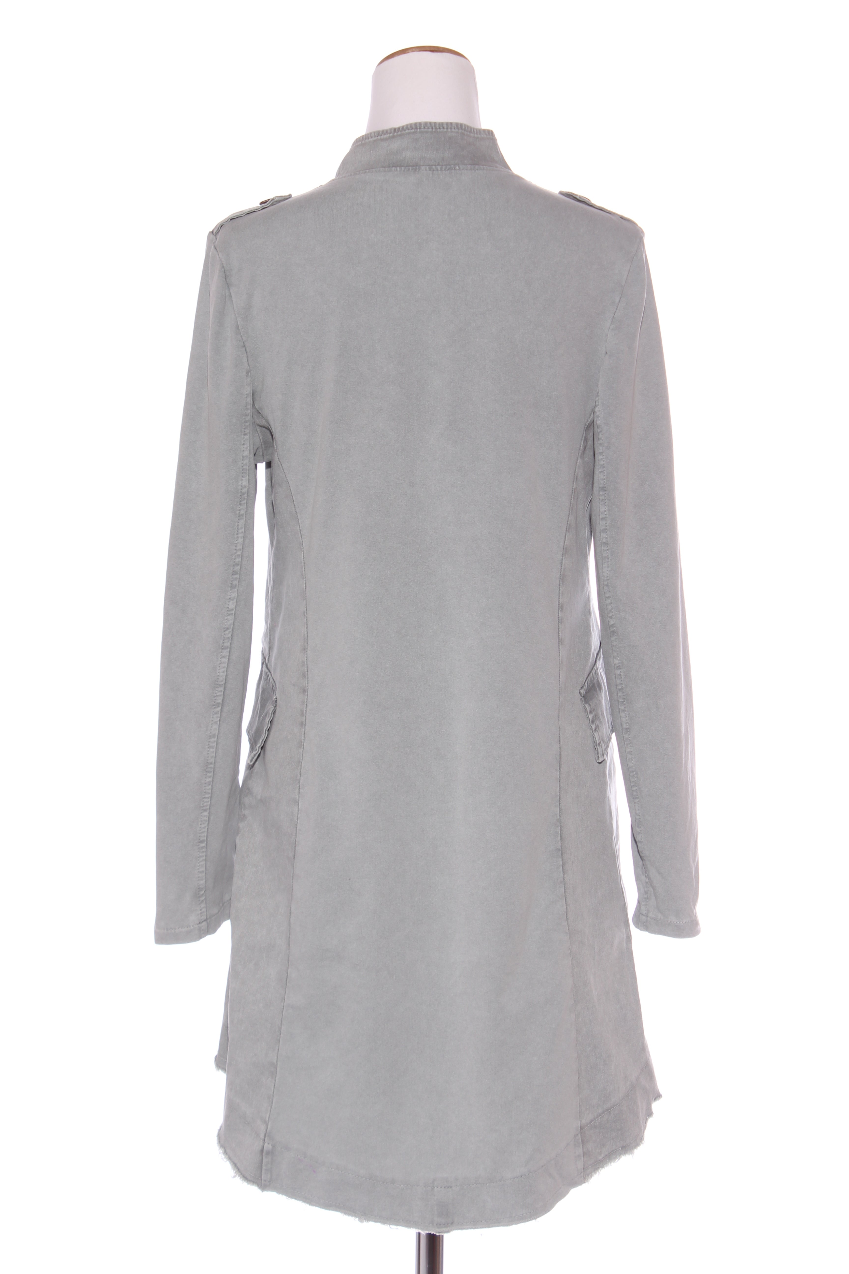 NOTES: Button up front and sleeve ends. Single front pocket. Fabric has some stretch.