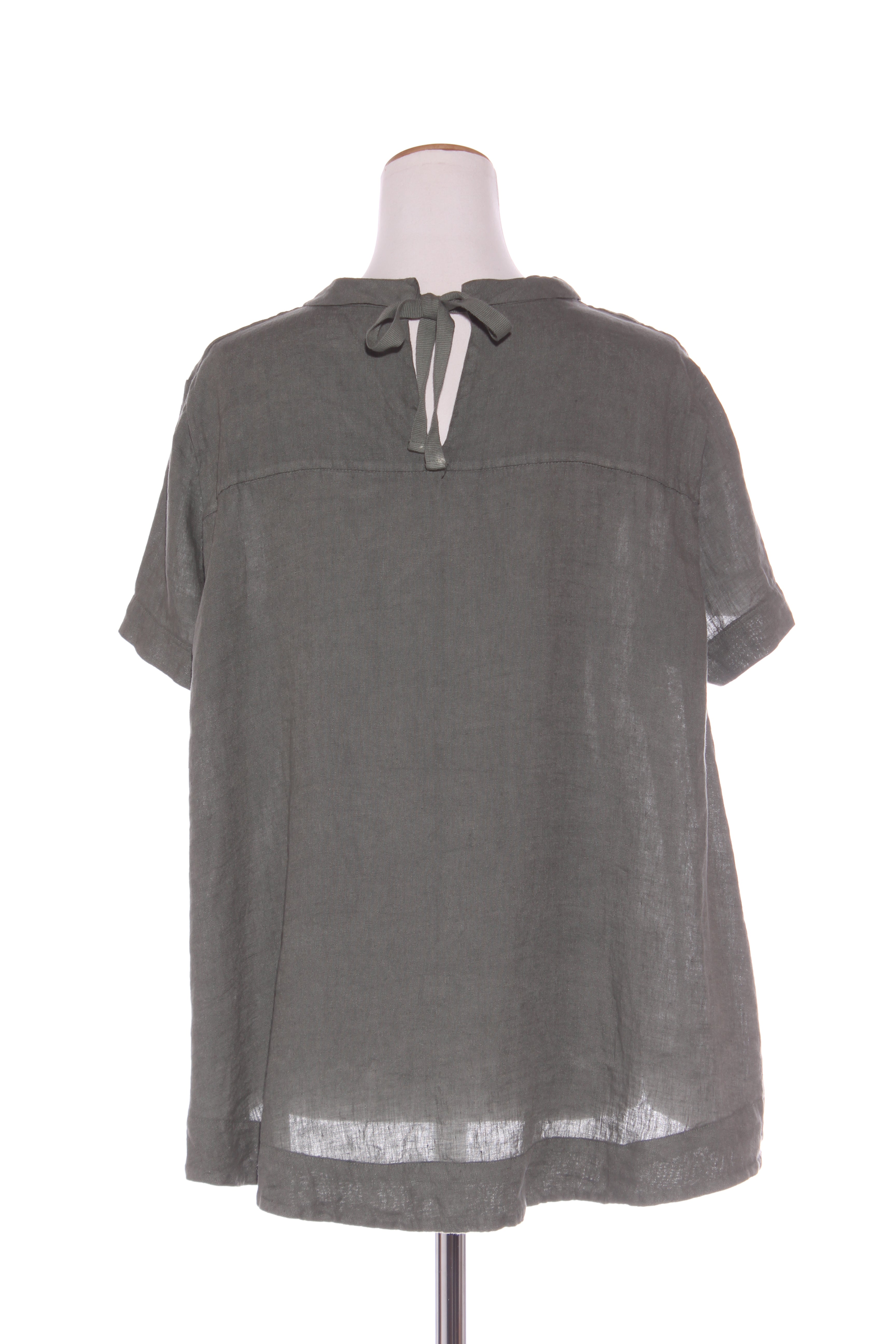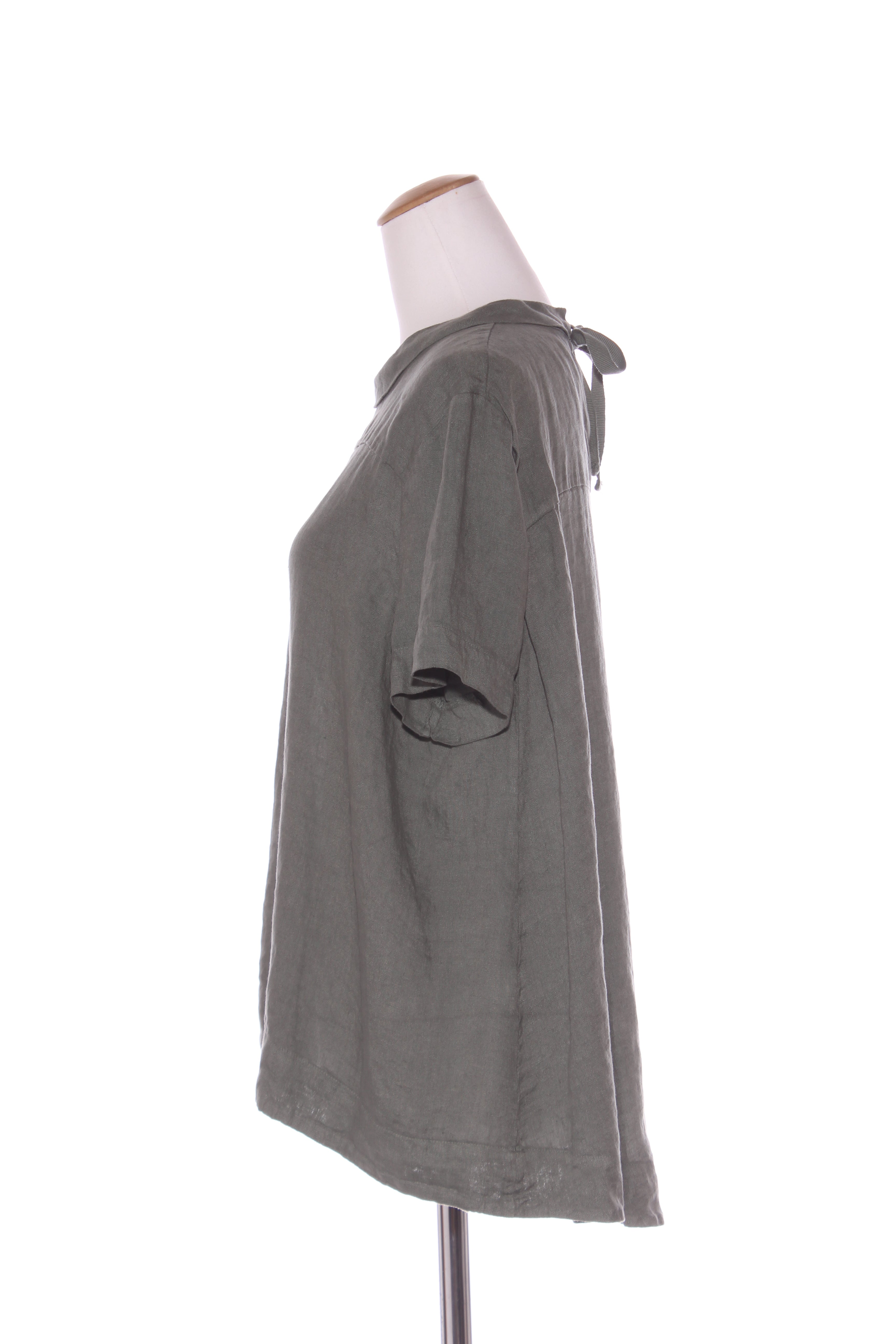 SIZE ON TAG: Not statedFITS LIKE: 12-16COLOUR: Clay greenFABRIC: LinenCONDITION: Excellent prelovedMEASUREMENTS:BUST: 65cms WAIST: 69cms LENGTH: 64-75cmsNOTES: Made in Italy. Ties at nape of neck.