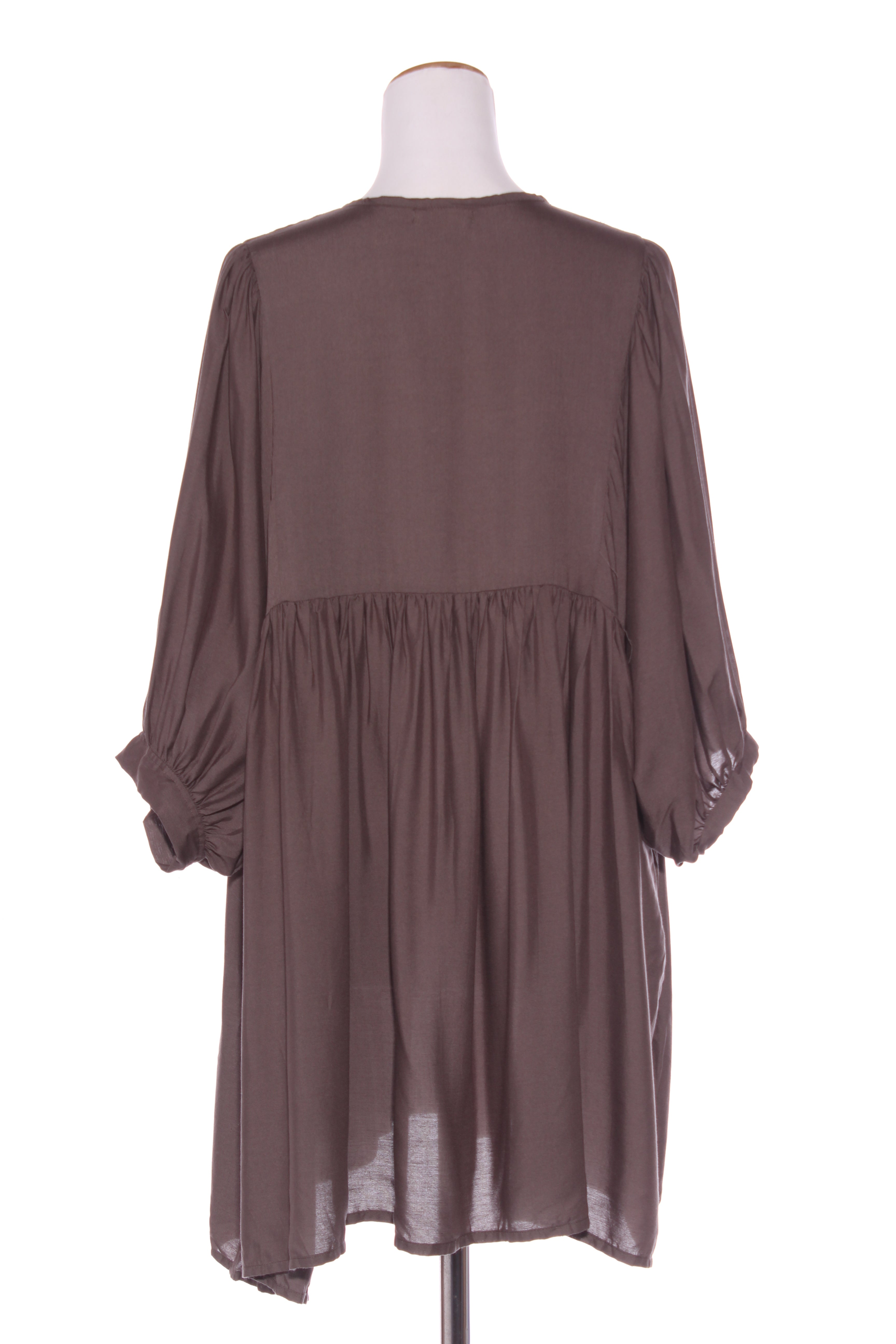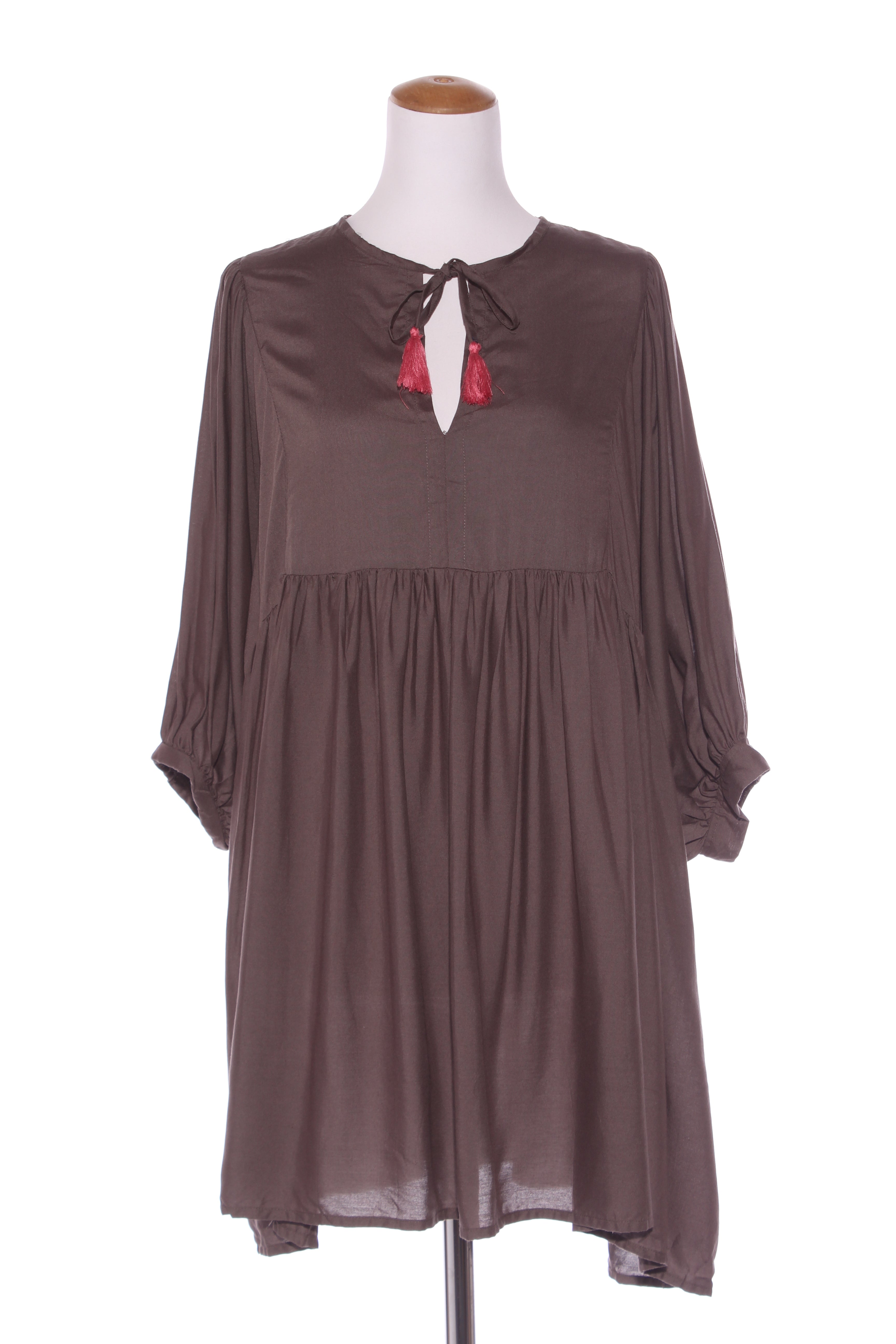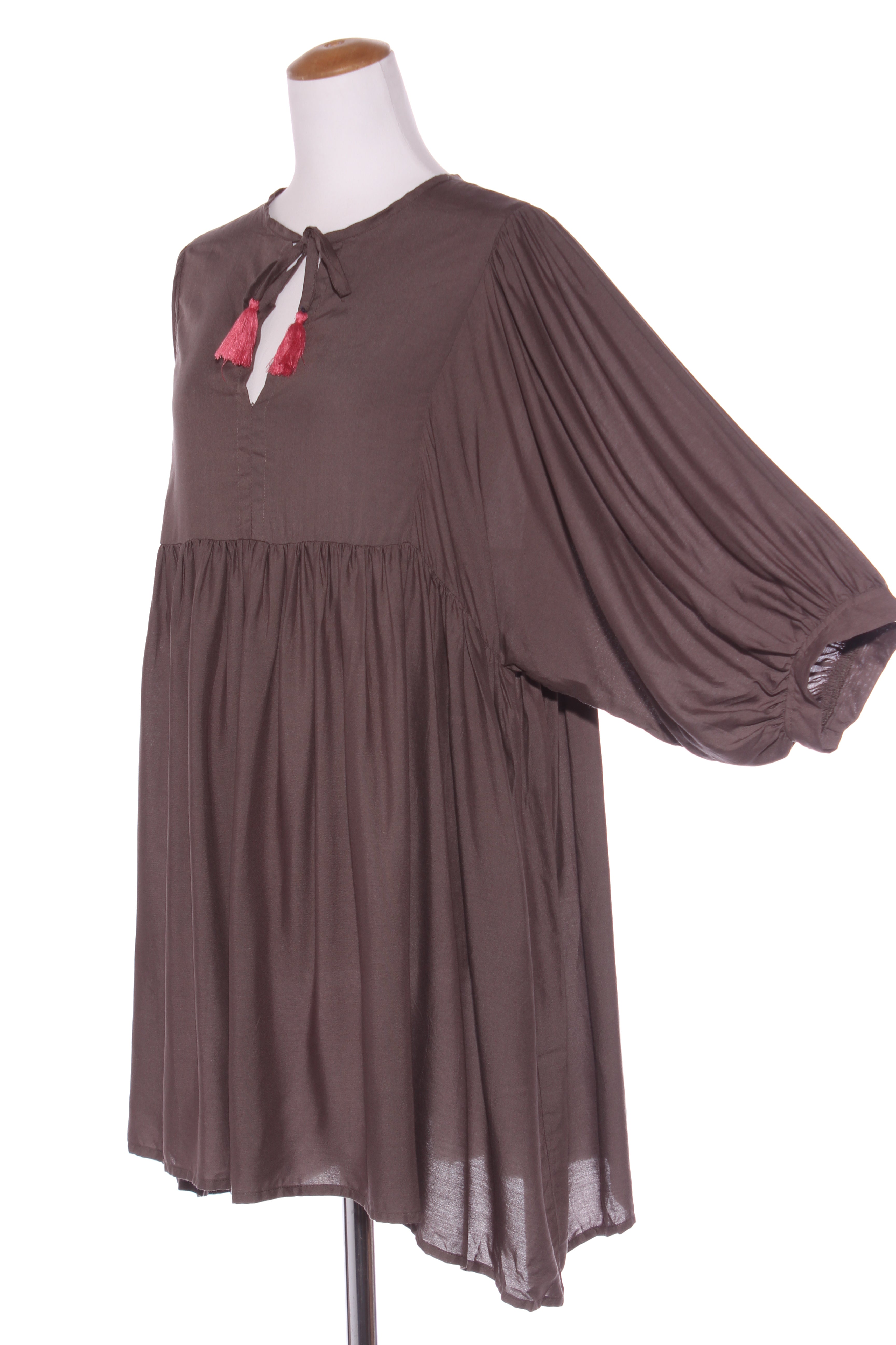 SIZE ON TAG: 12FITS LIKE: 10-16COLOUR: TaupeFABRIC: No tag, rayon?CONDITION: Excellent prelovedMEASUREMENTS:BUST: Free WAIST: 59cms LENGTH: 89cmsNOTES: Ties at front of neckline. Billow sleeve ends.