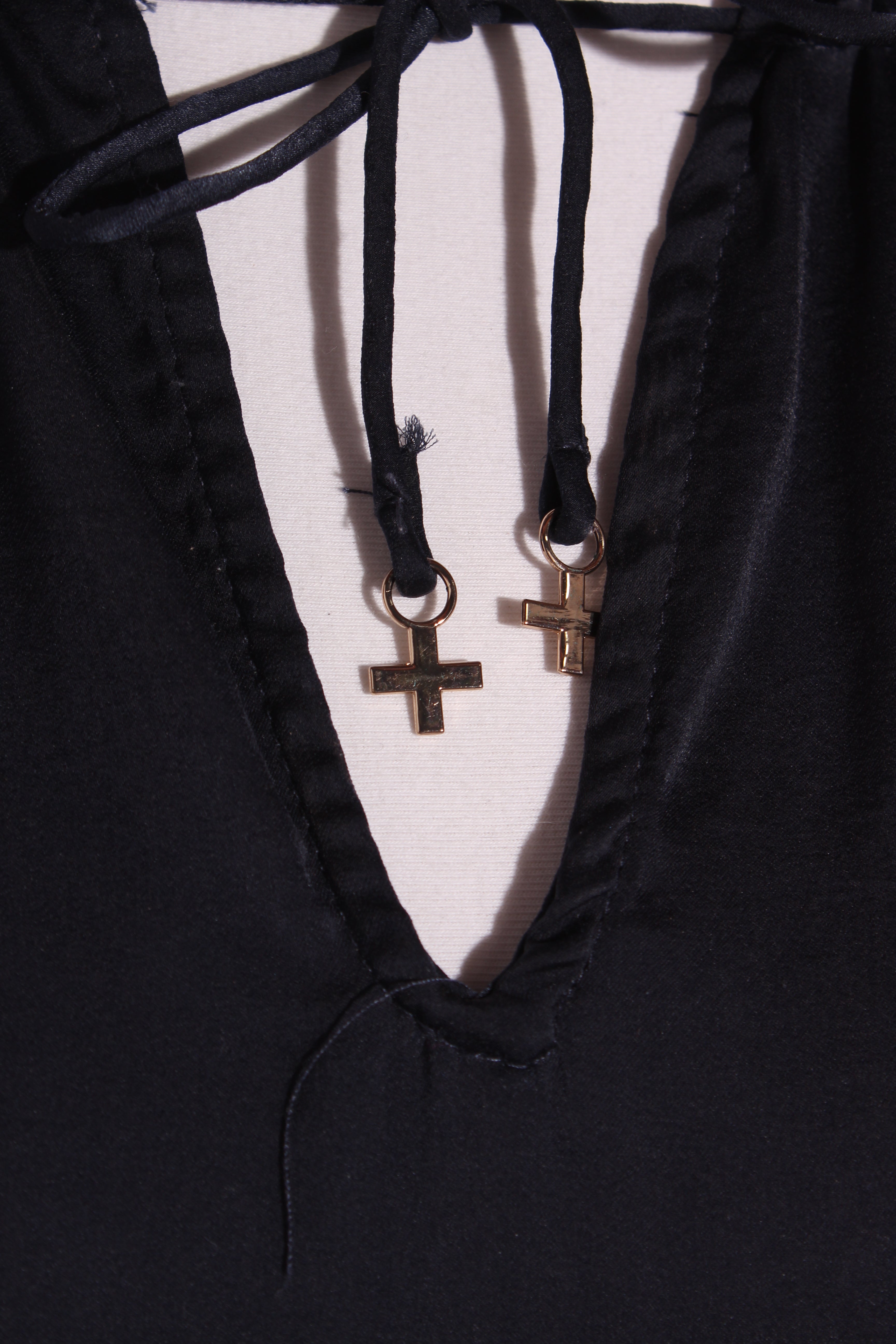 SIZE ON TAG: 10FITS LIKE: N/ACOLOUR: BlackFABRIC: ViscoseCONDITION: Excellent prelovedMEASUREMENTS:BUST: 55cms WAIST: 54cms LENGTH: 70cmsNOTES: Hook 'n' eye and ties at nape of neck. Elasticated sleeve...
