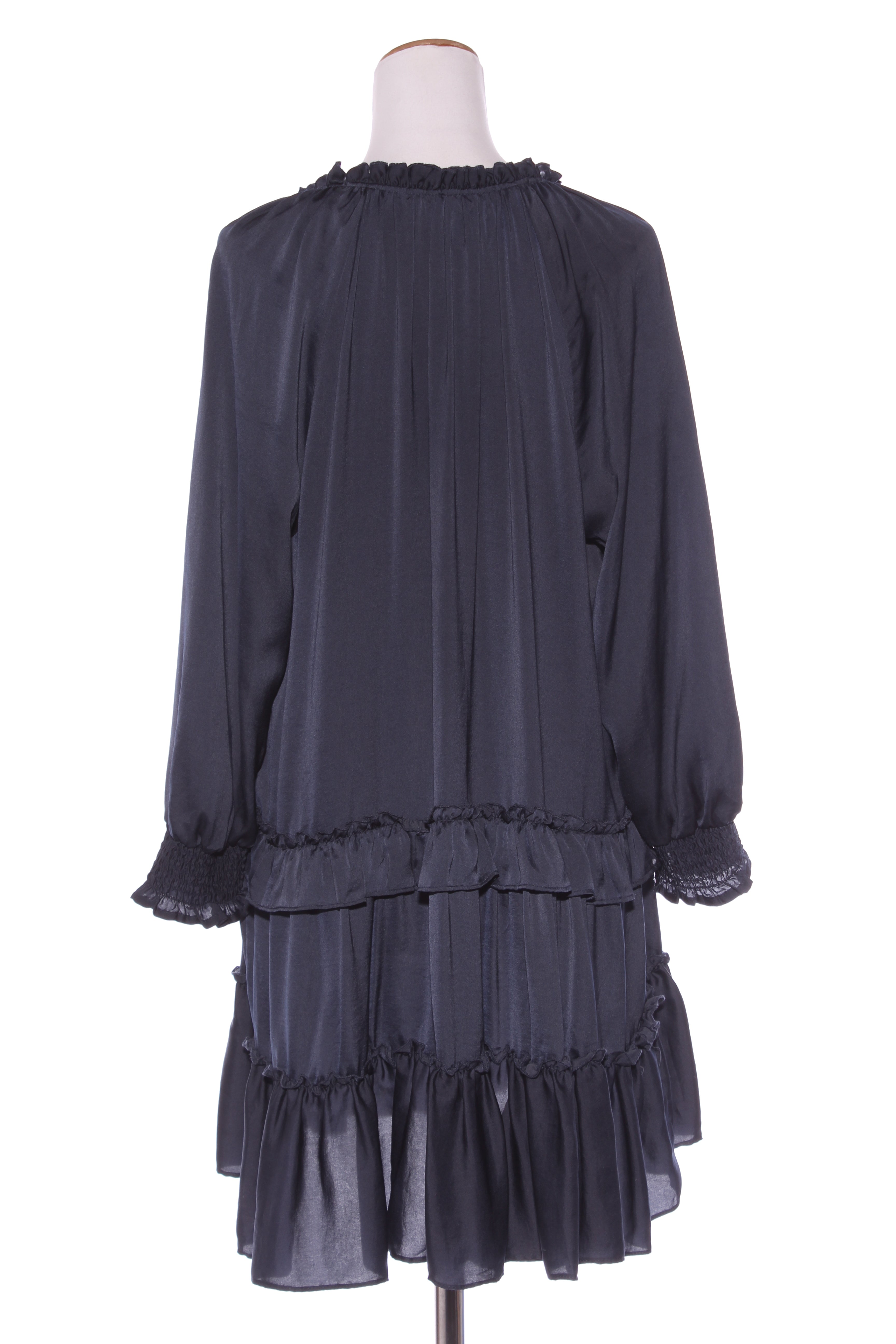 SIZE ON TAG: 16FITS LIKE: N/ACOLOUR: Navy blueFABRIC: PolyesterCONDITION: Very good prelovedMEASUREMENTS:BUST: 59cms WAIST: 61cms LENGTH: 92-98cmsNOTES: Ties at front of neckline. Elasticated sleeve ends.