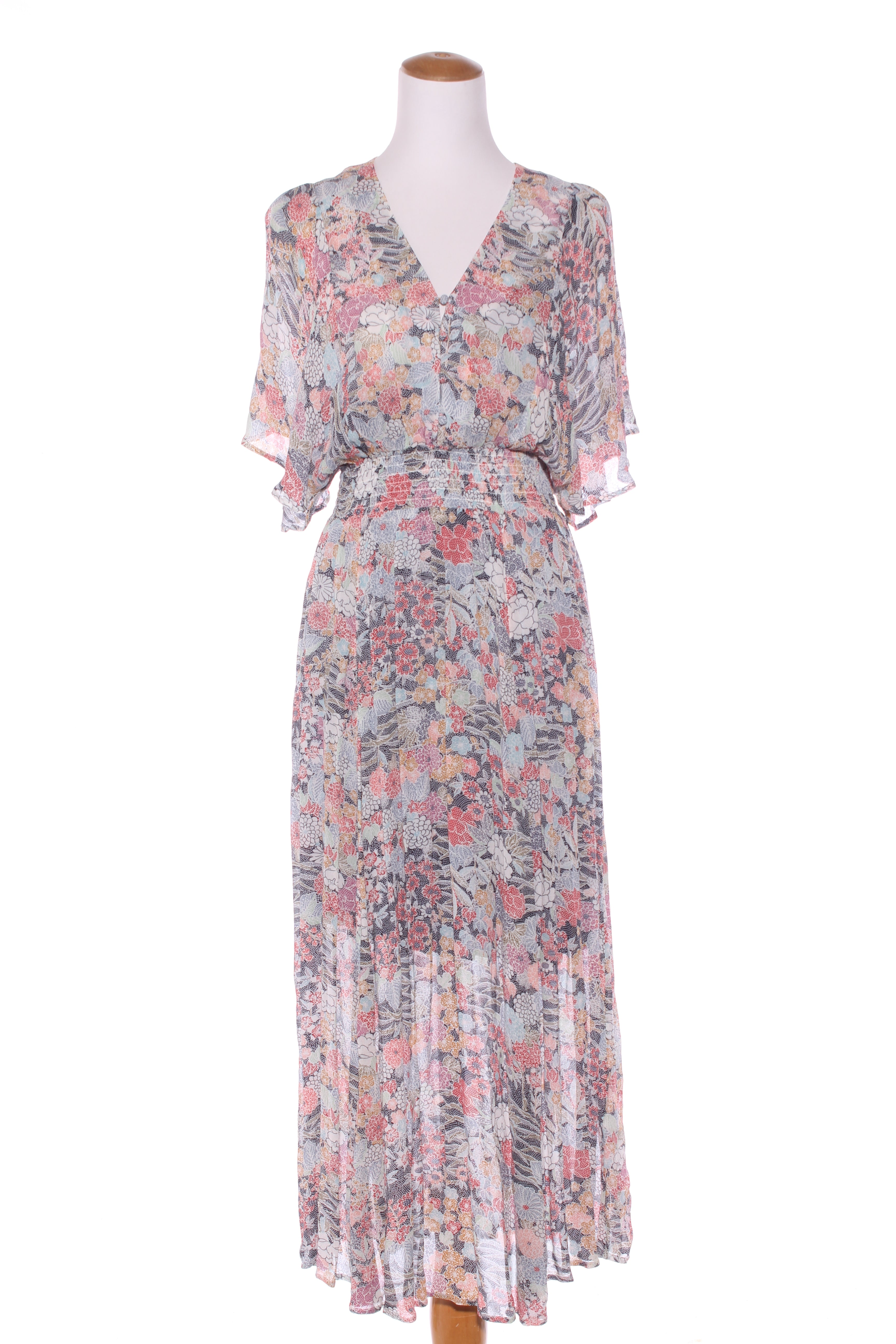 SIZE ON TAG: 14FITS LIKE: N/ACOLOUR: Blue, multi, pinkFABRIC: 80% rayon, 20% polyesterCONDITION: Excellent prelovedMEASUREMENTS:BUST: 50cms WAIST: 45cms LENGTH: 112-134cmsNOTES: Back zip access. Cross over front...