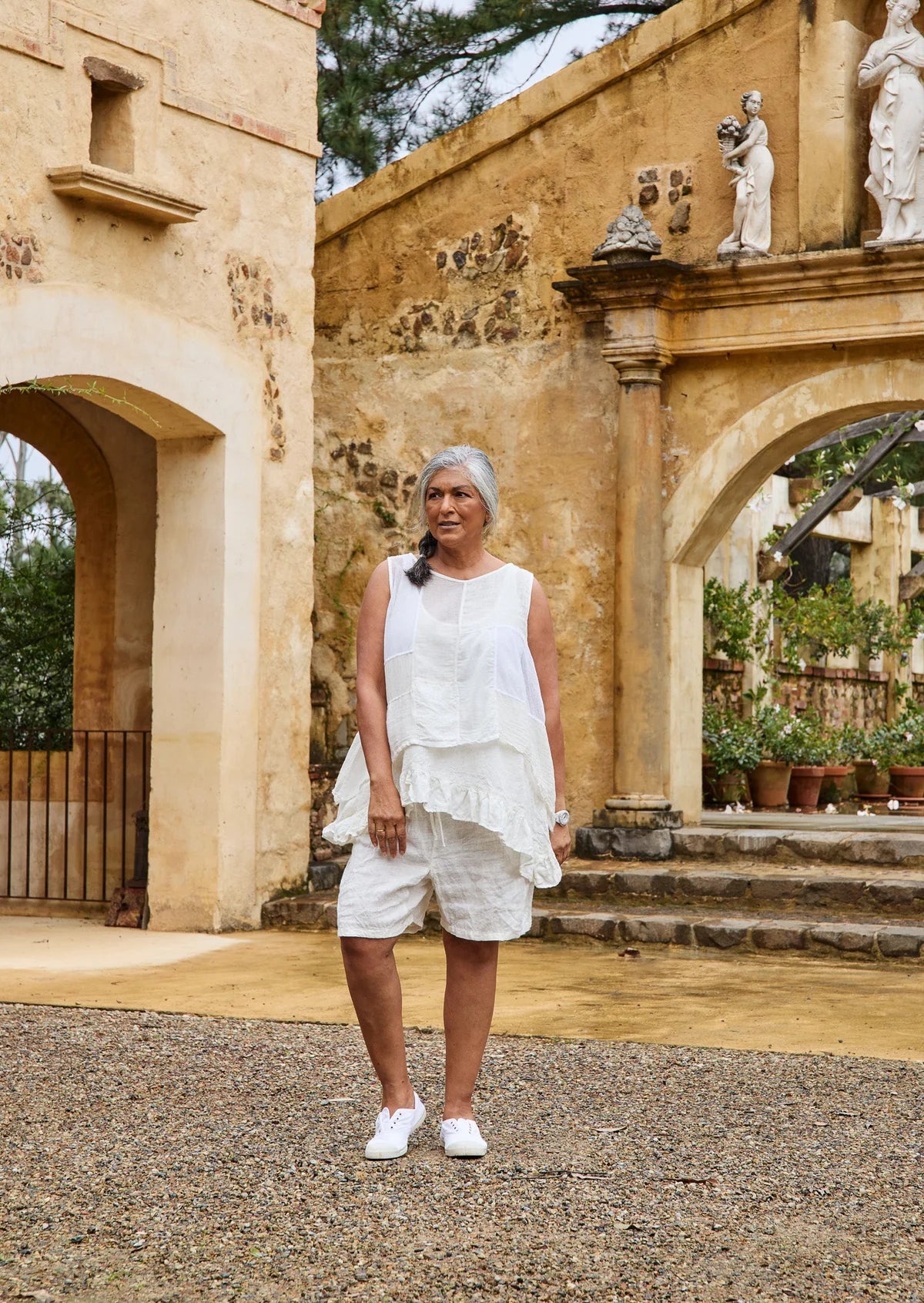 SIZE ON TAG: 10FITS LIKE: N/ACOLOUR: WhiteFABRIC: CottonCONDITION: Excellent prelovedMEASUREMENTS:BUST: 53cms WAIST: 52cms LENGTH: 67cmsNOTES: Fabric has stretch.