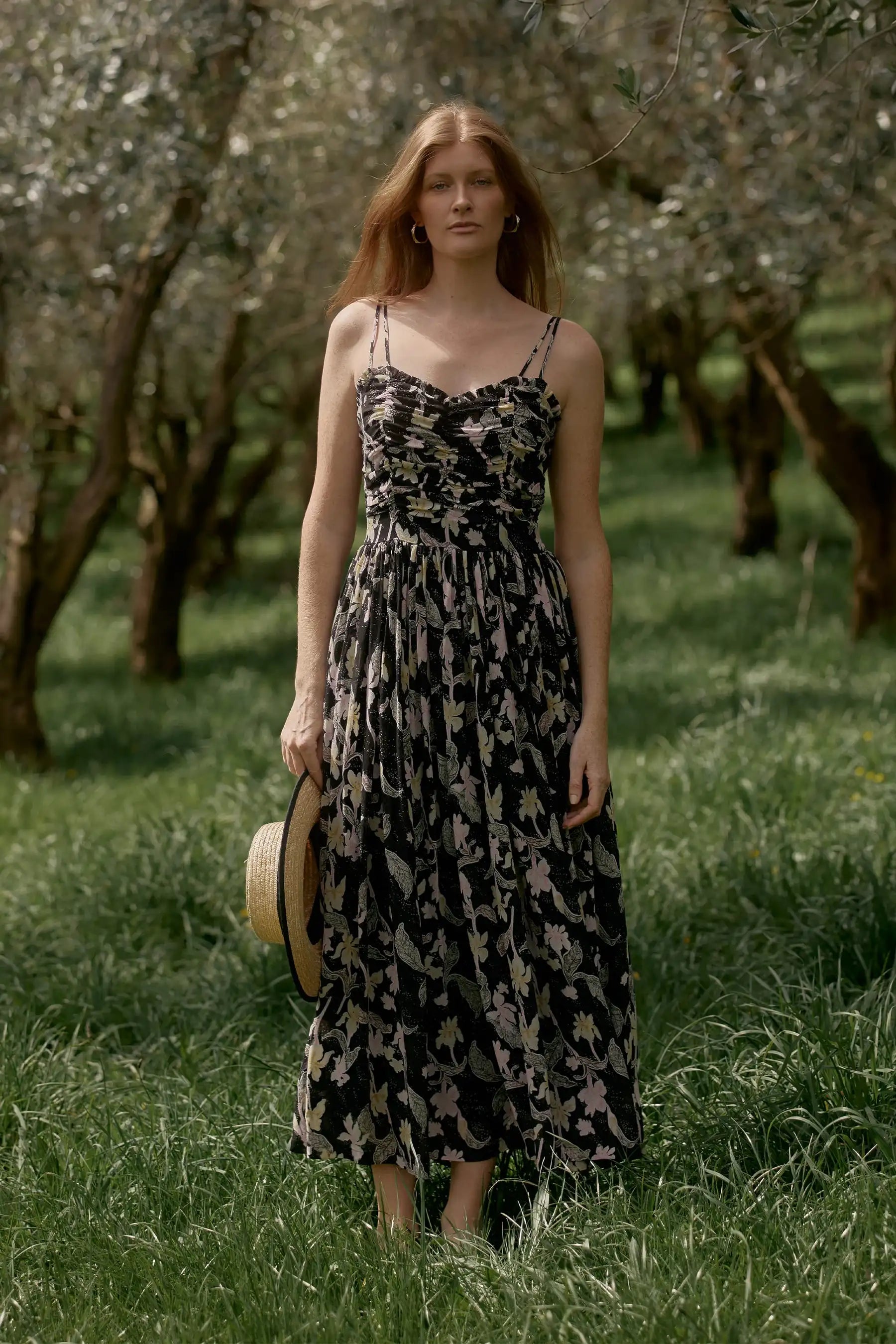 SIZE ON TAG: 12FITS LIKE: N/ACOLOUR: Multi, blackFABRIC: ViscoseCONDITION: Excellent prelovedMEASUREMENTS:BUST: 47cms WAIST: 39cms LENGTH: 143cms NOTES: Ready for your occasion, the Quinn Gather Detail Dress...