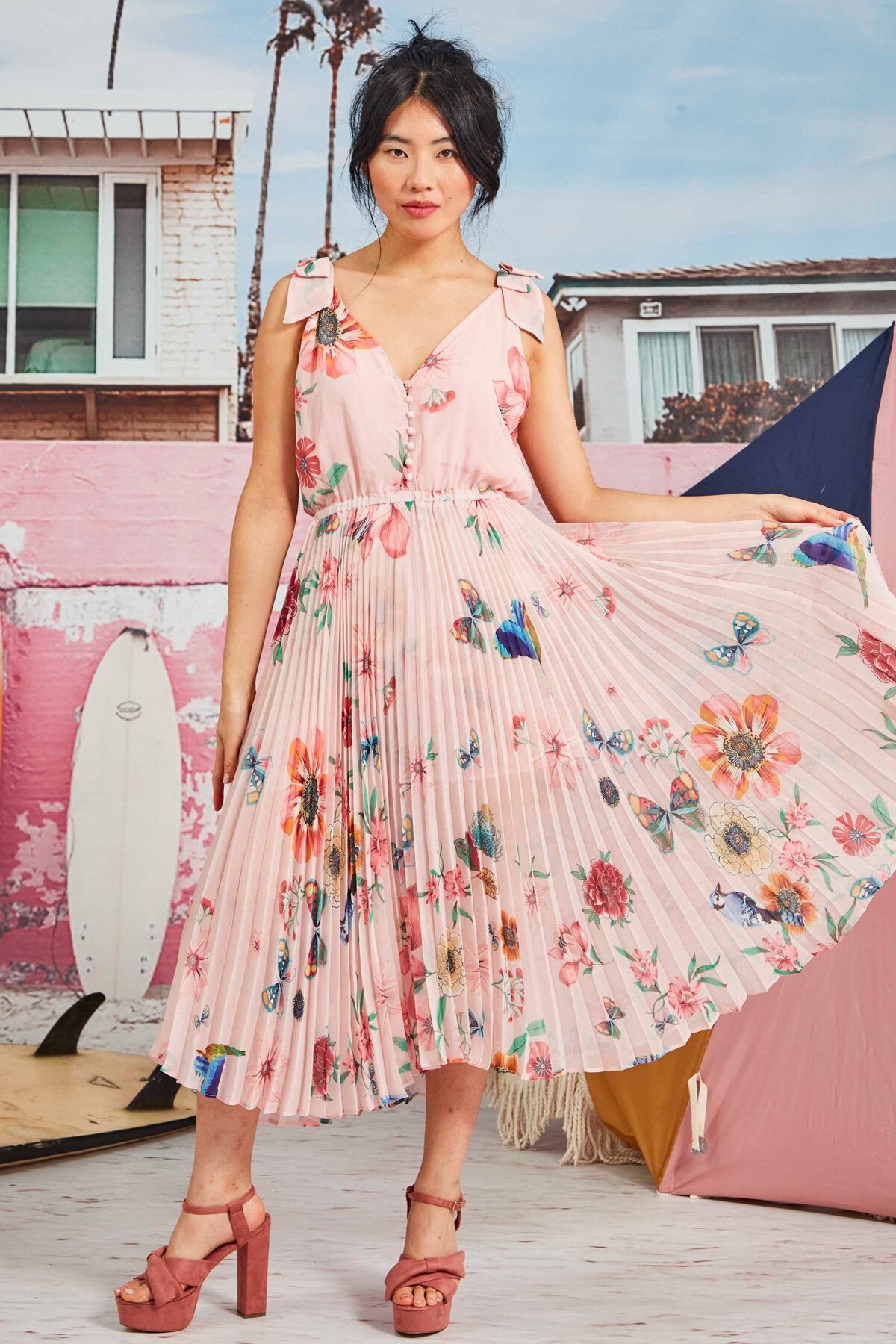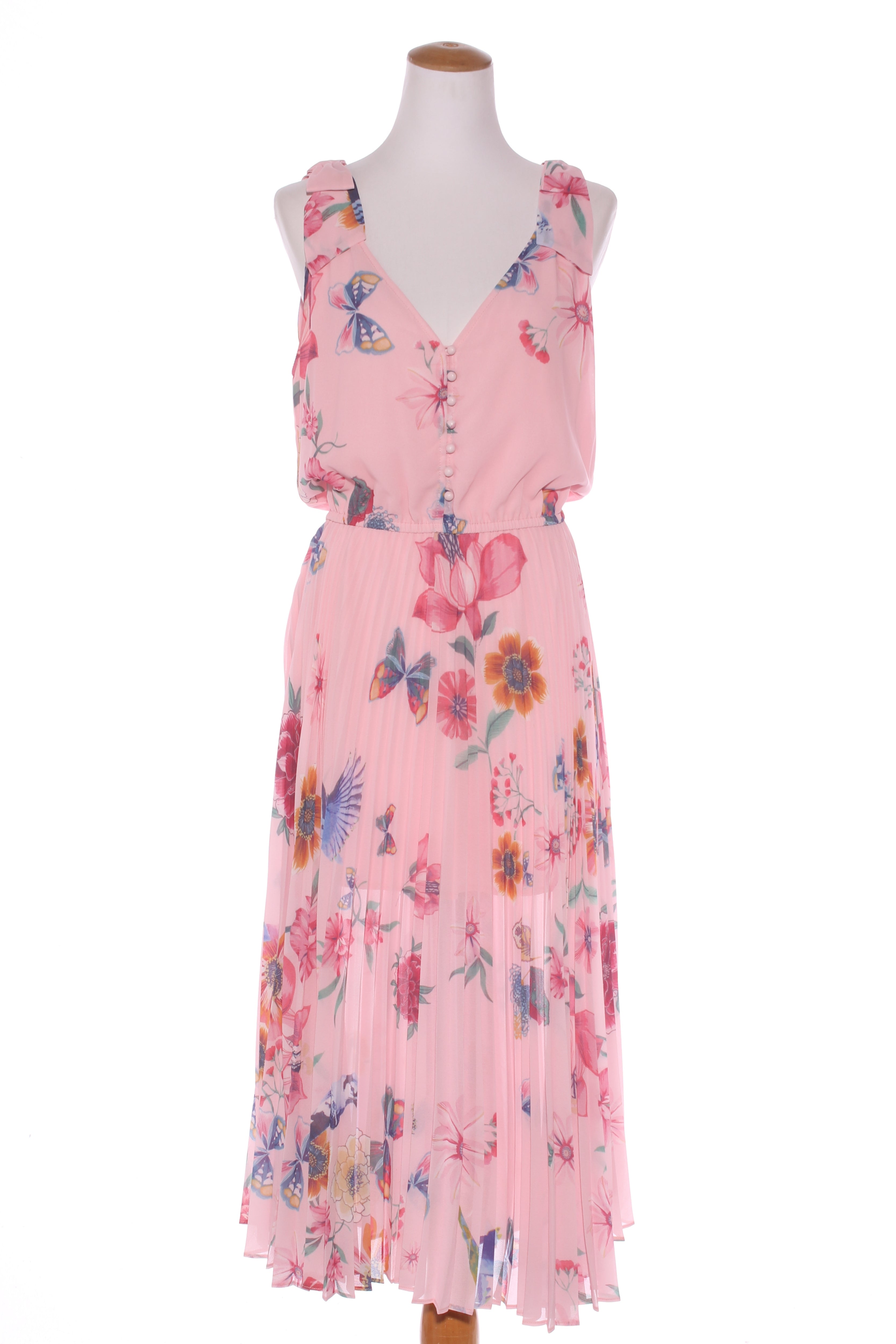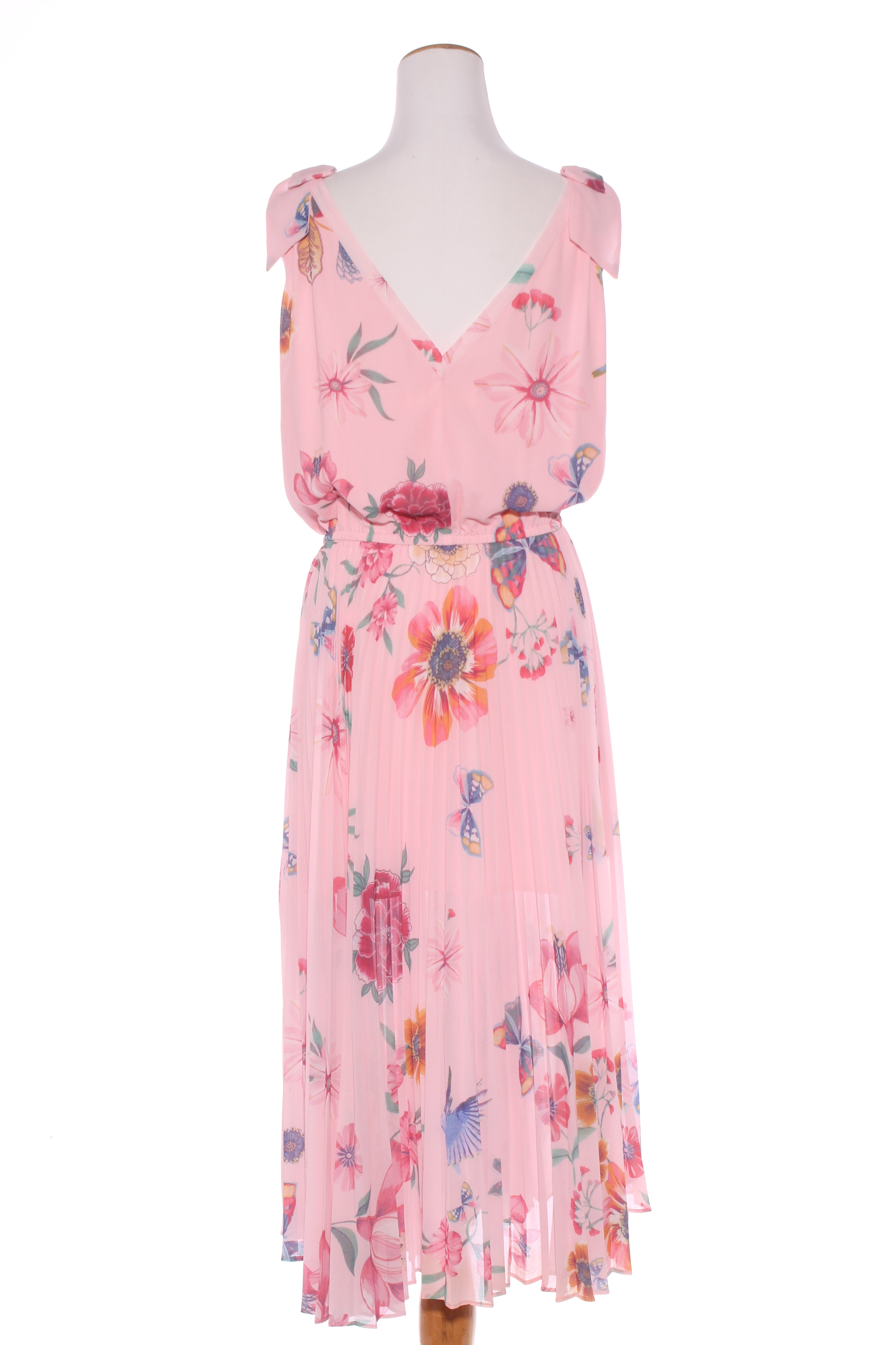 SIZE ON TAG: LFITS LIKE: 14COLOUR: Pink, multiFABRIC: PolyesterCONDITION: Excellent prelovedMEASUREMENTS:BUST: 56cms WAIST: 43cms LENGTH: 129cms NOTES: "Butterfly kiss - Pleating moments" Summer 2022. Designed in...