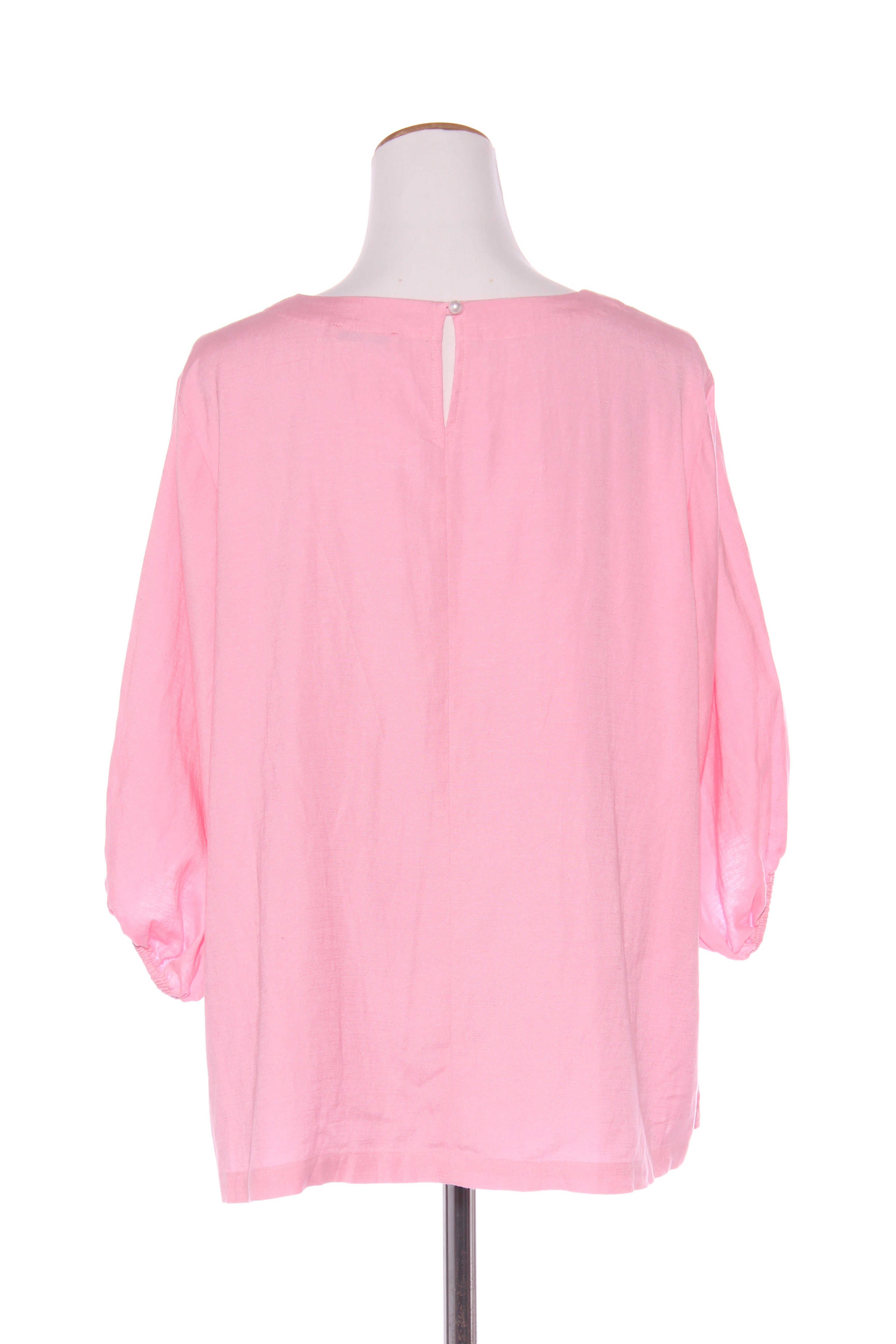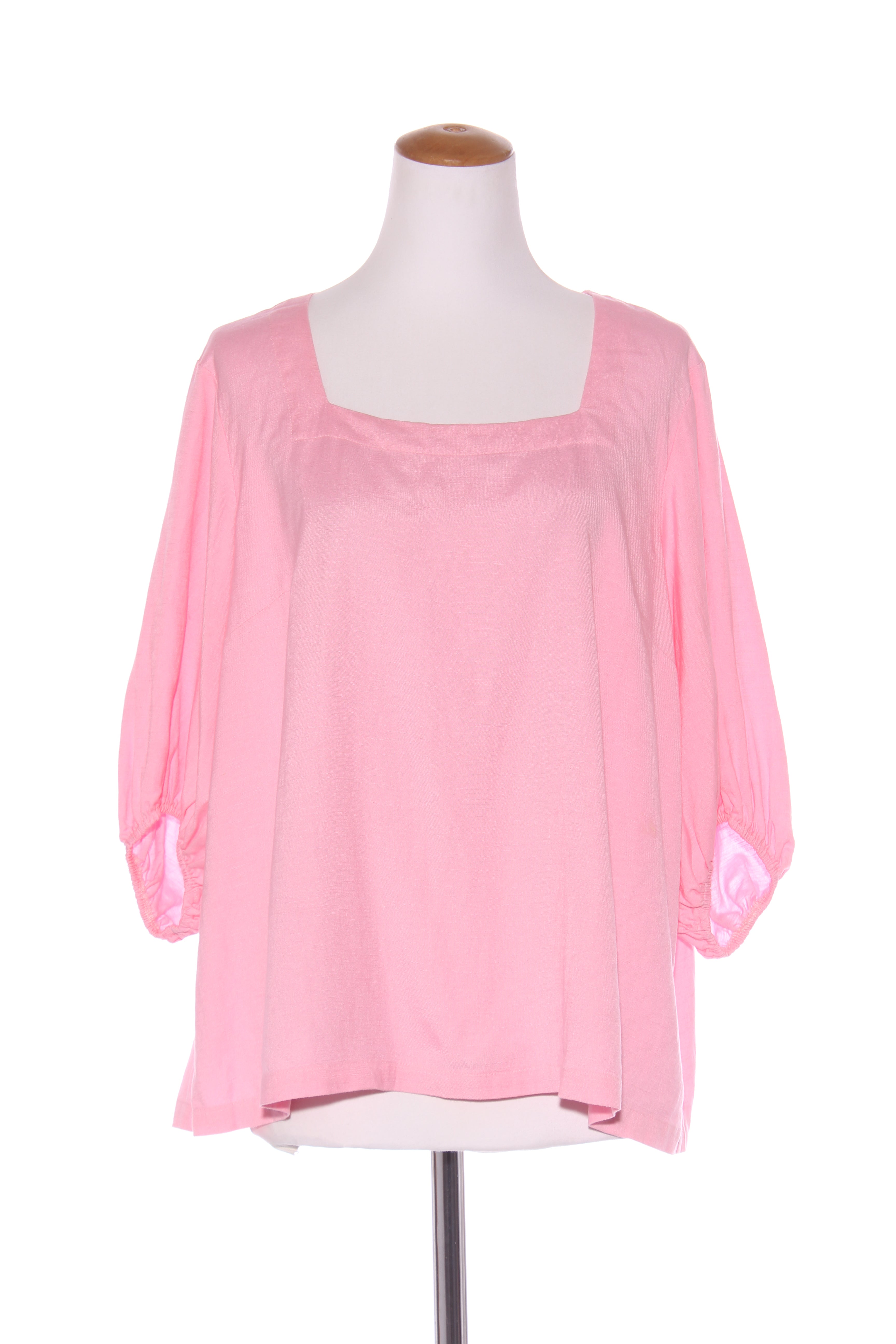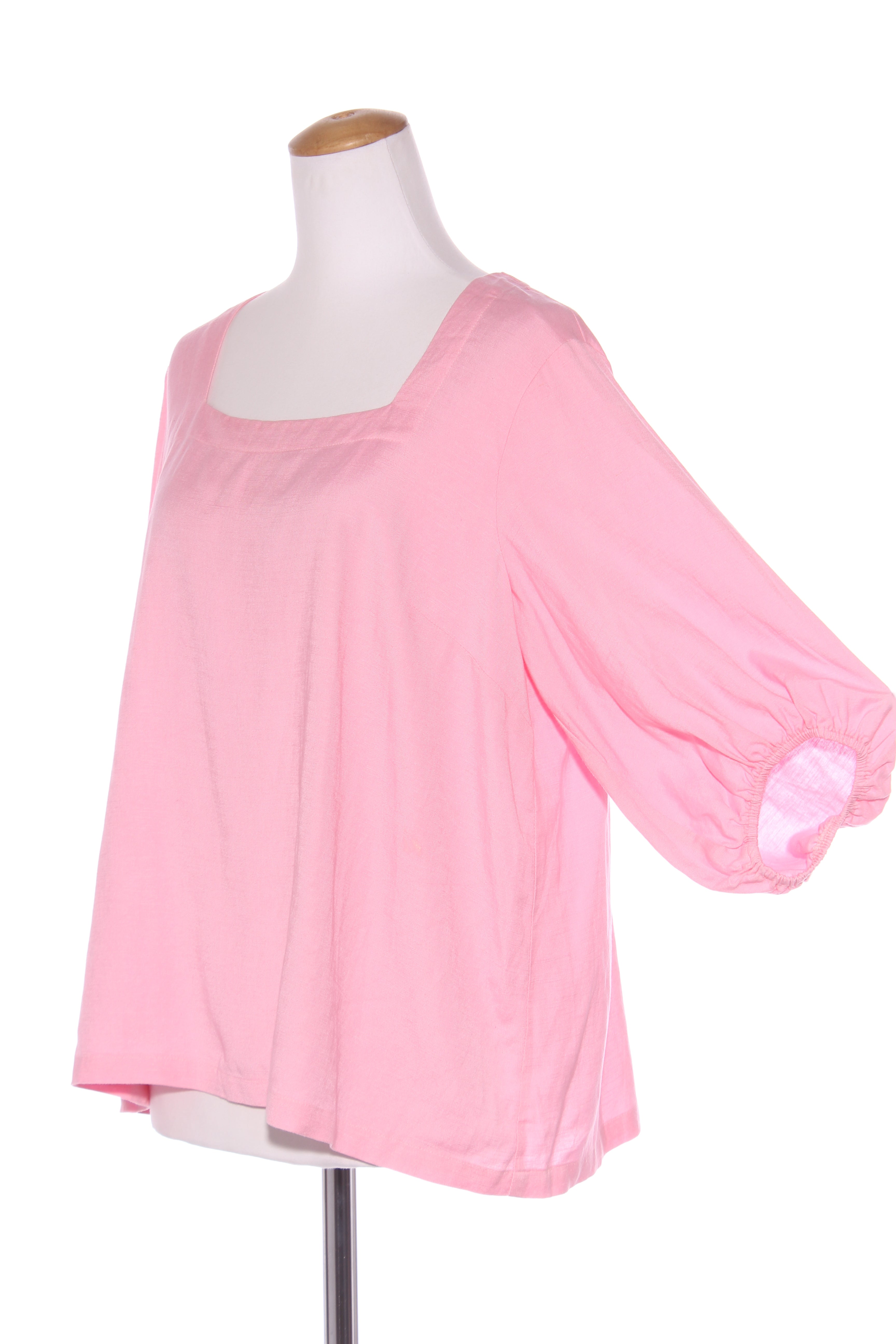 SIZE ON TAG: 12FITS LIKE: N/ACOLOUR: PinkFABRIC: No tag, linenCONDITION: Excellent prelovedMEASUREMENTS:BUST: 59cms WAIST: 64cms LENGTH: 65cms NOTES: Button up nape of neck. Elasticated sleeve ends.