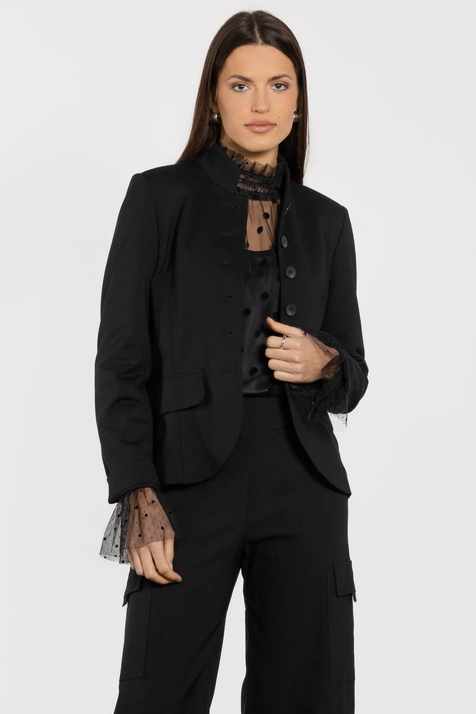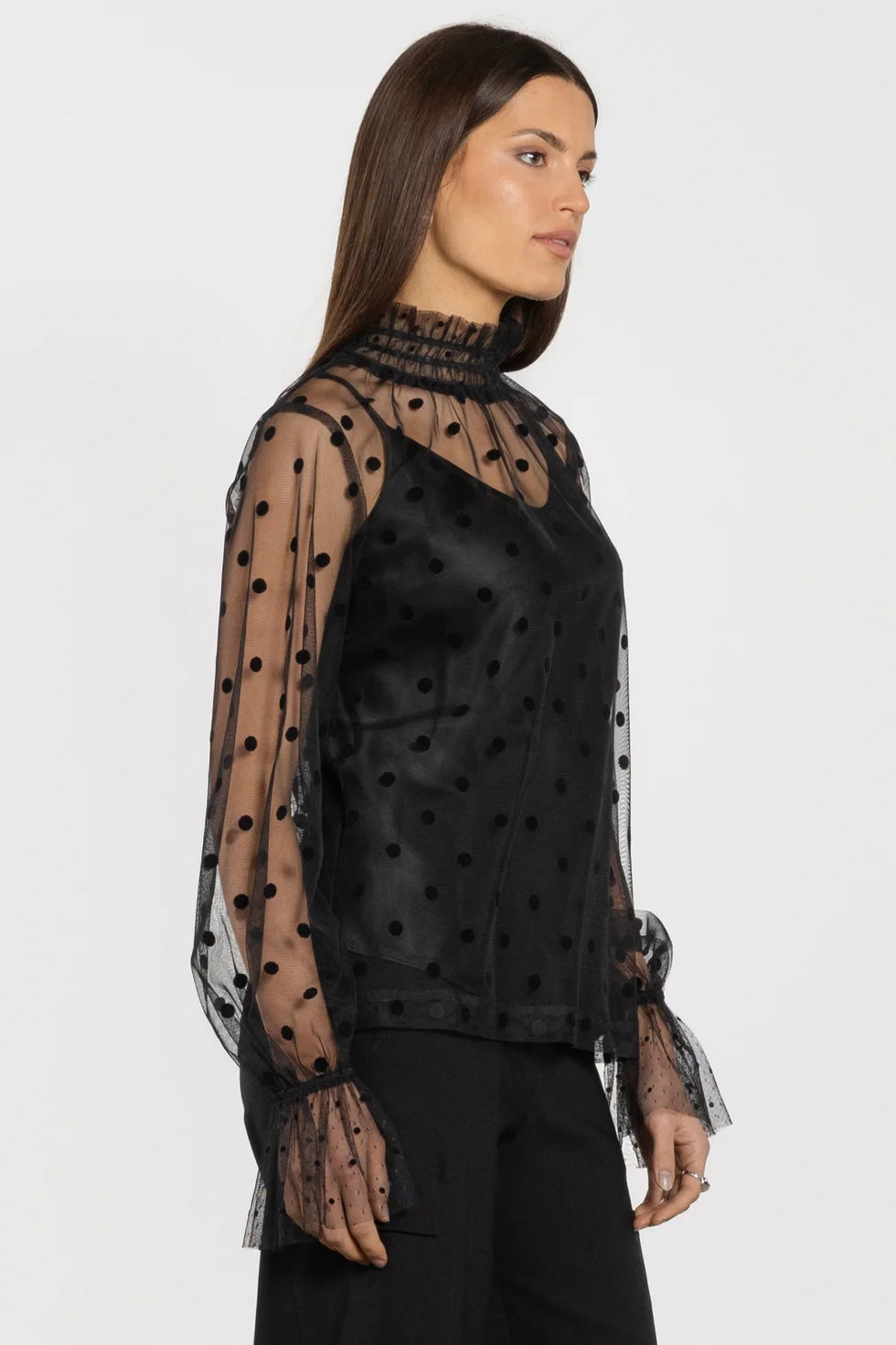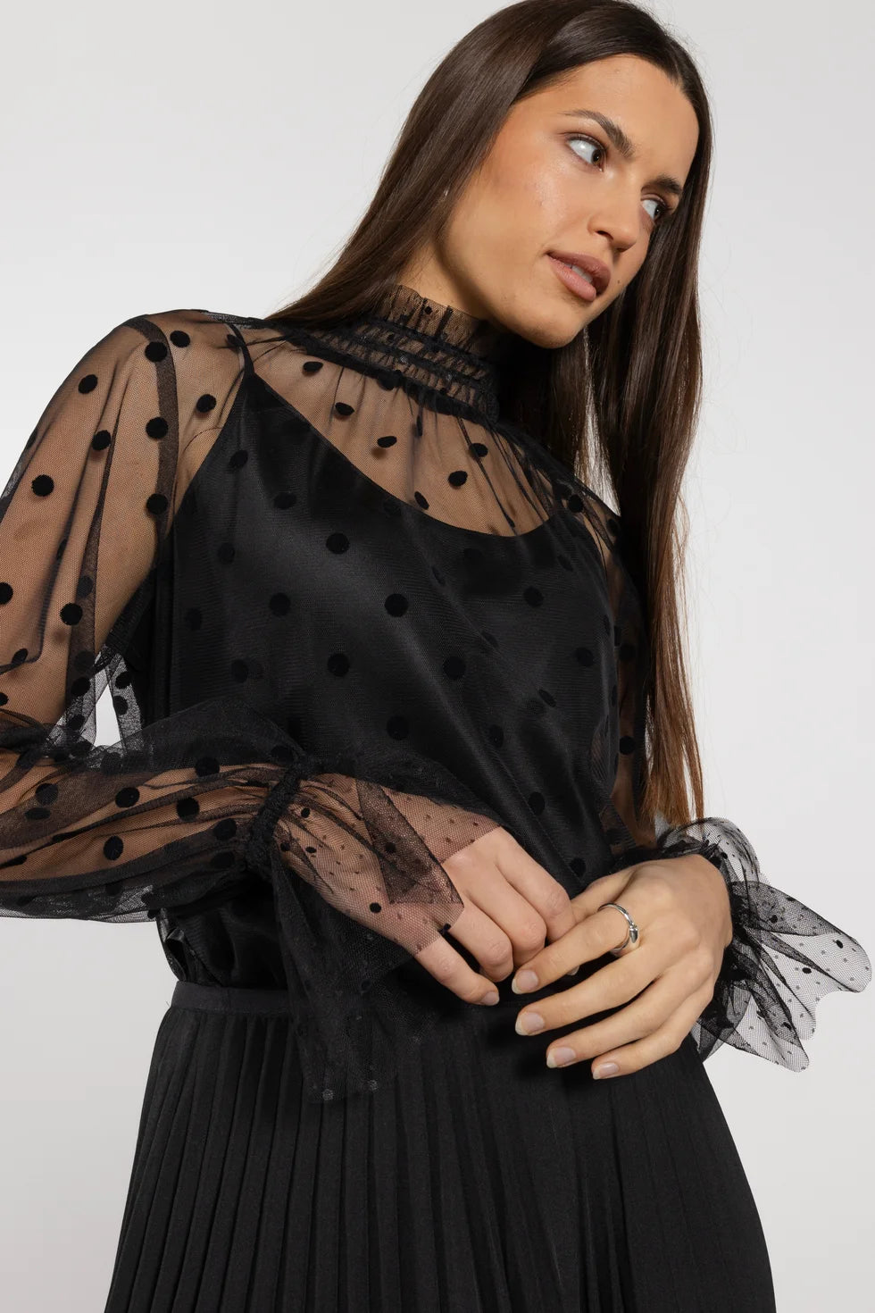 NOTES: A dreamy blend of romance and versatility, this blouse is the perfect statement piece for any season. The delicate spot mesh and high ruffle neckline create an effortlessly chic silhouette, while the frilled cuffs add a touch of drama. Layer it under a jacket and let the statement sleeves peek through, or wear it solo for an ethereal look. Whether styled for daytime charm or evening glamour, this blouse is a timeless wardrobe addition.