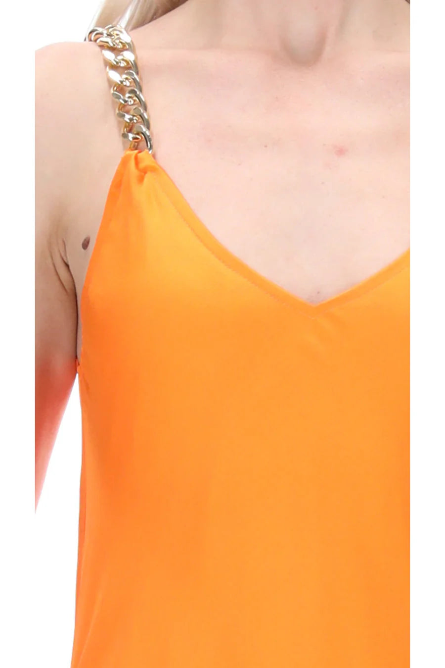 NOTES: "An orange maxi dress with gold chain shoulder straps.
