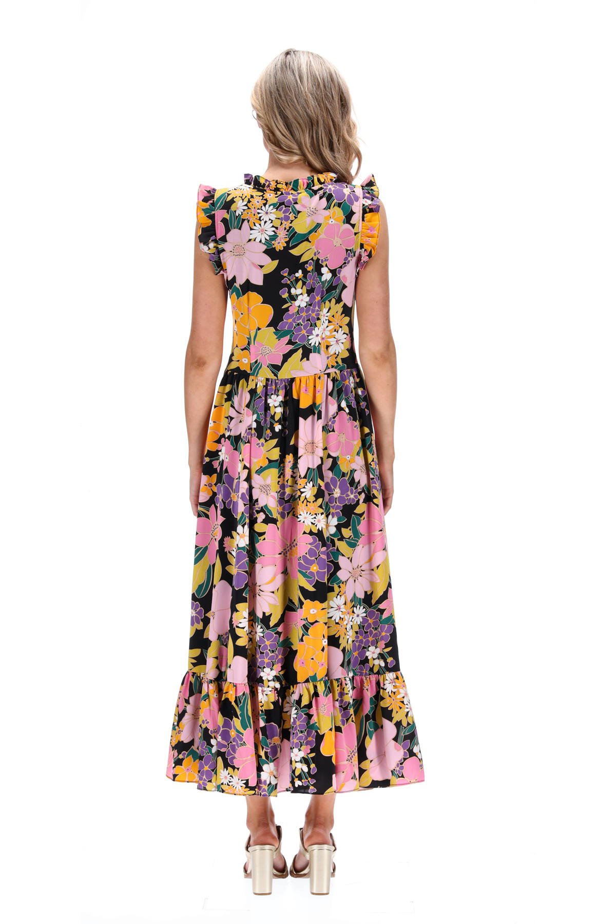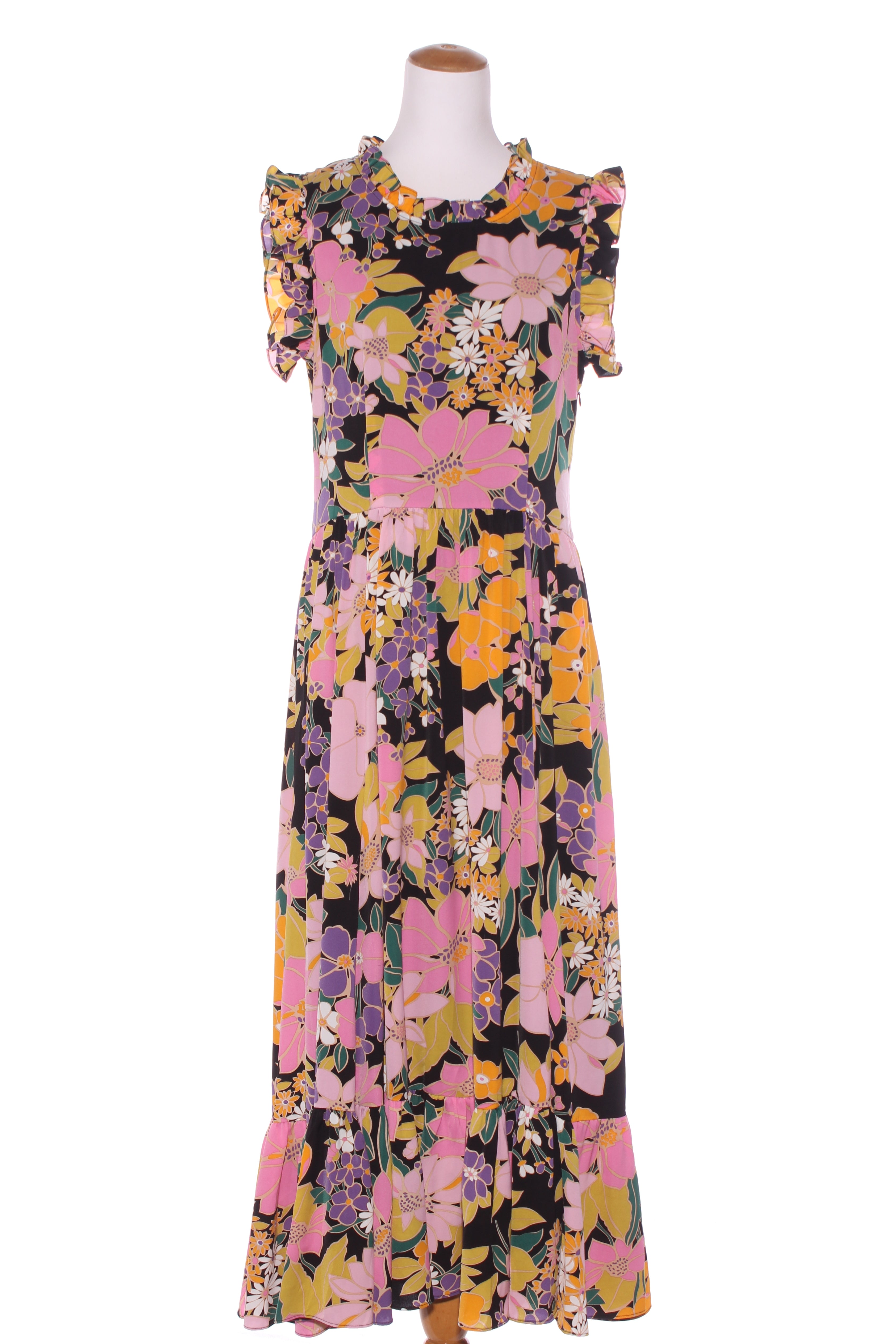 SIZE ON TAG: MFITS LIKE: 12COLOUR: MultiFABRIC: Polyester, Lining - 97% polyester, 3% elastaneCONDITION: Excellent prelovedMEASUREMENTS:BUST: 50cms WAIST: 43cms LENGTH: 137cmsNOTES: A bold black floral print...