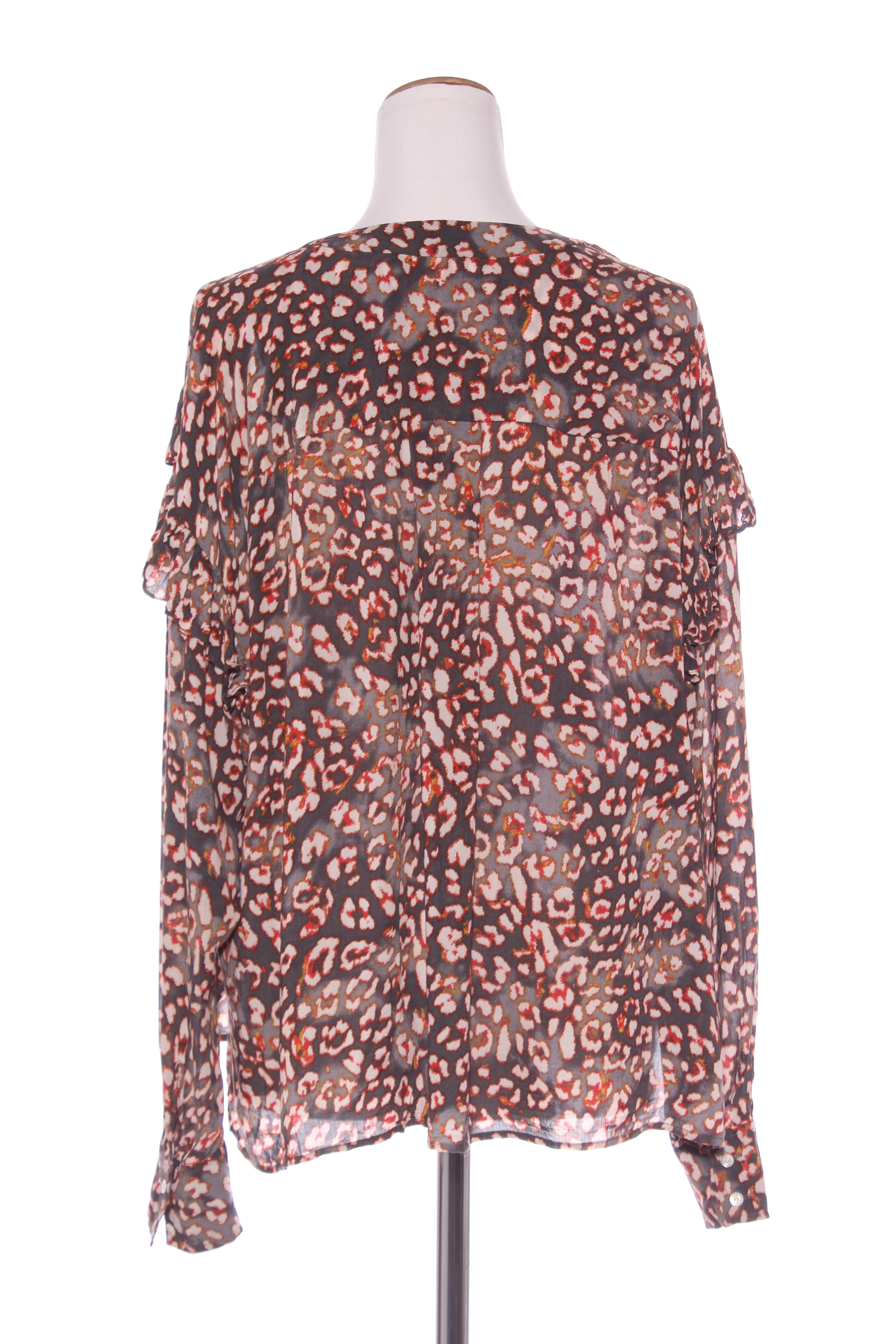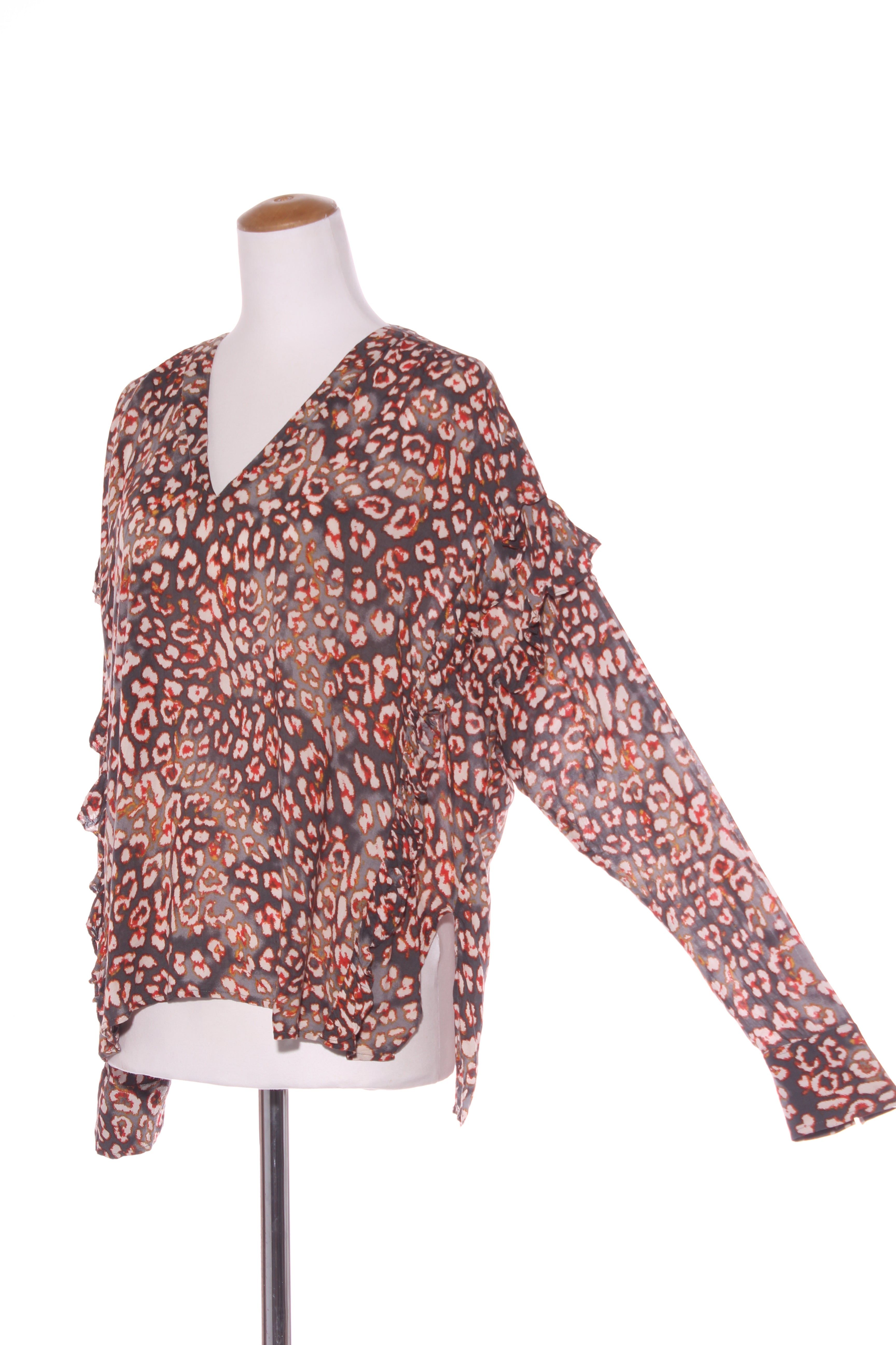 NOTES: Side ruffle detailing. Button up sleeve ends. High low hemline. Fabric has some stretch.