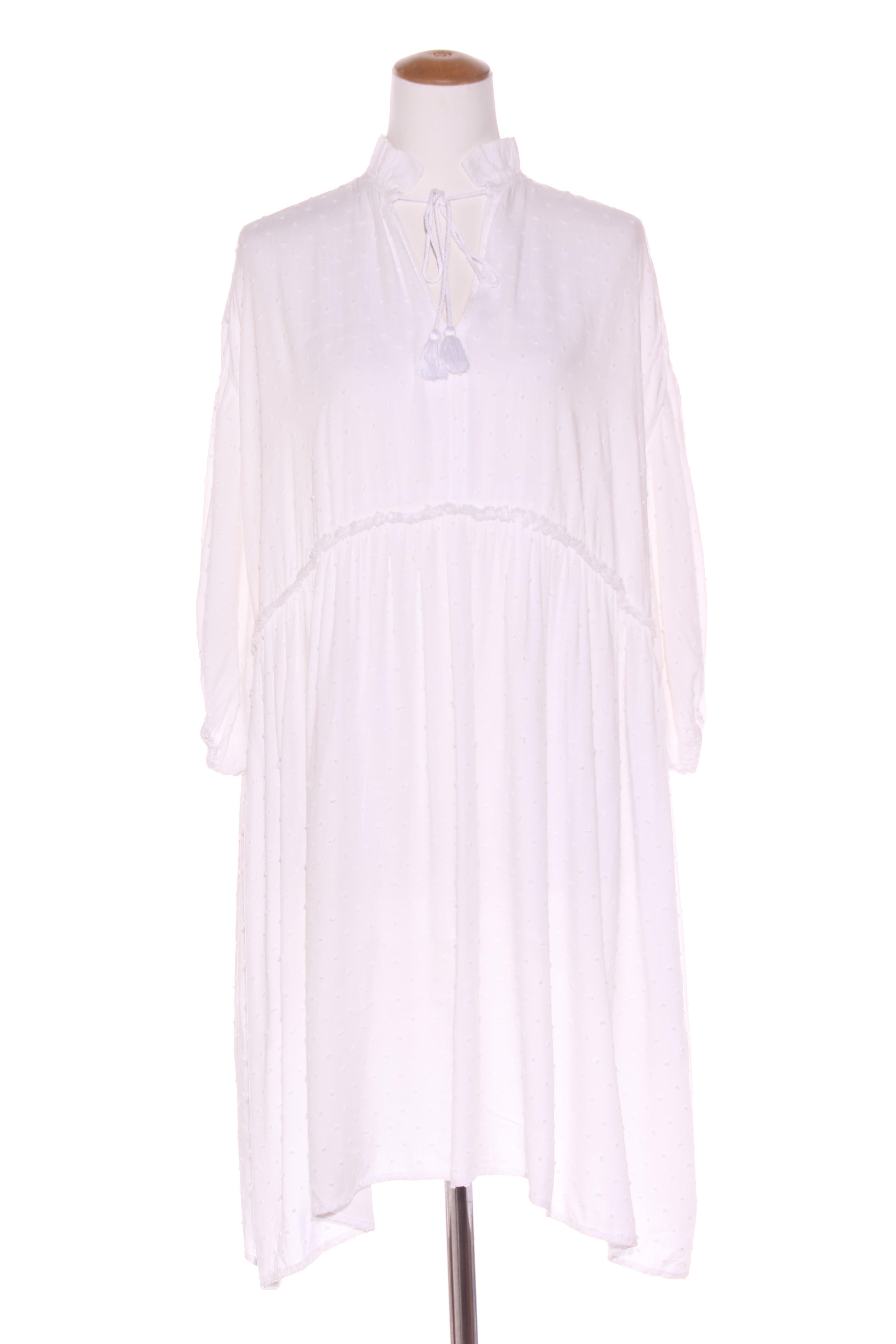 SIZE ON TAG: Size 2FITS LIKE: 12-14COLOUR: Beige, charcoal greyFABRIC: 58% viscose, 42% cottonCONDITION: Excellent prelovedMEASUREMENTS:BUST: 64cms WAIST: 62cms LENGTH: 85-125cmsNOTES: Pull over style. Fabric has...
