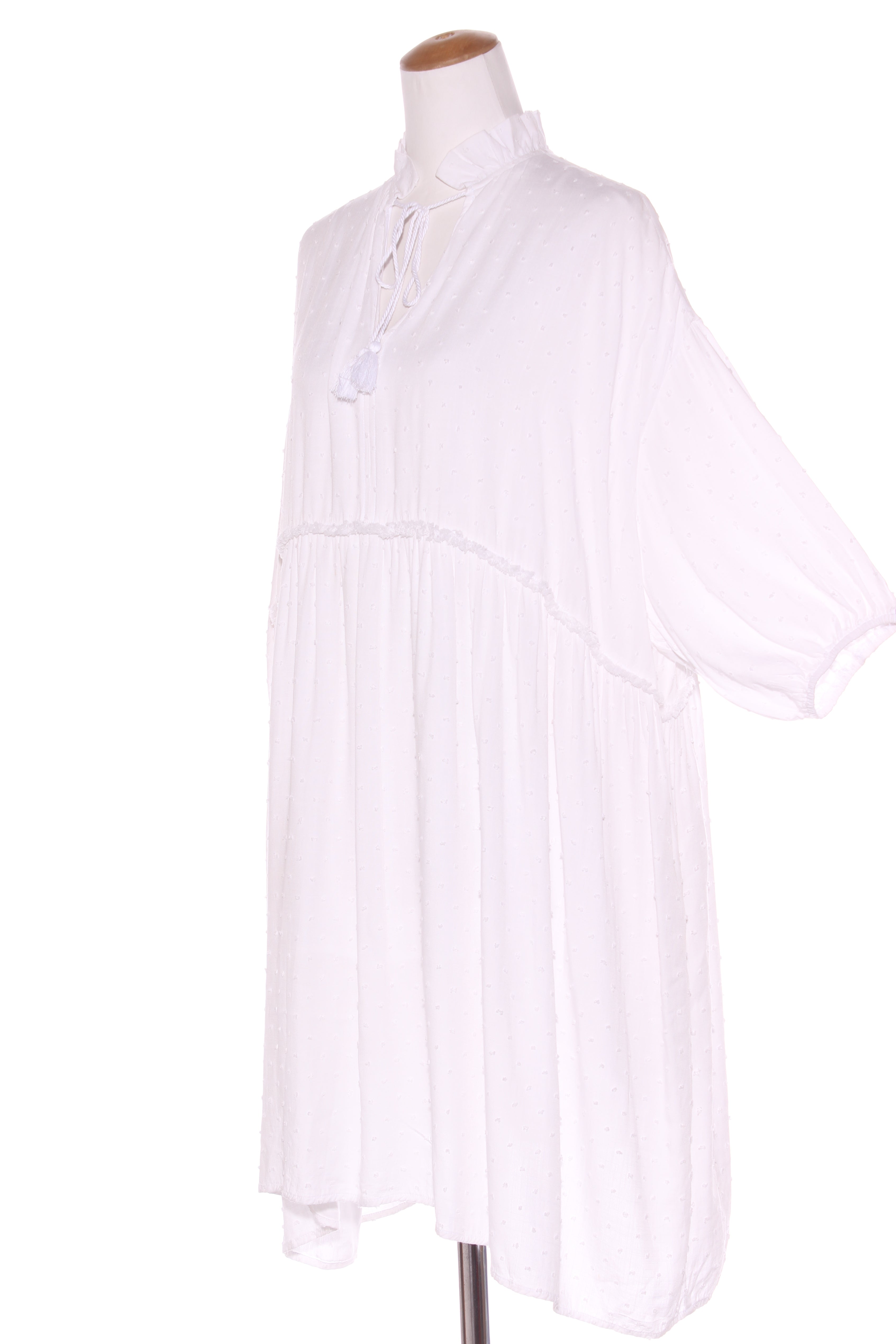 NOTES: Textured tufted fabric. Ties at neckline. Elasticated sleeve ends. Side pockets. Side pockets.