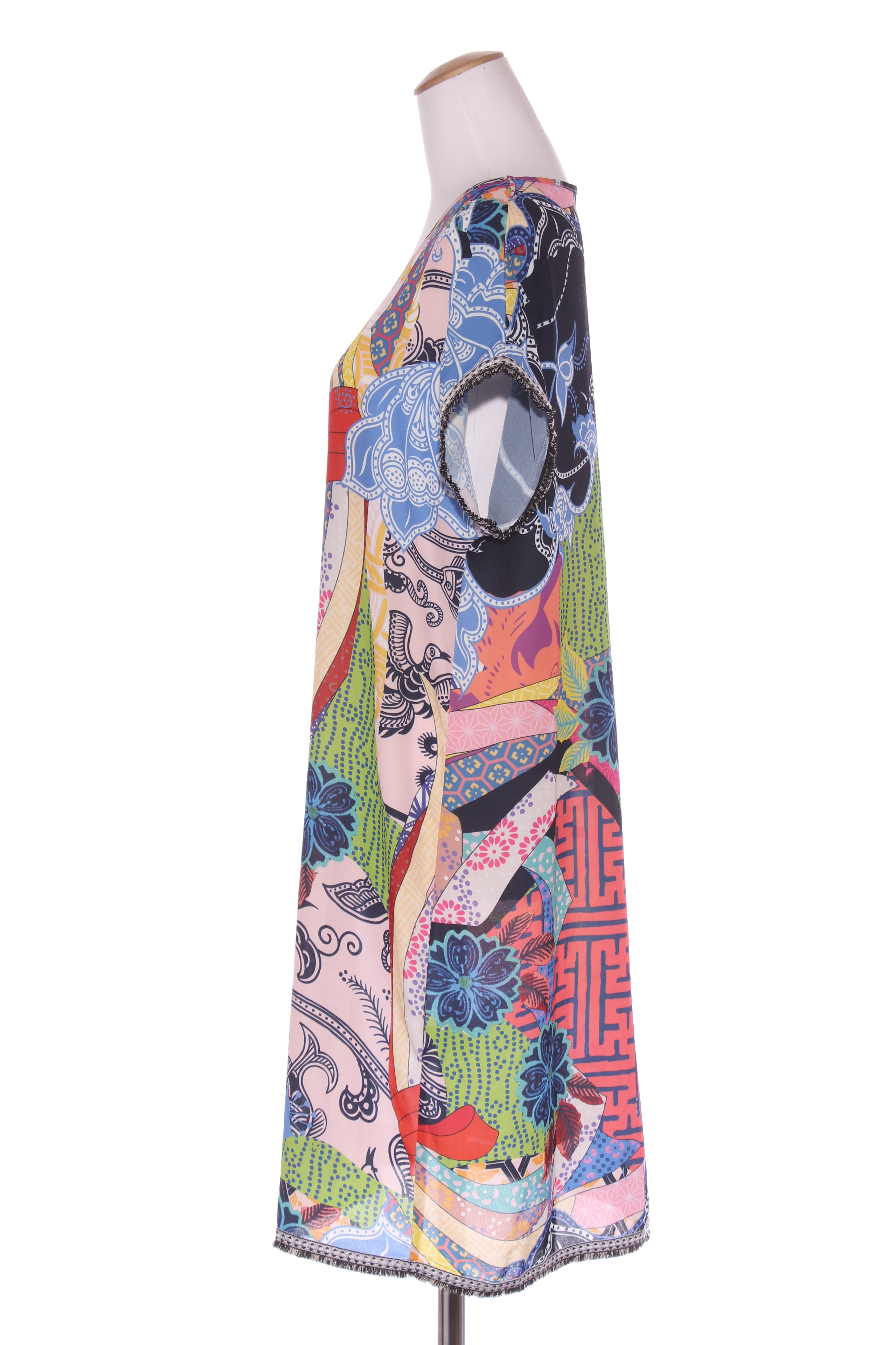 SIZE ON TAG: 12FITS LIKE: N/ACOLOUR: Navy blue, multiFABRIC: PolyesterCONDITION: Excellent prelovedMEASUREMENTS:BUST: 46cms WAIST: 47cms LENGTH: 61cms NOTES: Elasticated neckline with Mint ties that come through eyelets on the...