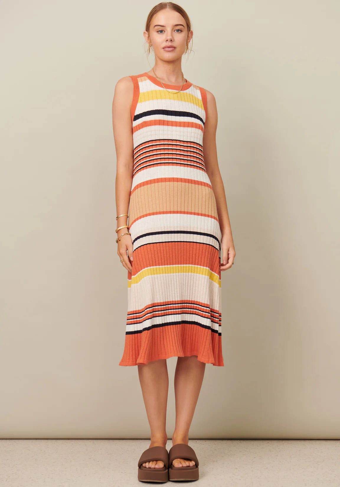 NOTES: The POL Clothing Chloe Knit Dress brings a fun and flirty element to POL’s signature multi-stripe knit with a shorter hemline and flip skirt.