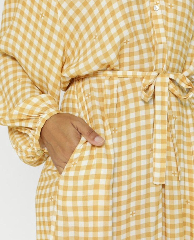 NOTES: Slouchy Fit V Button Neck Dress With Self Fabric Waist Tie Belt. Includes Pockets!