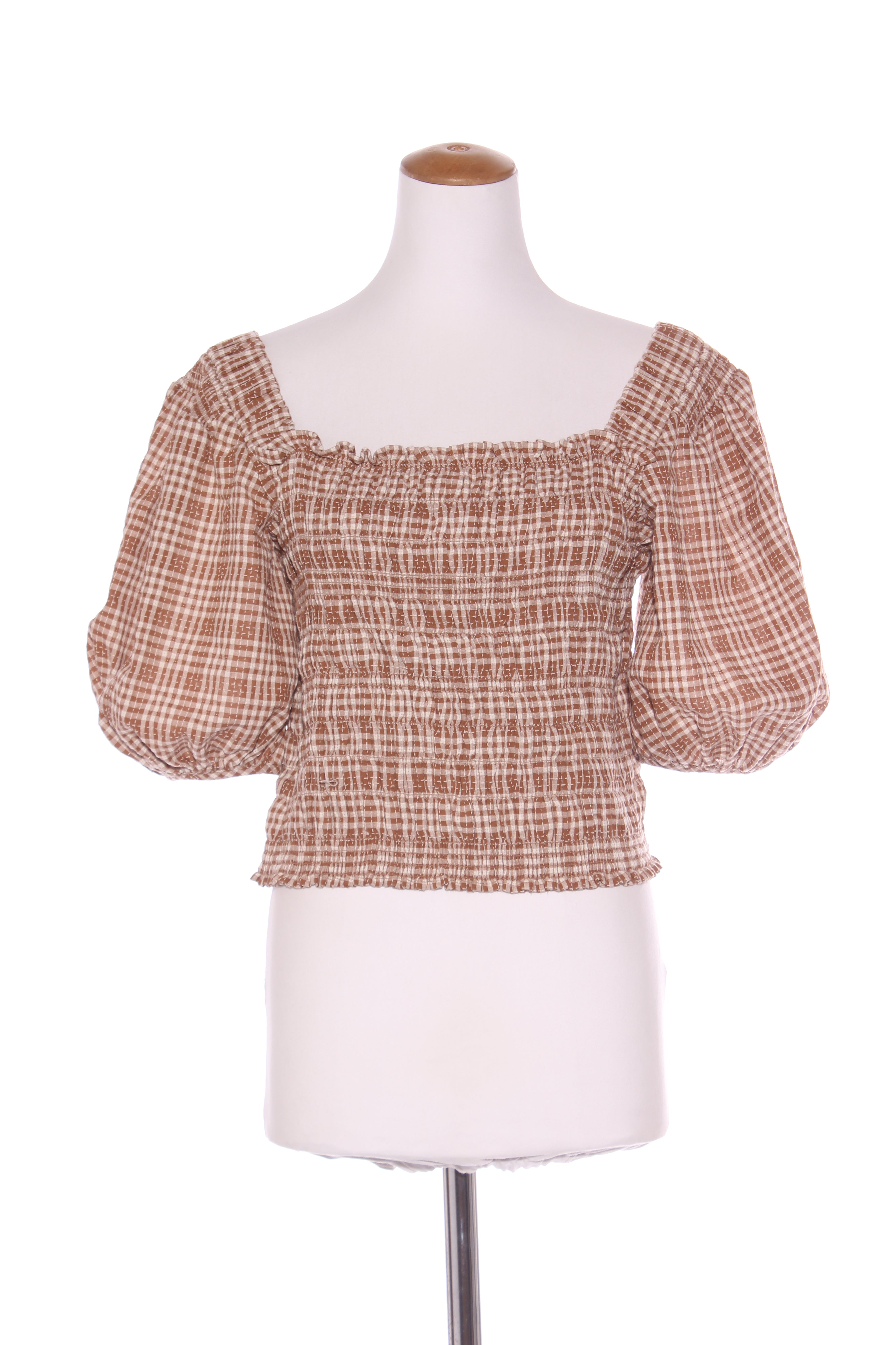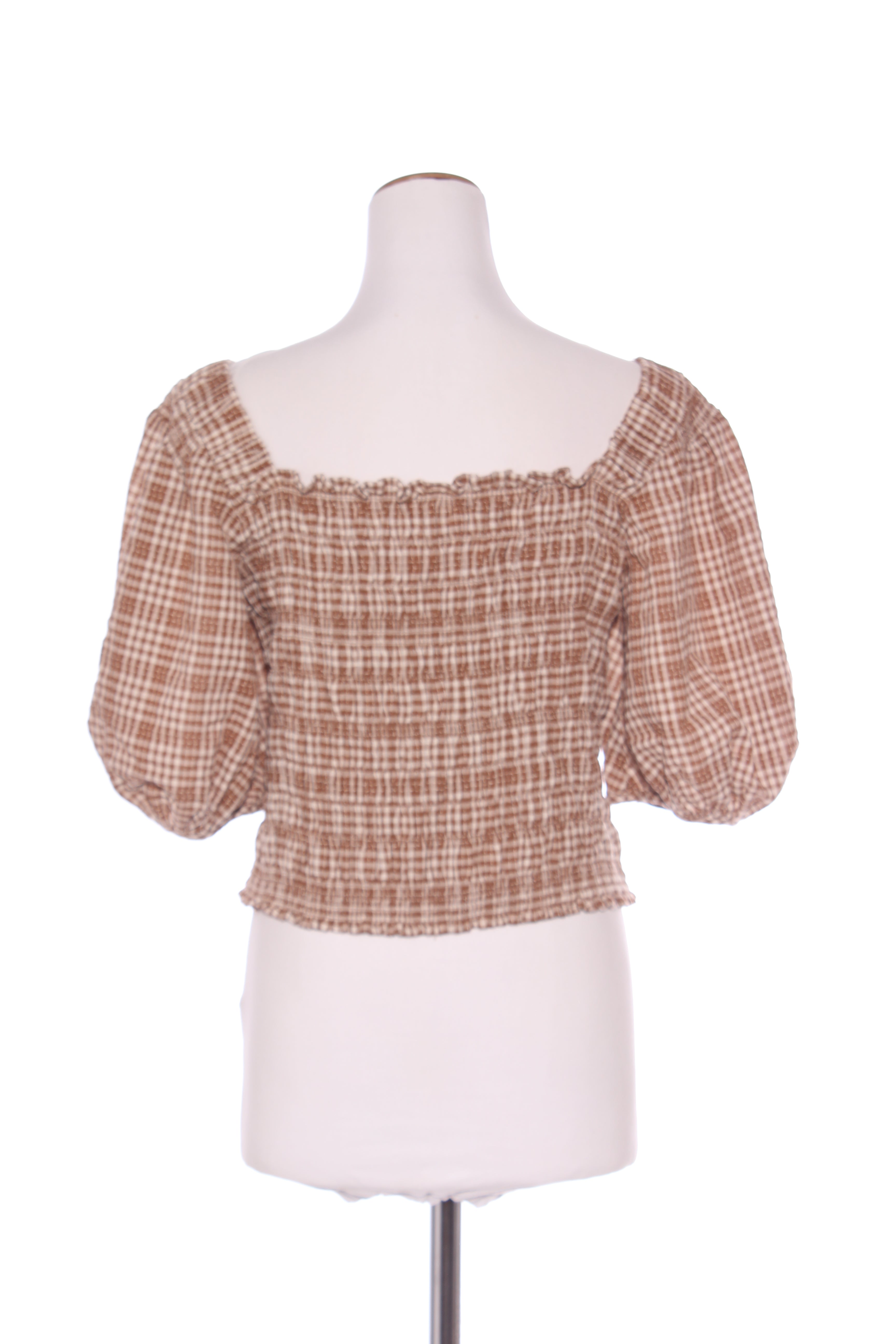 NOTES: * Same style as modelled pic - we have the brown gingham for sale. Elasticated shirred bodice. Elasticated neckline and shoulders.