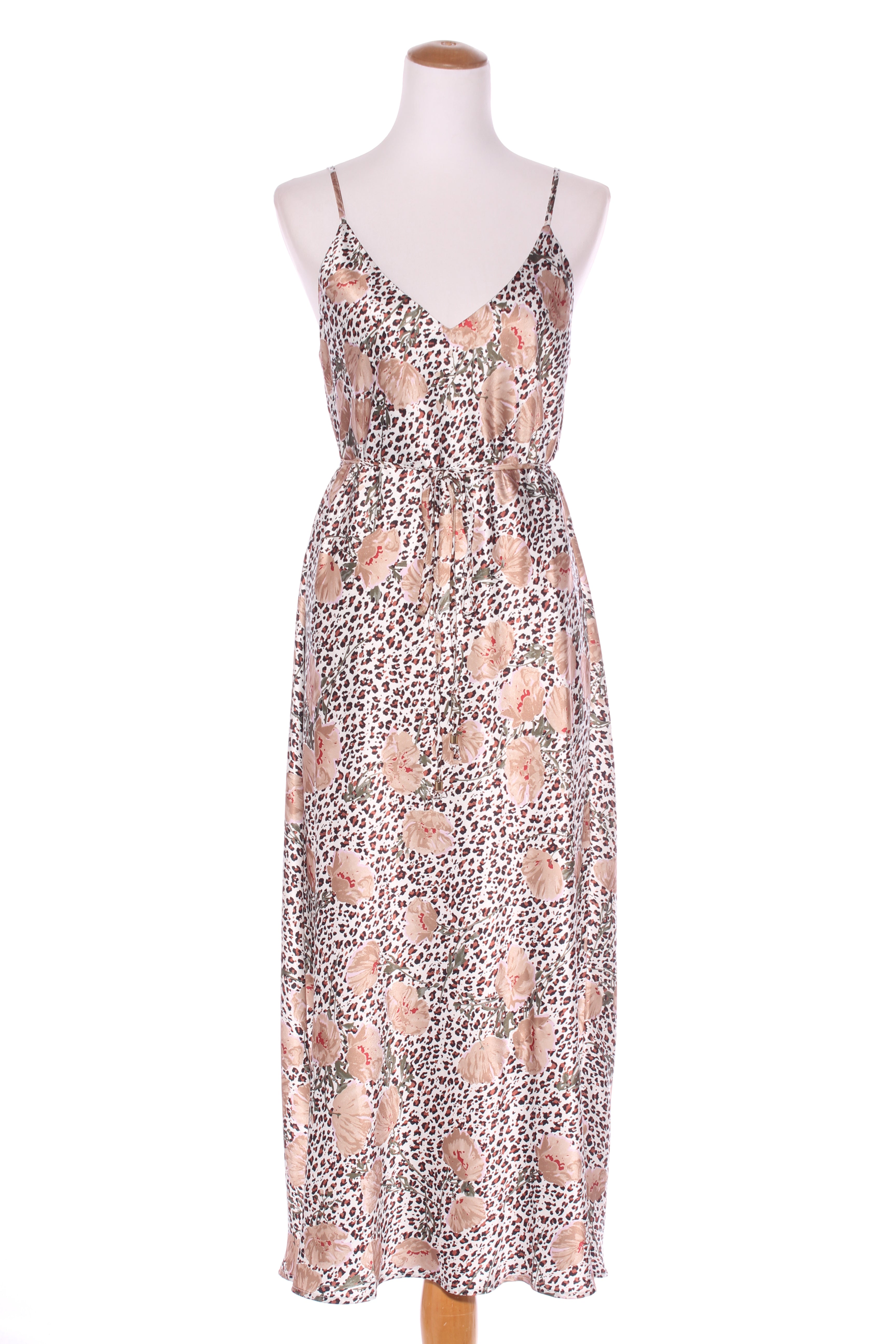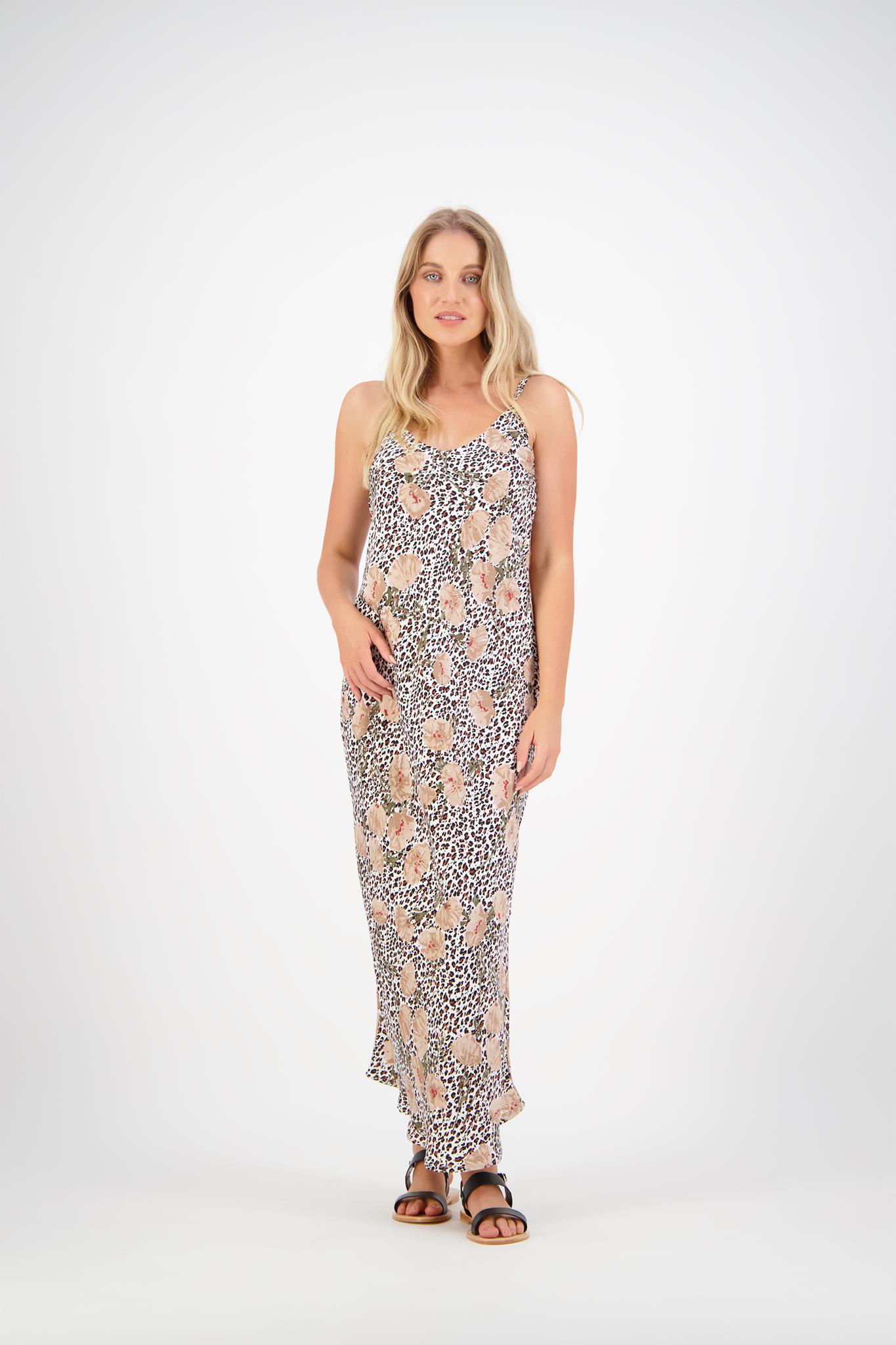 SIZE ON TAG: MFITS LIKE: 12COLOUR: Black, white, goldFABRIC: PolyesterCONDITION: Excellent prelovedMEASUREMENTS:BUST: 50cms WAIST: 49cms LENGTH: 120cms NOTES:Made in NZ. Side splits up 18cm from hemline. Pull...