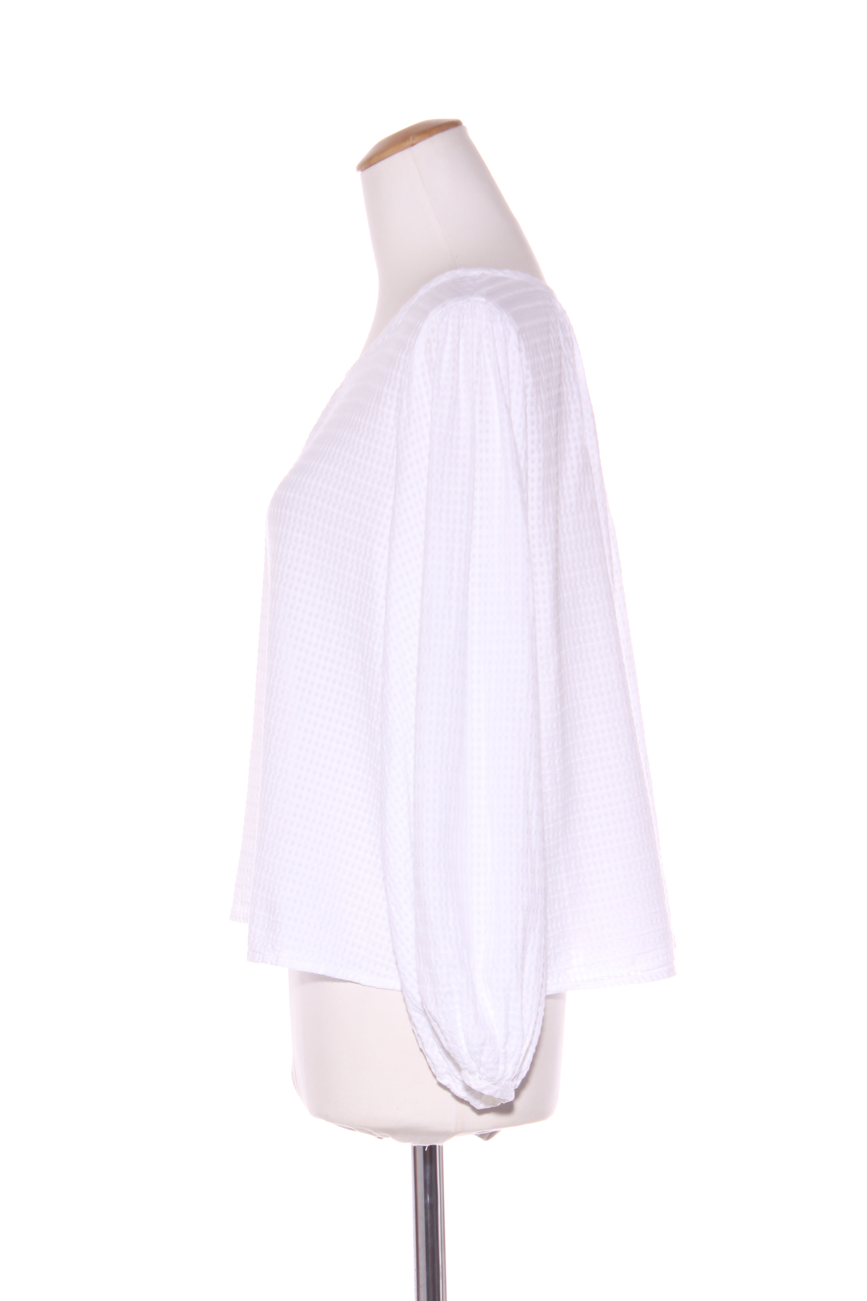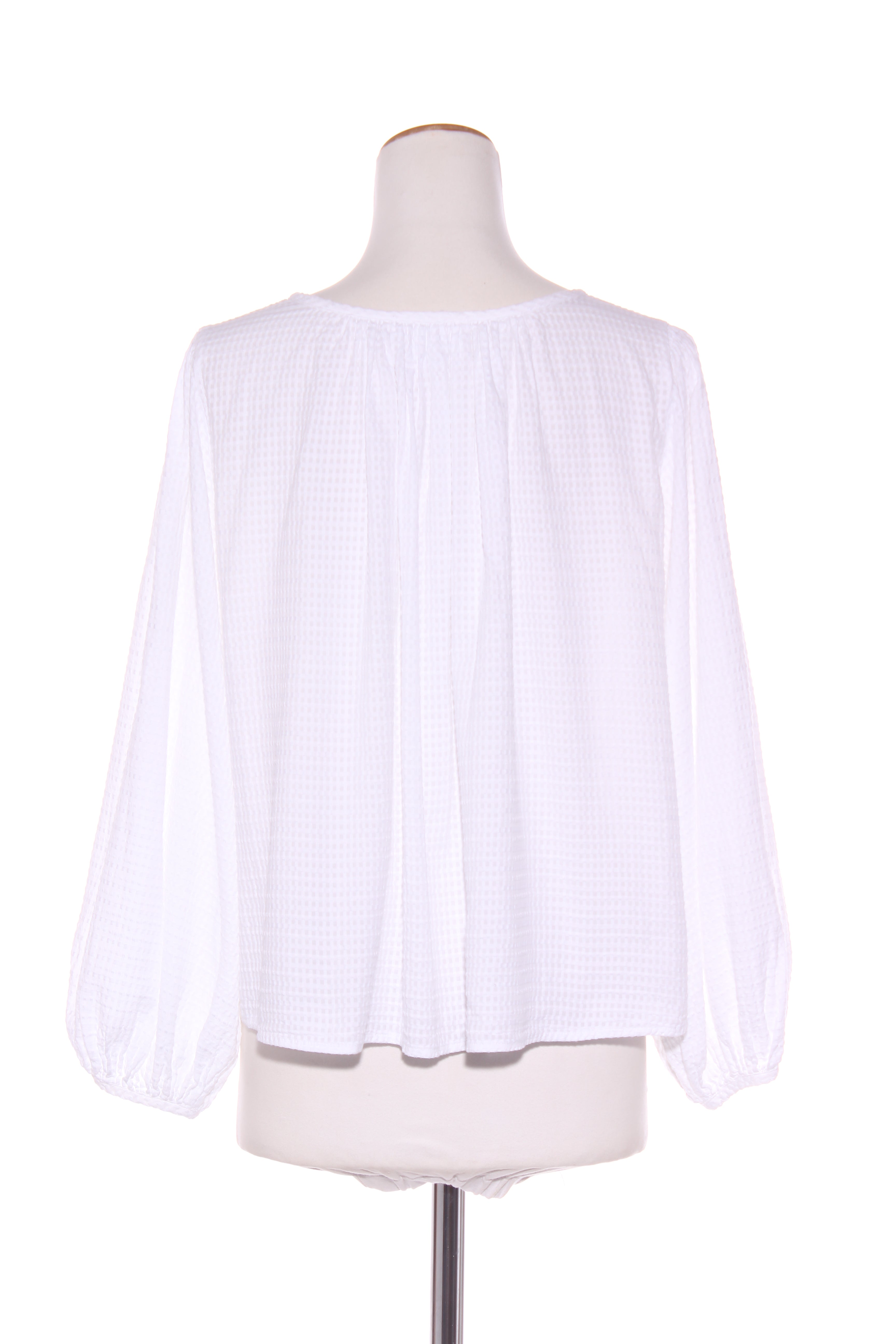 SIZE ON TAG: SFITS LIKE: 10-12COLOUR: WhiteFABRIC: 100% certified fair trade organic cottonCONDITION: Excellent prelovedMEASUREMENTS:BUST: 52cms WAIST: 64cms LENGTH: 55-57cms NOTES: Pleated back at neckline. Billow sleeves.