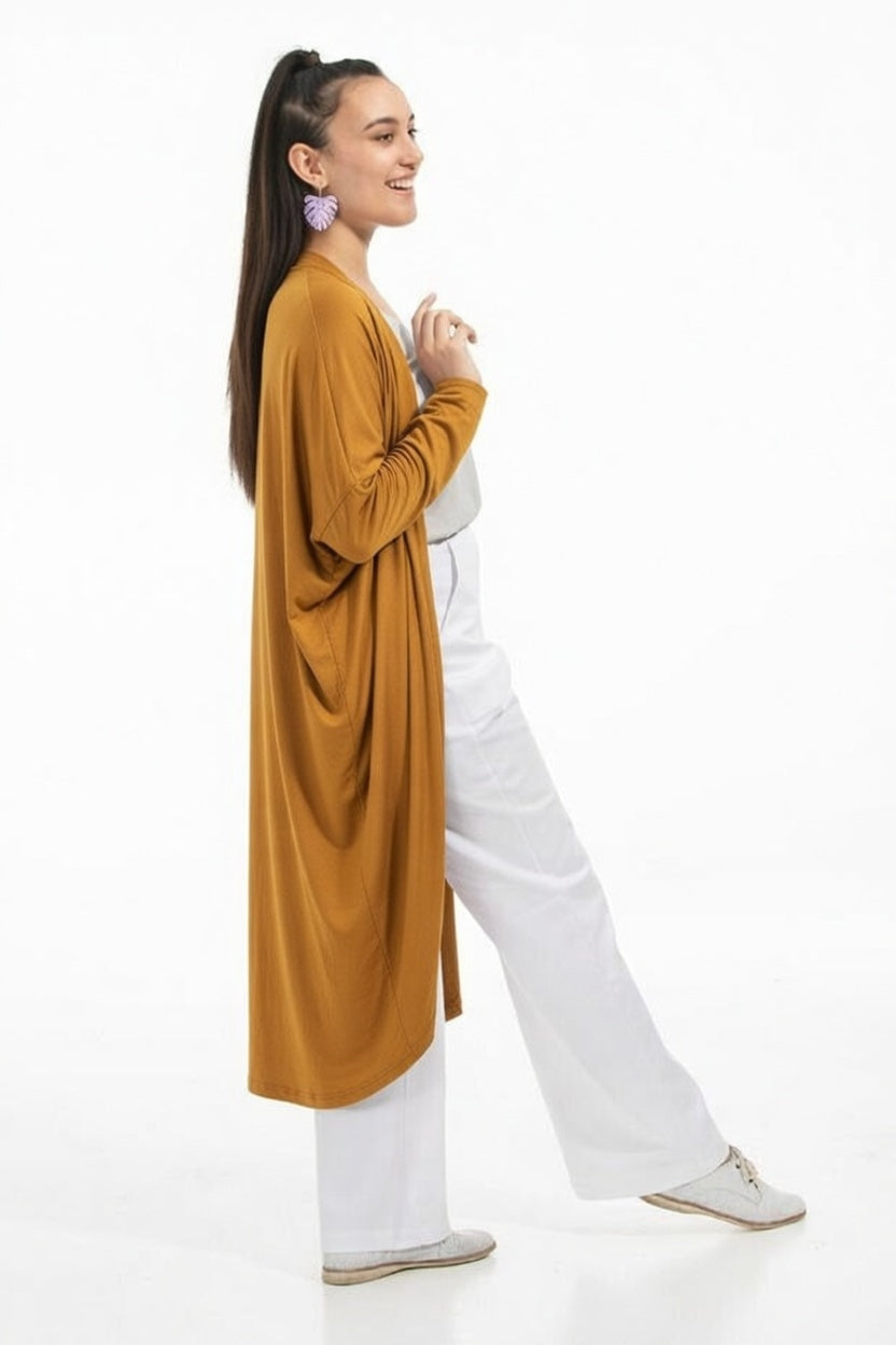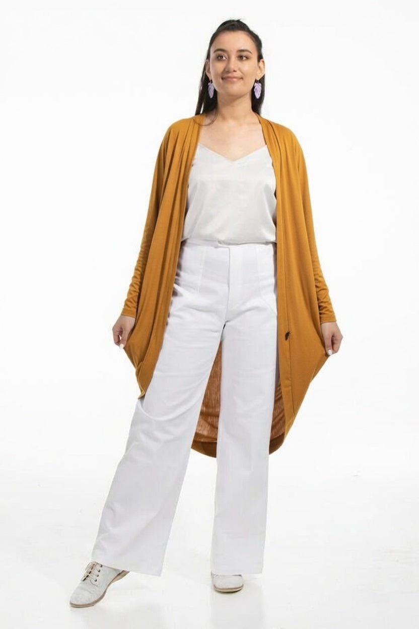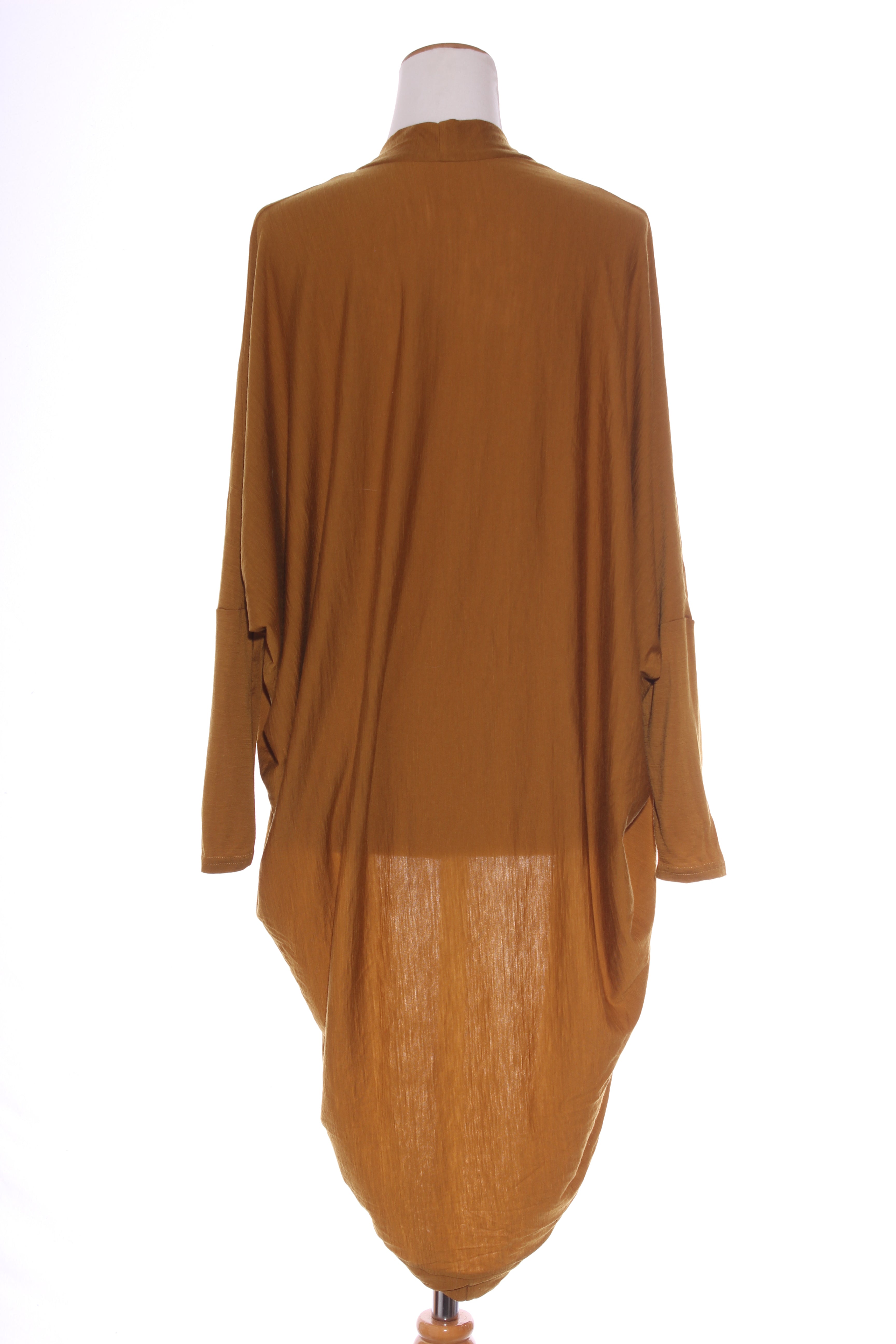 SIZE ON TAG: Tag removedFITS LIKE: 8-16COLOUR: Deep golden ochreFABRIC: Tag removed, MerinoCONDITION: Excellent prelovedMEASUREMENTS:BUST: Free WAIST: Free LENGTH: 116cms NOTES: Cocoon yourself in the Mason...