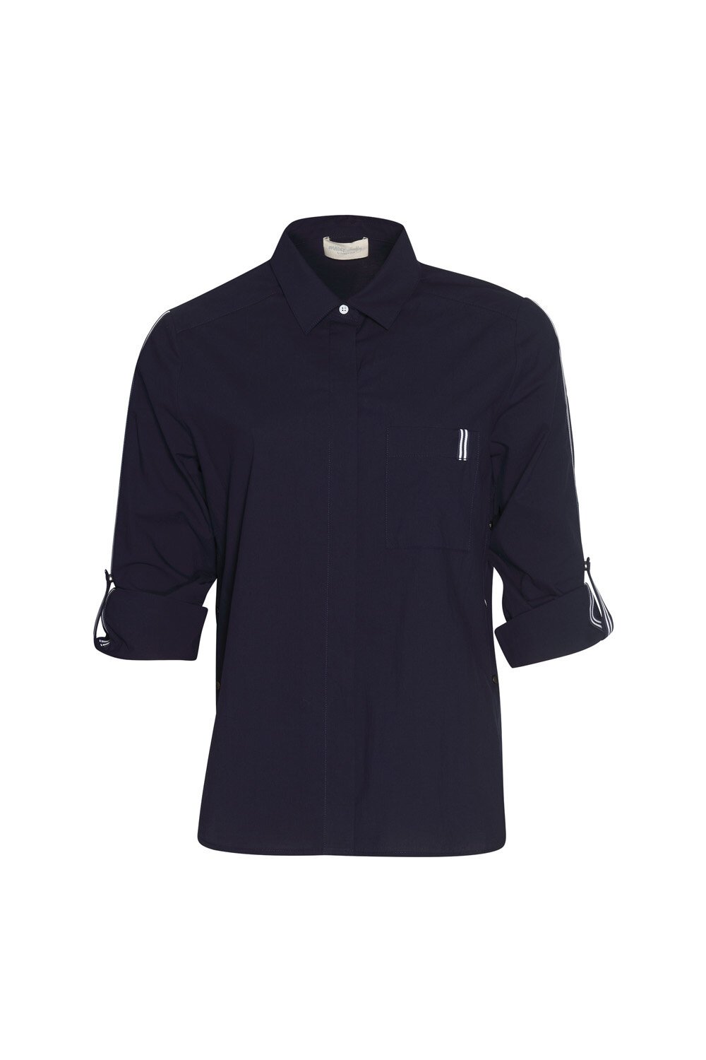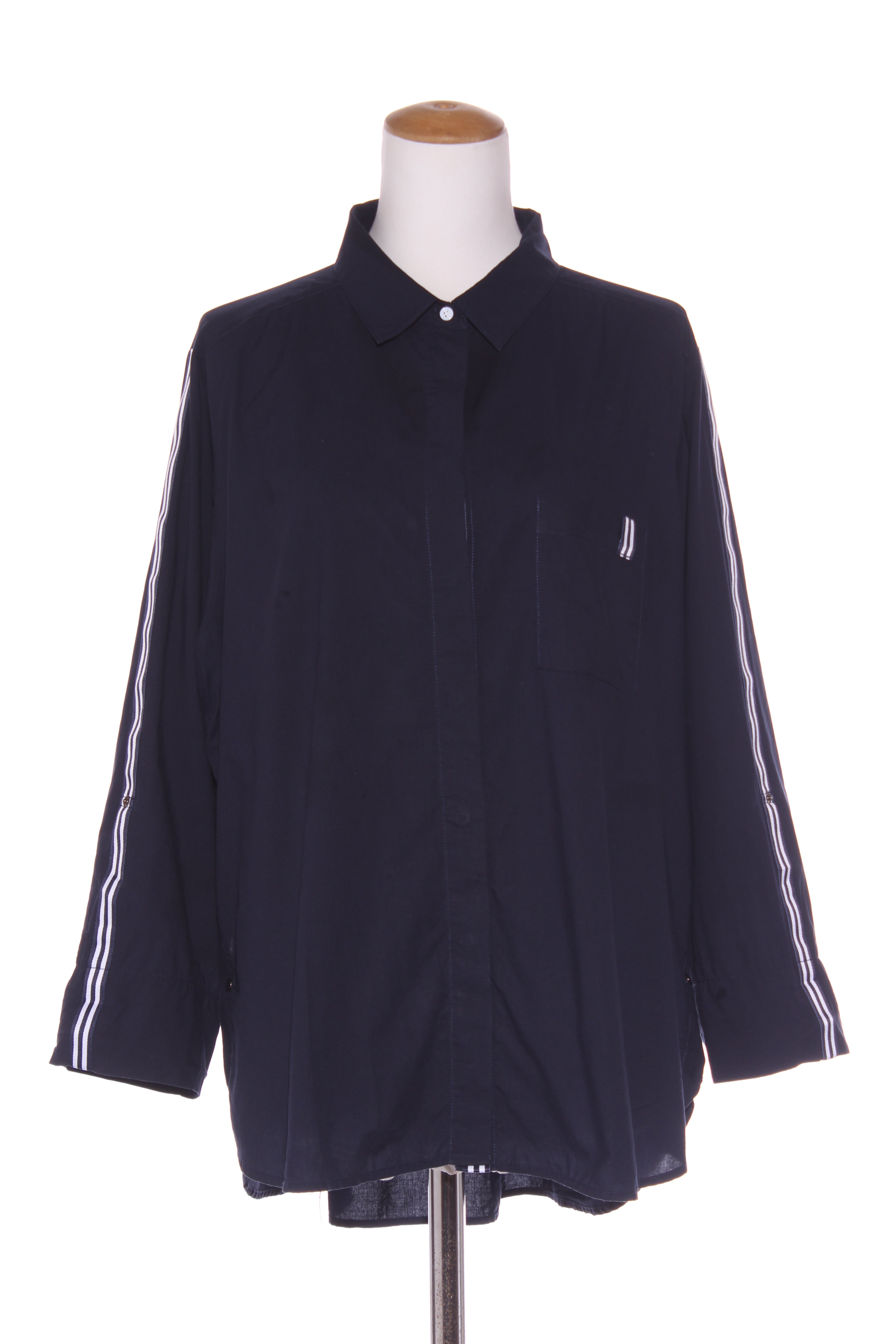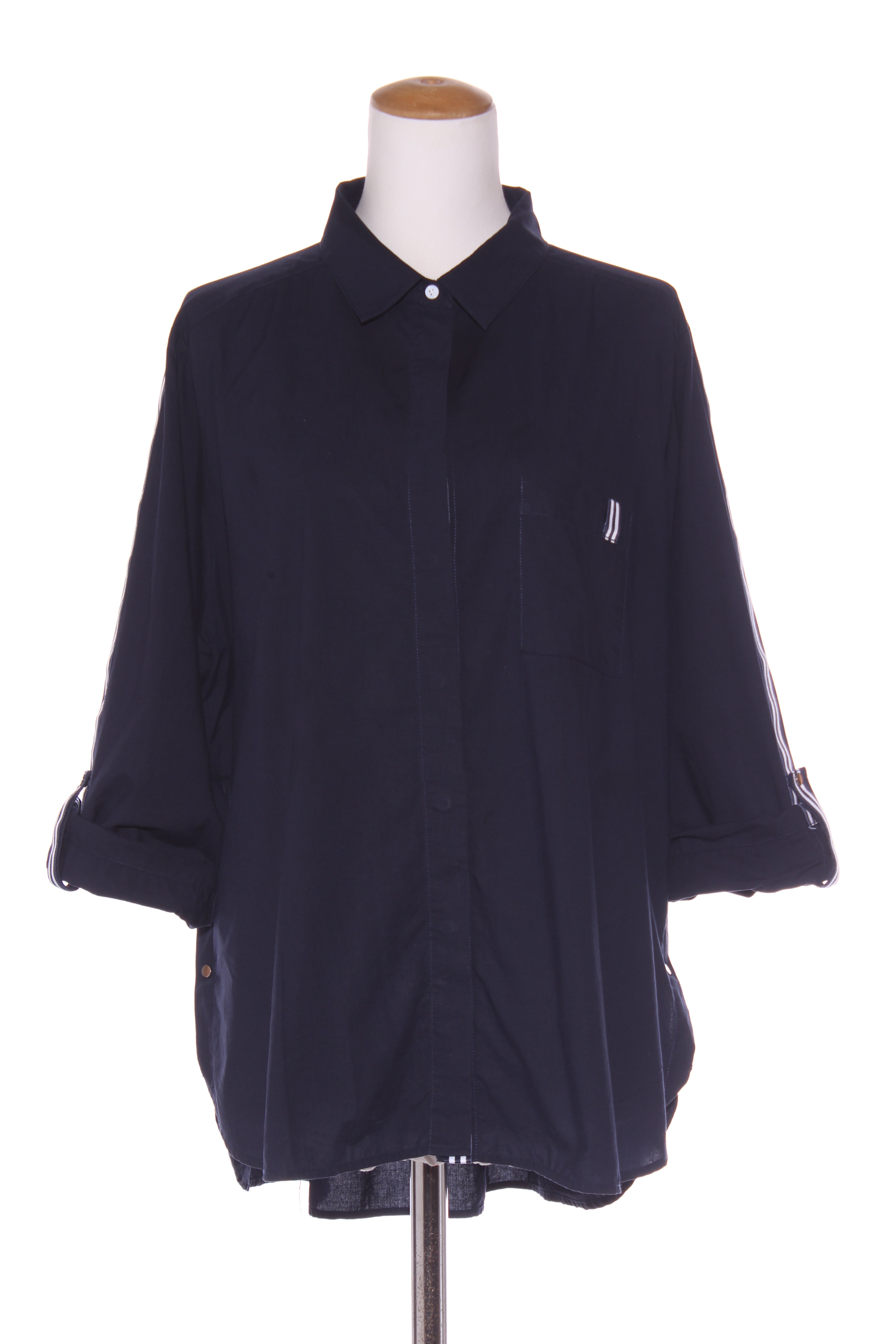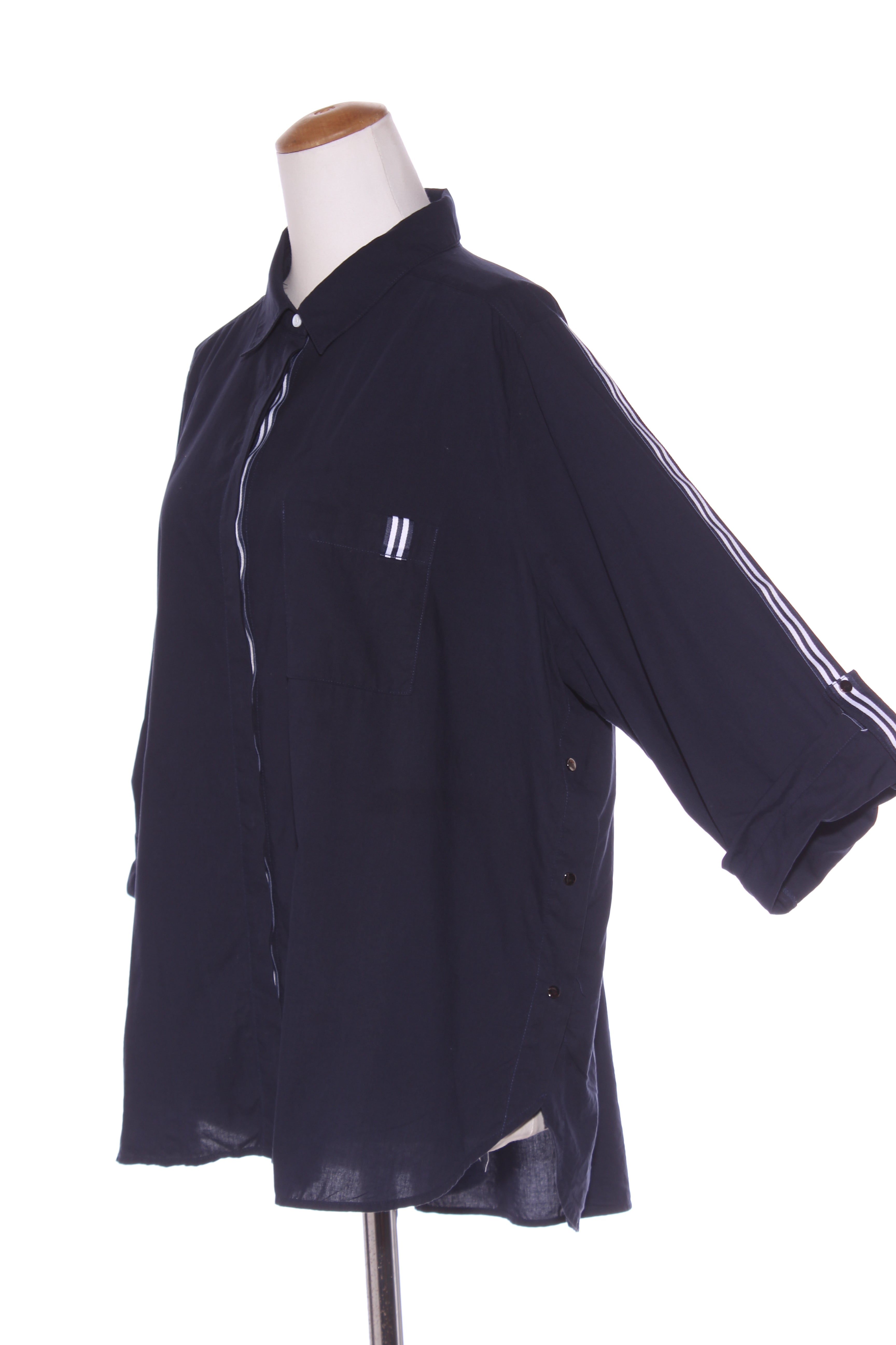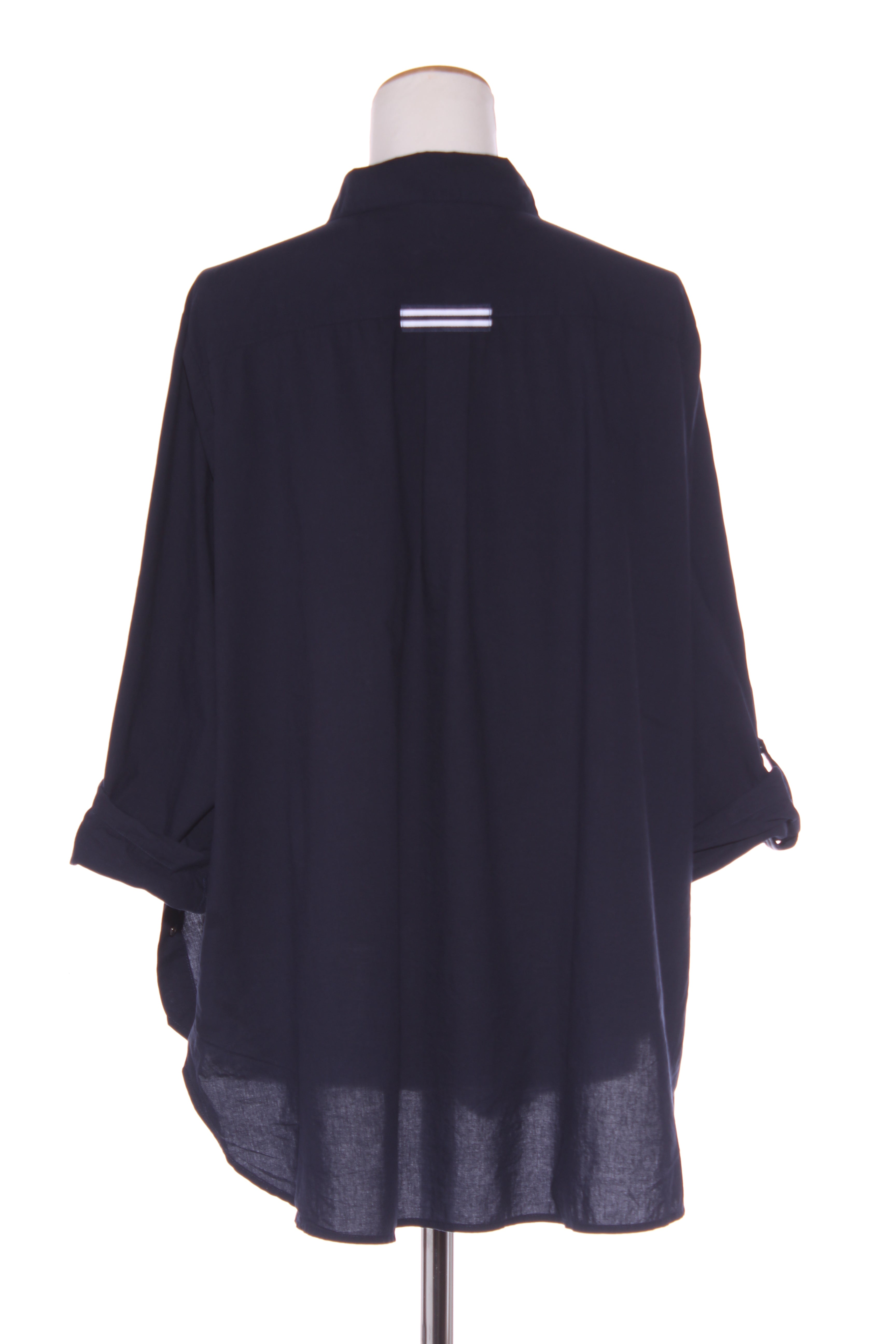 SIZE ON TAG: 14FITS LIKE: N/ACOLOUR: Washed blueFABRIC: CottonCONDITION: Excellent prelovedMEASUREMENTS:BUST: 70cms WAIST: 71cm-Free LENGTH: 68-76cmsNOTES: Cotton poplin shirt featuring striped tape trim detail beneath button...